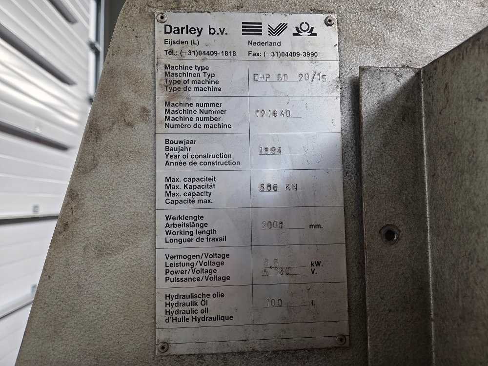 Voorzien van handmatige bombering en 1 set platdruk gereedschap; recent voorzien van nieuwe besturing en laser beveiliging Nee Merk: Darley Type: EHP 50 20/15 Bouwjaar: 1994 Serienummer: 121640 Capaciteit.: 50t Werklengte: 2100mm Aantal assen: 4 CNC-besturing, merk, type: S 630 Aansluiting: 400V