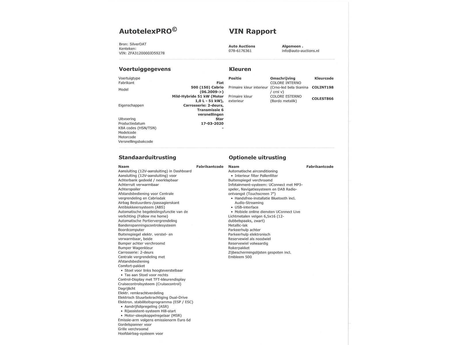 Voor vragen kunt u mailen naar info@auto-auctions.nl VIN/Chassis Number: ZFA3120000JD59278 Nee Kenteken: HJS-95-N Merk: Fiat Model: 500 C Type: 1.0 Hybrid Launch Edition Bouwjaar: 2020 Afgelezen kilometerstand: 70027km Cilinderinhoud: 999cc Vermogen (kW): 51kW Brandstof: Benzine Chassisnummer: ZFA3120000JD59278 NAP status: Undetermined Datum eerste toelating: 2020-06-12 APK vervaldatum: 2027-03-27 Vermogen (pk): 68hp Aantal zitplaatsen: 4 Kleur: rood Transmissie: Handgeschakeld Emissieklasse: 6 Aantal deuren: 3 Aantal sleutels: 1 Ledig gewicht: 955kg Bruto BPM (NL): 1680€ Rest BPM: 527€ Aantal cilinders: 3 Carrosserie: Hatchback Onderhoudshistorie: Niet Aanwezig Carfax Link: https://was.carfax.eu/v0/api/ccdid/5100016408/svc/201/vinreg/HJS95N/checksum/eyJhbGciOiJIUzI1NiIsInR5cCI6IkpXVCJ9.eyJleHAiOjE3Nzk2MTY1MTl9.ZT4NraILVHMoY_mVQCkF_3eyVeISi5iwgEqxvXTXXjA Start en rijdt: Ja
