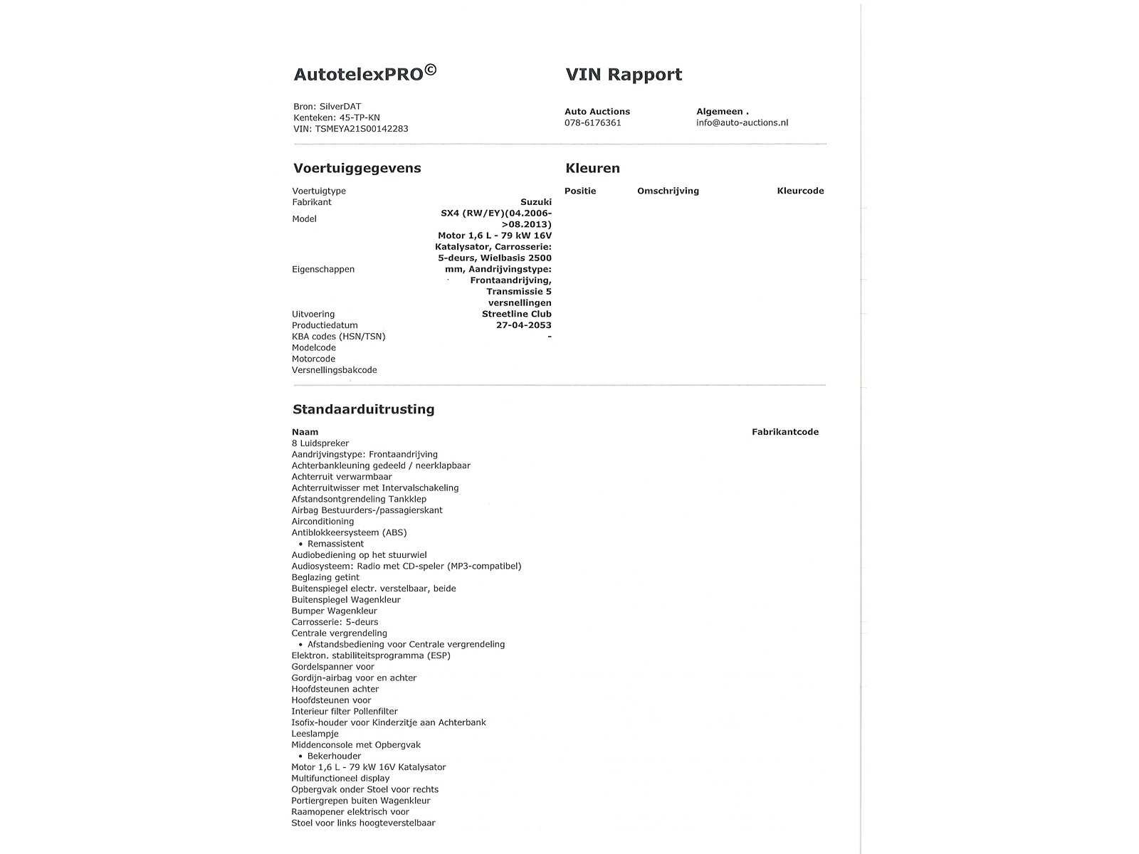 Voor vragen kunt u mailen naar info@auto-auctions.nl VIN/Chassis Number: TSMEYA21S00142283 Nee Kenteken: 45-TP-KN Merk: Suzuki Model: SX4 Type: 1.6 Exclusive Bouwjaar: 2007 Afgelezen kilometerstand: 220903km Cilinderinhoud: 1586cc Vermogen (kW): 79kW Brandstof: Benzine Chassisnummer: TSMEYA21S00142283 NAP status: Logical Datum eerste toelating: 2007-01-04 APK vervaldatum: 2027-01-04 Vermogen (pk): 106hp Aantal zitplaatsen: 5 Maximaal trekgewicht ongeremd: 1200kg Maximaal trekgewicht geremd: 400kg Kleur: blauw Transmissie: Handgeschakeld Drive type: Front wheel Emissieklasse: 4 Aantal deuren: 4 Aantal sleutels: 2 Ledig gewicht: 1105kg Bruto BPM (NL): 3948€ Aantal cilinders: 4 Carrosserie: Hatchback Onderhoudshistorie: Niet Aanwezig Carfax Link: https://was.carfax.eu/v0/api/ccdid/5100016408/svc/201/vinreg/45TPKN/checksum/eyJhbGciOiJIUzI1NiIsInR5cCI6IkpXVCJ9.eyJleHAiOjE3ODIwNTE5MTN9.Tt38f4cdCHcFXia6ZUnTPIOPOyvoSjdtjI6_VZPHIjs Start en rijdt: Ja