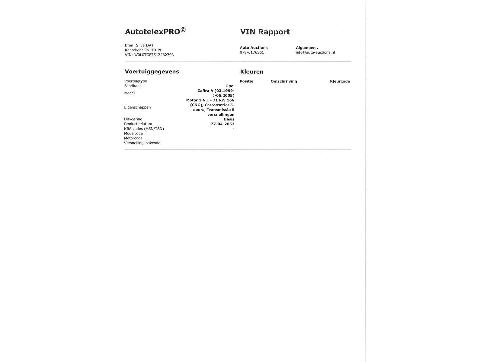 Voor vragen kunt u mailen naar info@auto-auctions.nl VIN/Chassis Number: W0L0TGF7512262703 Nee Kenteken: 96-HD-PH Merk: Opel Model: Zafira Type: 2.2-16V Elegance Bouwjaar: 2001 Afgelezen kilometerstand: 287827km Cilinderinhoud: 2198cc Vermogen (kW): 108kW Brandstof: Benzine Chassisnummer: W0L0TGF7512262703 NAP status: Logical Datum eerste toelating: 2001-06-02 APK vervaldatum: 2027-05-03 Vermogen (pk): 145hp Aantal zitplaatsen: 7 Maximaal trekgewicht ongeremd: 1400kg Maximaal trekgewicht geremd: 600kg Kleur: groen Transmissie: Automaat Drive type: Front wheel Emissieklasse: 4 Aantal deuren: 4 Aantal sleutels: 2 Ledig gewicht: 1395kg Bruto BPM (NL): 6527€ Aantal cilinders: 4 Carrosserie: Stationwagen Onderhoudshistorie: Geedetelijk Aanwezig Carfax Link: https://was.carfax.eu/v0/api/ccdid/5100016408/svc/201/vinreg/96HDPH/checksum/eyJhbGciOiJIUzI1NiIsInR5cCI6IkpXVCJ9.eyJleHAiOjE3ODIwNDc1ODZ9.yoDFdmq0XNL9hOq1wCuKswHEtj3csrhQDdSobYQlO3c Start en rijdt: Ja