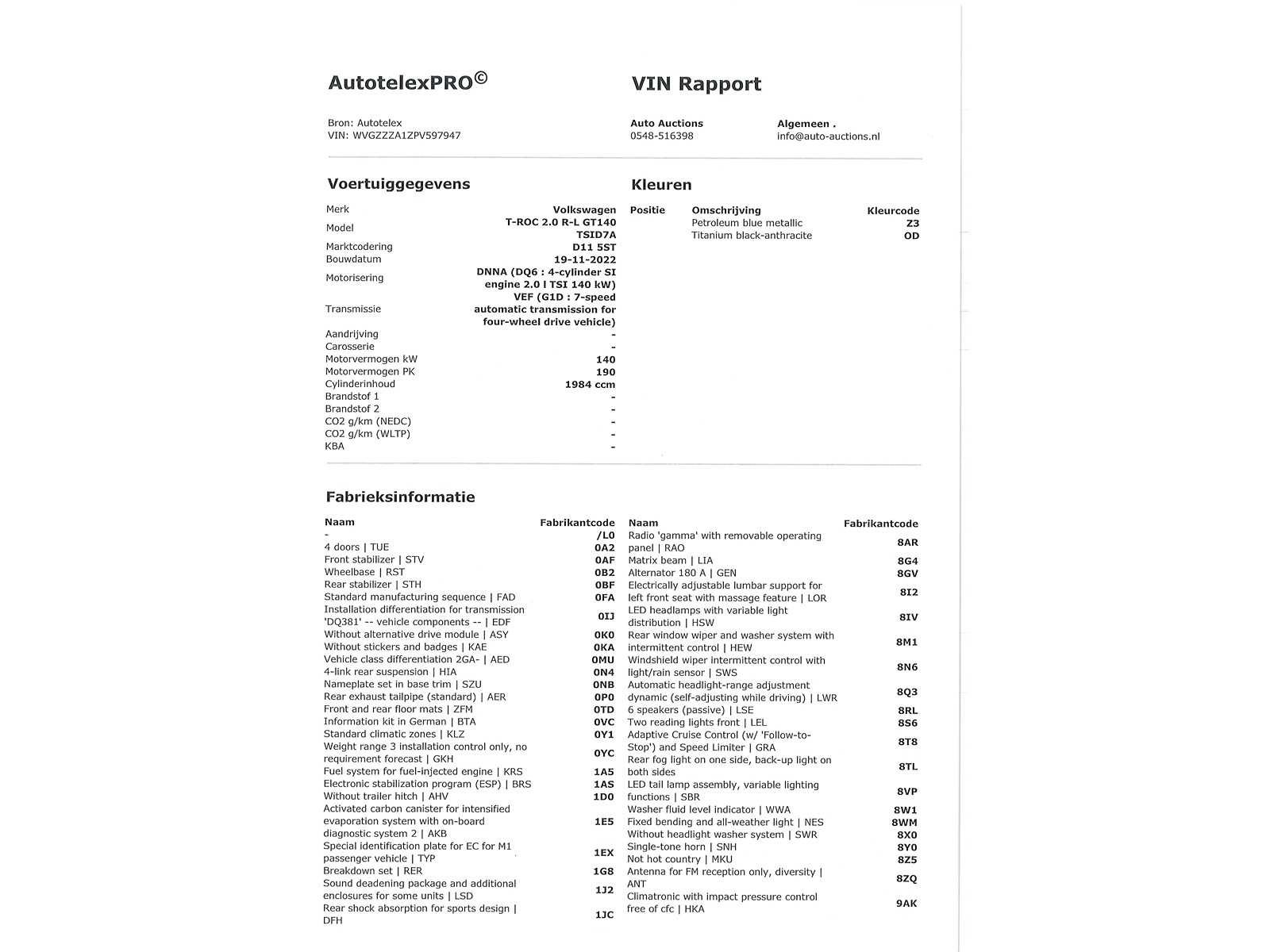 Duitse kenteken papieren. Indien gewenst kunnen wij het gehele import proces voor u verzorgen, RDW invoer, BPM taxatie, Douane afwikkeling, stalling etc. Voor deze auto zijn de totale invoerkosten inclusief de BPM €5450.- Dus voor €5450.- boven op uw aankoopprijs verzorgen wij het NL kenteken voor u. (This option is only for Dutch buyers) Voor vragen kunt u mailen naar info@auto-auctions.nl Nee Kenteken: Duitse Kenteken Papieren Merk: Volkswagen Model: T-Roc R-line Type: 2.0 TSI 4Motion Afgelezen kilometerstand: 99148km Cilinderinhoud: 1984cc Vermogen (kW): 140kW Brandstof: Benzine Chassisnummer: WVGZZZA1ZPV597947 Datum eerste toelating: 7-2-2023 Vermogen (pk): 190hp Aantal zitplaatsen: 5 Kleur: Petrol Blue Metallic Transmissie: Automaat Drive type: Vierwiel Aantal deuren: 5 Aantal sleutels: 2 Aantal cilinders: 4 Carrosserie: SUV Nationaliteit documenten: Duitse Kenteken Papieren Onderhoudshistorie: Digitaal Volledig Aanwezig Start en rijdt: Ja