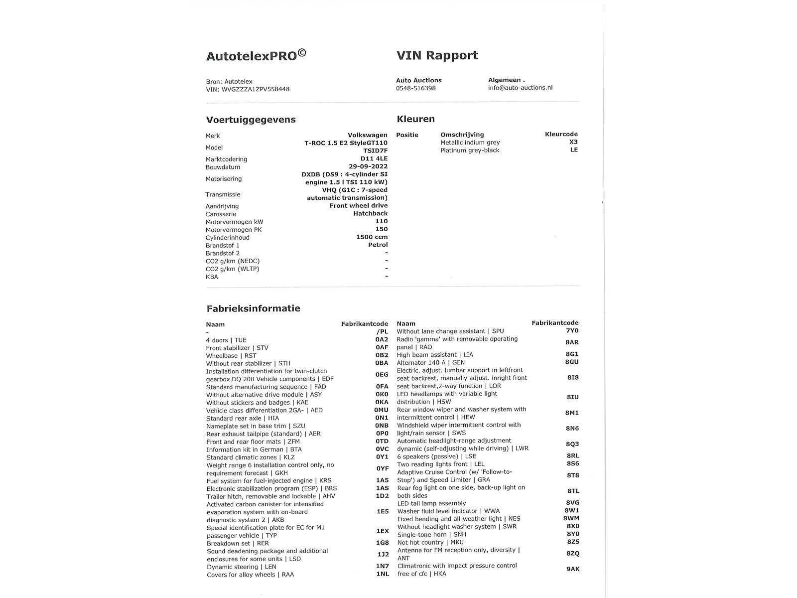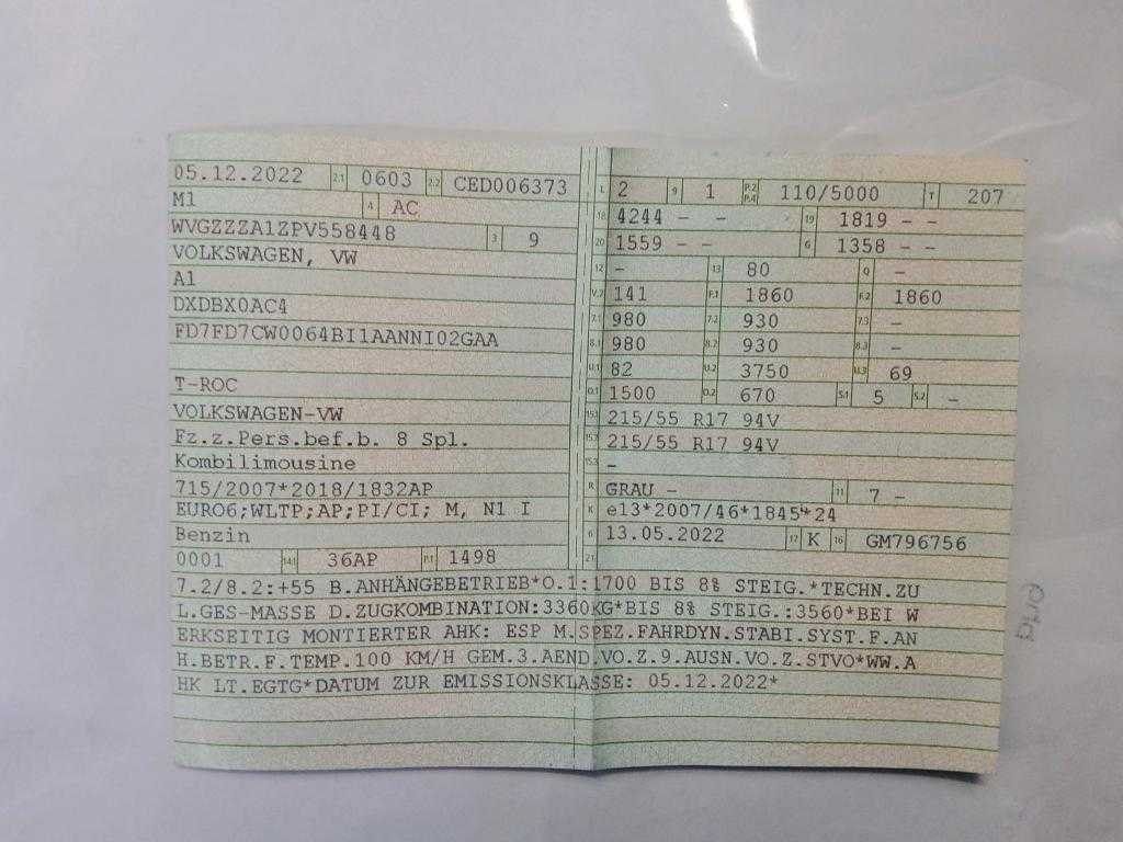 Duitse Kenteken papieren. Indien gewenst kunnen wij het gehele import proces voor u verzorgen, RDW invoer, BPM taxatie, Douane afwikkeling, stalling etc. Voor deze auto zijn de totale invoerkosten inclusief de BPM €2.950.- Dus voor €2.950.- boven op uw aankoopprijs verzorgen wij het NL kenteken voor u. (This option is only for Dutch buyers) Voor vragen kunt u mailen naar info@auto-auctions.nl Nee Kenteken: Duitse Kenteken Papieren Merk: Volkswagen Model: T-Roc Type: 1.5 TSI Afgelezen kilometerstand: 50348km Cilinderinhoud: 1498cc Vermogen (kW): 110kW Brandstof: Benzine Chassisnummer: WVGZZZA1ZPV558448 Datum eerste toelating: 05-12-2022 Vermogen (pk): 150hp Aantal zitplaatsen: 5 Kleur: Indium Grey Metallic Transmissie: Automaat Aantal deuren: 5 Aantal sleutels: 2 Velgmaat: 17 Aantal cilinders: 4 Carrosserie: SUV Nationaliteit documenten: Duitse Kenteken Papieren Onderhoudshistorie: Digitaal Volledig Aanwezig Start en rijdt: Ja