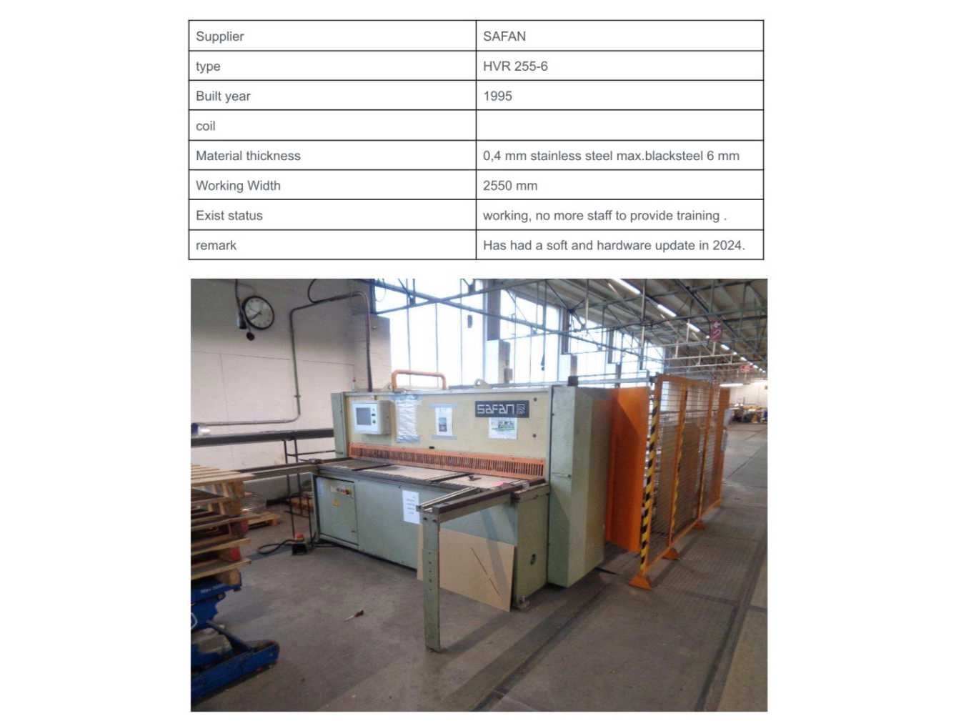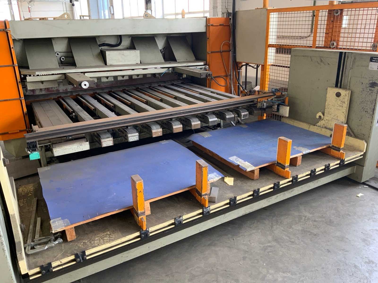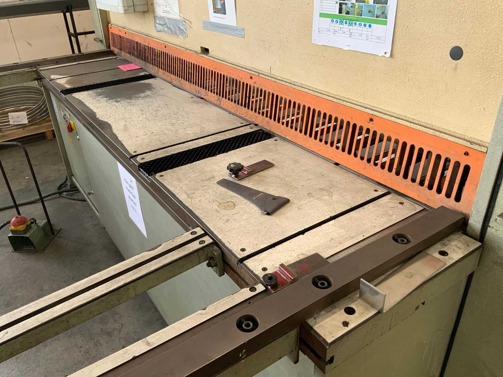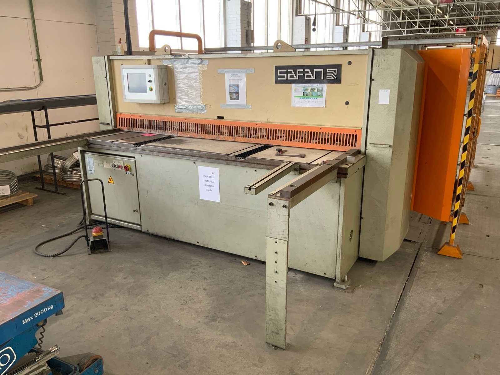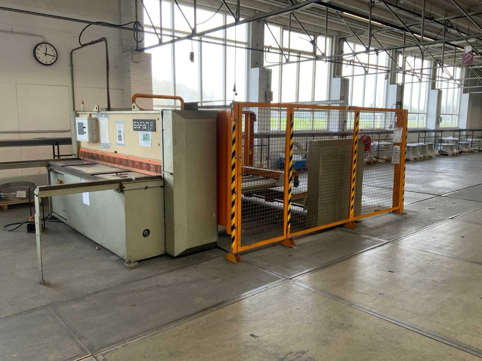 Aanslag lengte: 1400 / 3150mm , voorzien van opnametafel met uitvoersysteem , 1 THEIS ST2501/4/0 automatische stapelaar, , 1 bedieningsconsole. inclusief veiligheidshekwerk Nee Merk: Safan Type: HVR 255-6 Bouwjaar: 1995 Serienummer: B 8164 Snijlengte: 2550mm Max. plaatdikte: 6mm Achteraanslag bereik: 1000mm Besturing, merk, type: Cybelec CybTouch 12 touchscreen Motorvermogen (kW): 11kW Aansluiting: 380V Machinegewicht: 5200kg Afmeting l: 7600mm Afmeting b: 4200mm Afmeting h: 2100mm