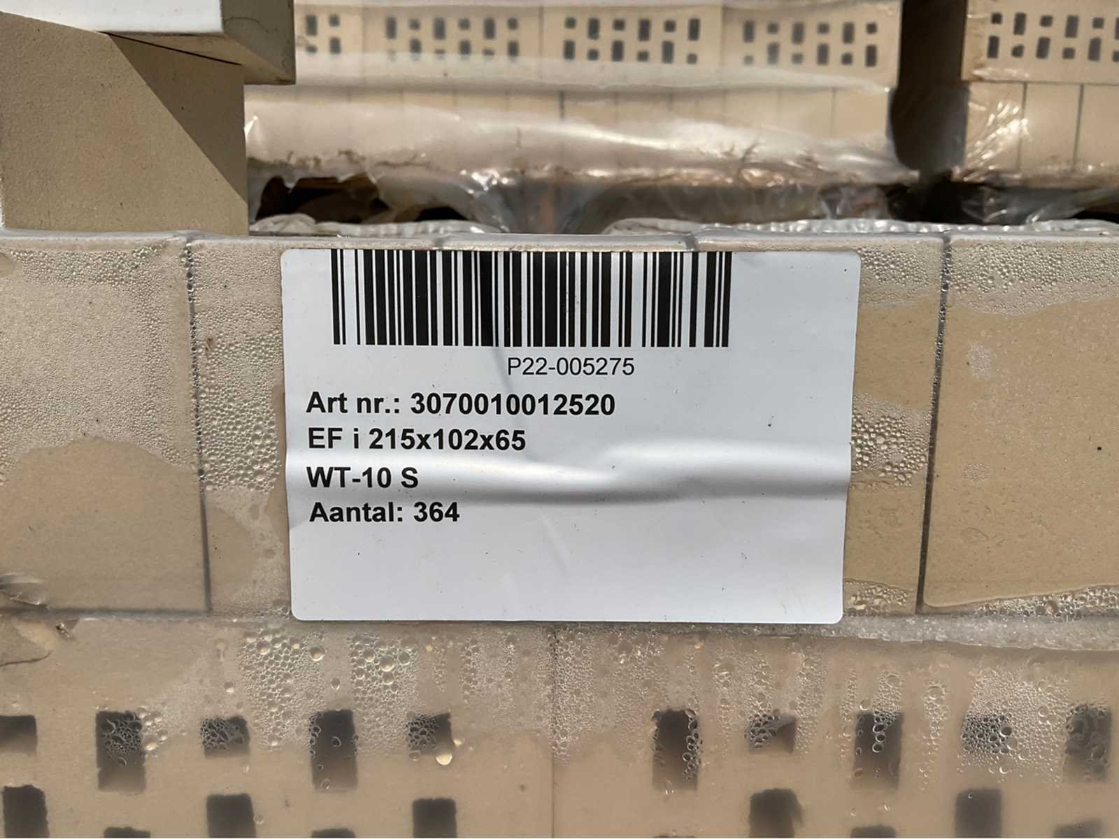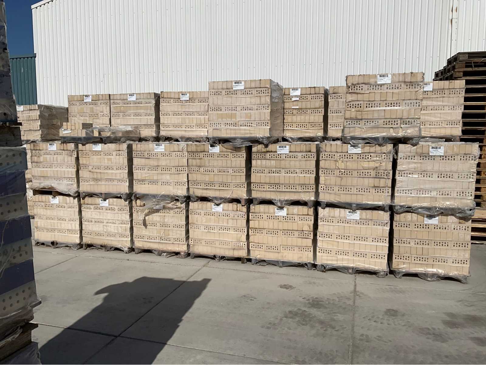 Circa 120 pallets geglazuurde bakstenen, eenzijdig verglaasd. No Merk: Wienerberger Model: Strengpers Product type: Strengpers bakstenen Oppervlakte: 733m² Afwerking: Geglazuurd Aantal m² per verpakking: 6.06m² Kleur: Wit Lengte: 21.5cm Breedte: 10.2cm Hoogte: 6.5cm Materiaal: Steen