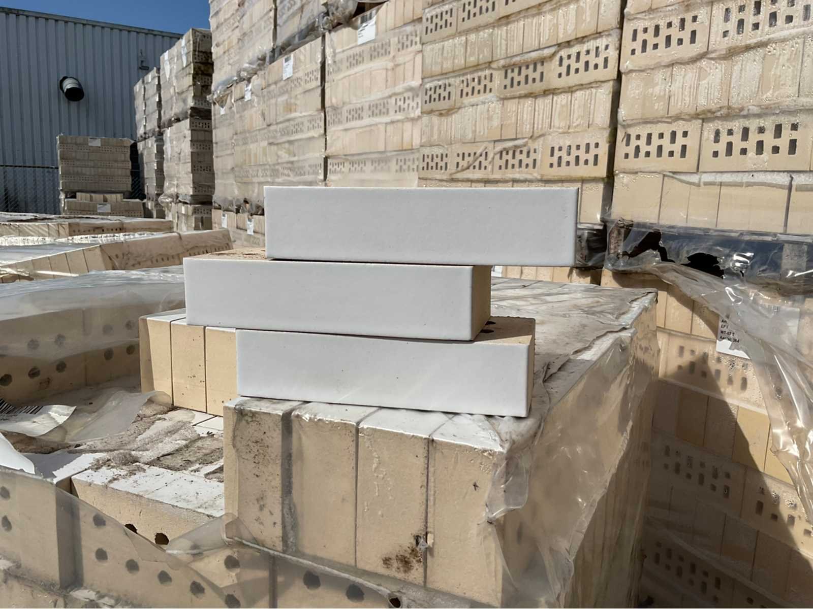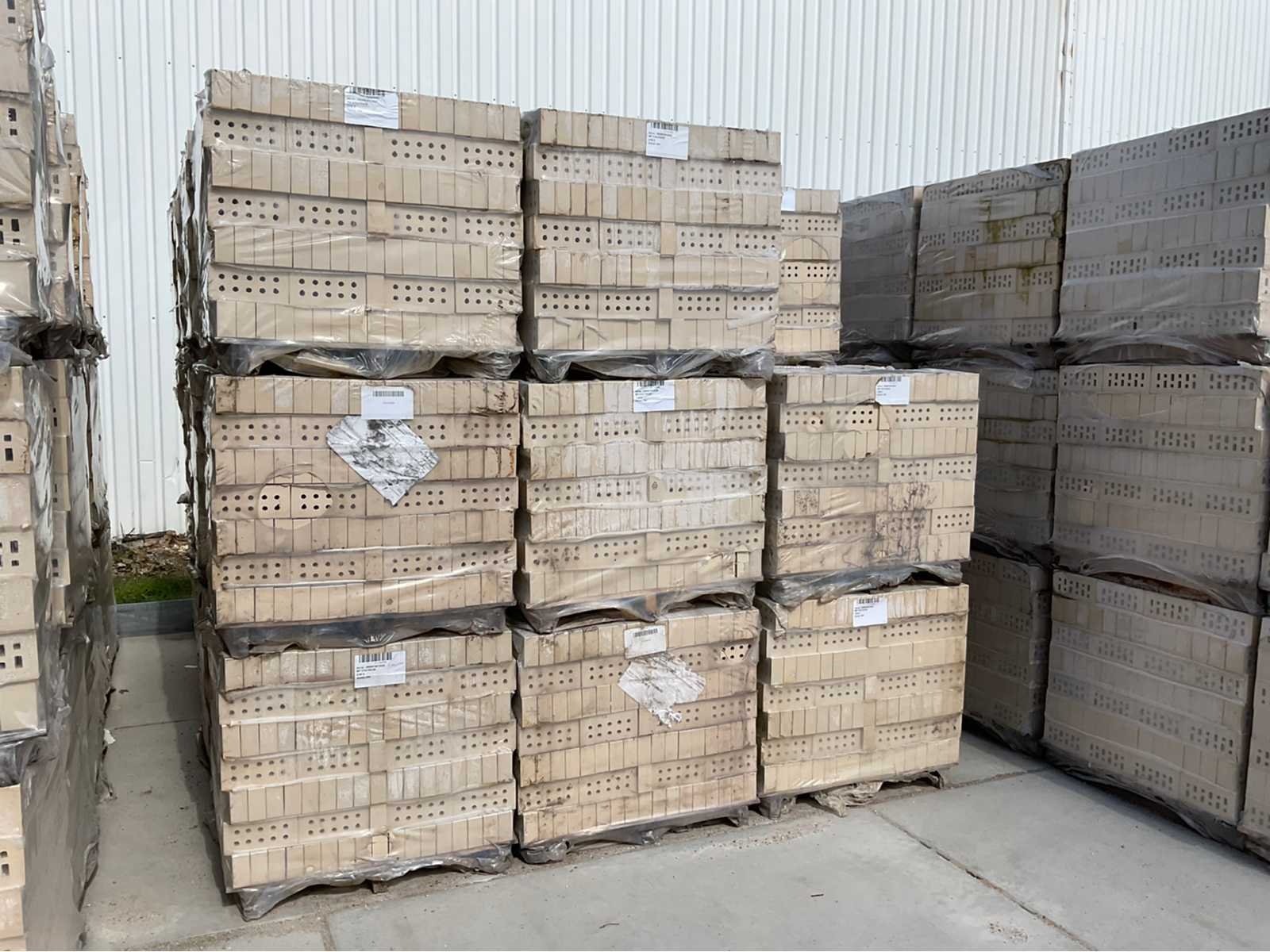 Circa 40 pallets geglazuurde bakstenen, eenzijdig verglaasd. No Merk: Wienerberger bakstenen Model: Strengpers Product type: Strengpers bakstenen Oppervlakte: 265m² Aantal m² per verpakking: 6.72m² Kleur: Wit Lengte: 20cm Breedte: 10cm Hoogte: 5cm Materiaal: Steen