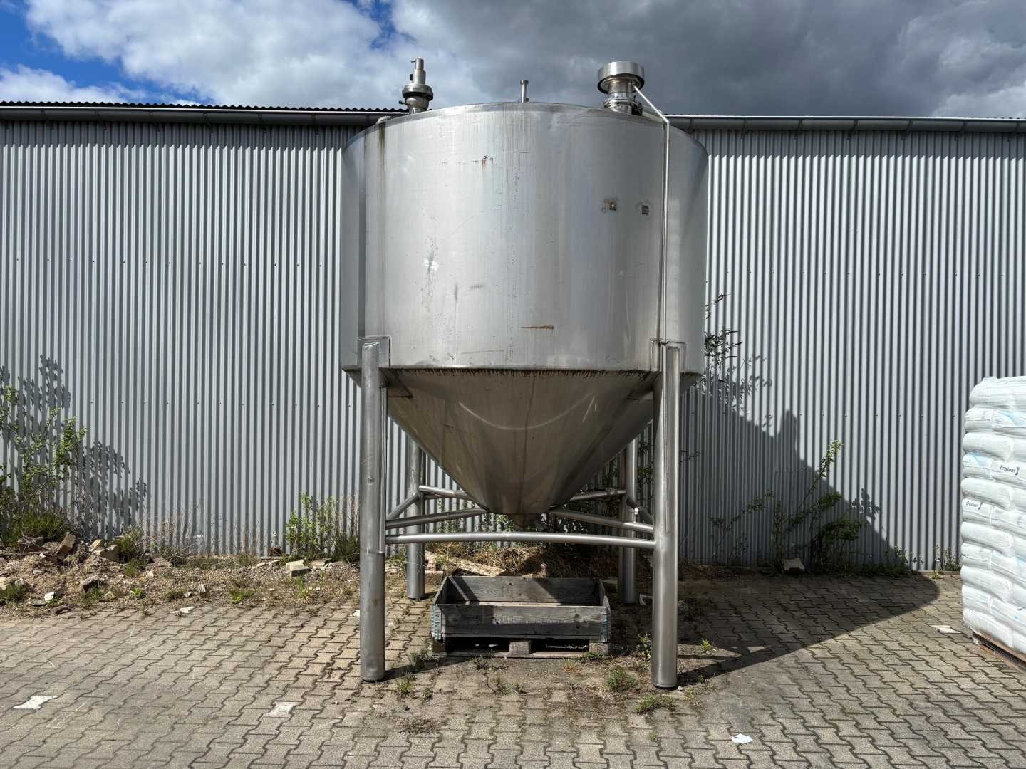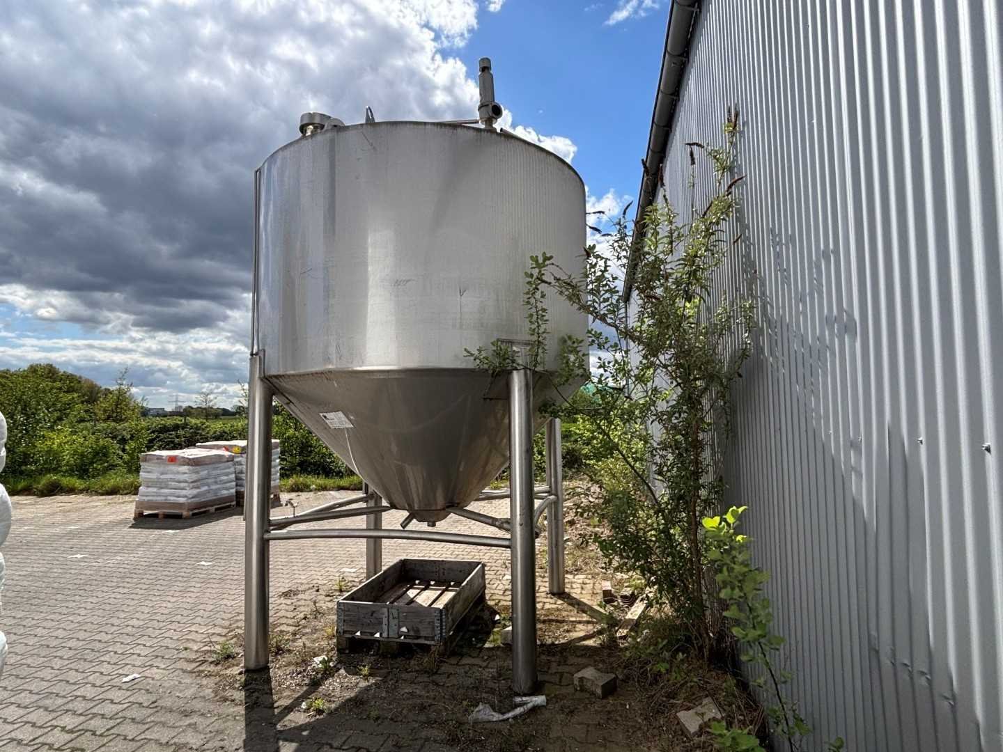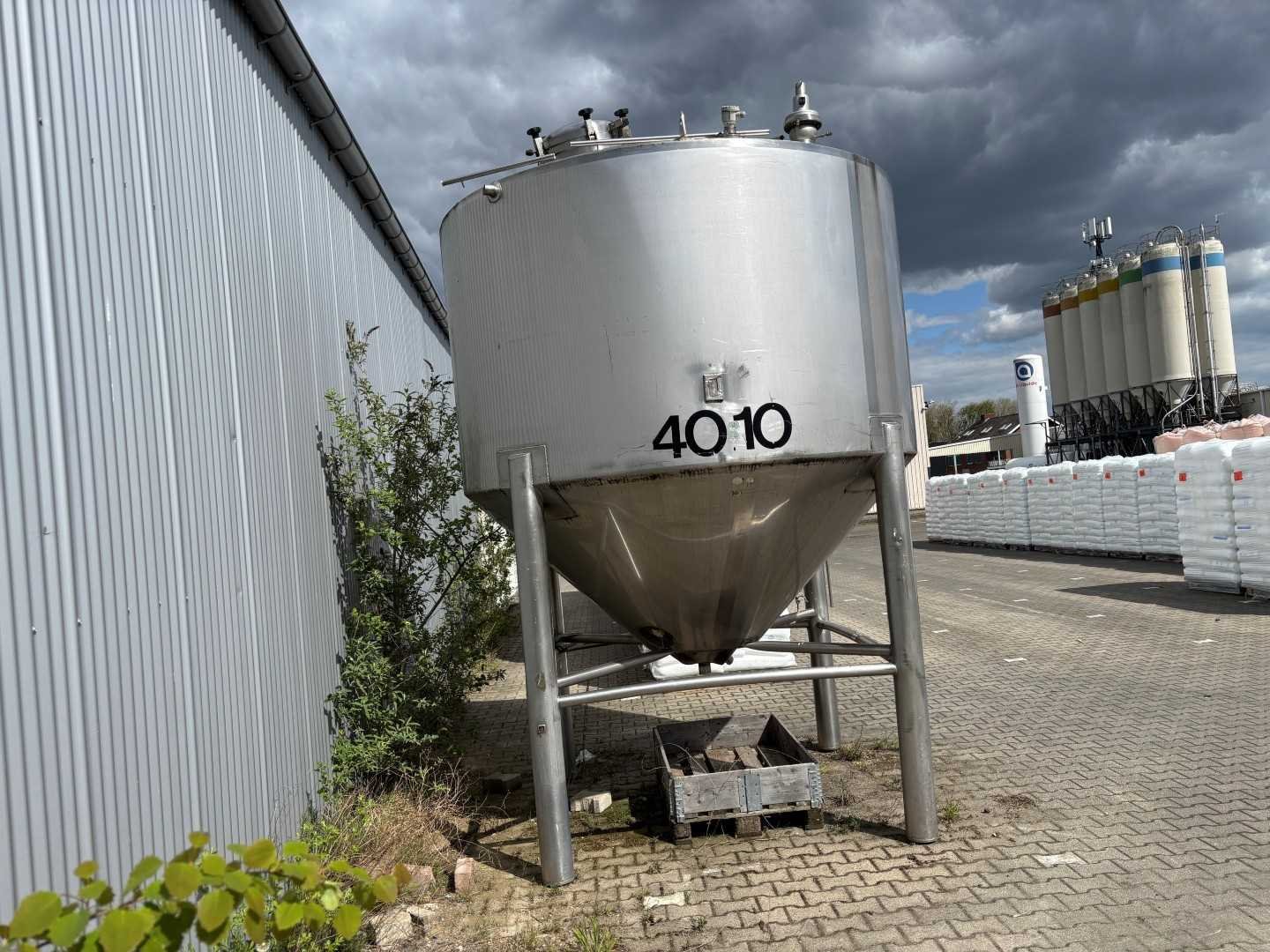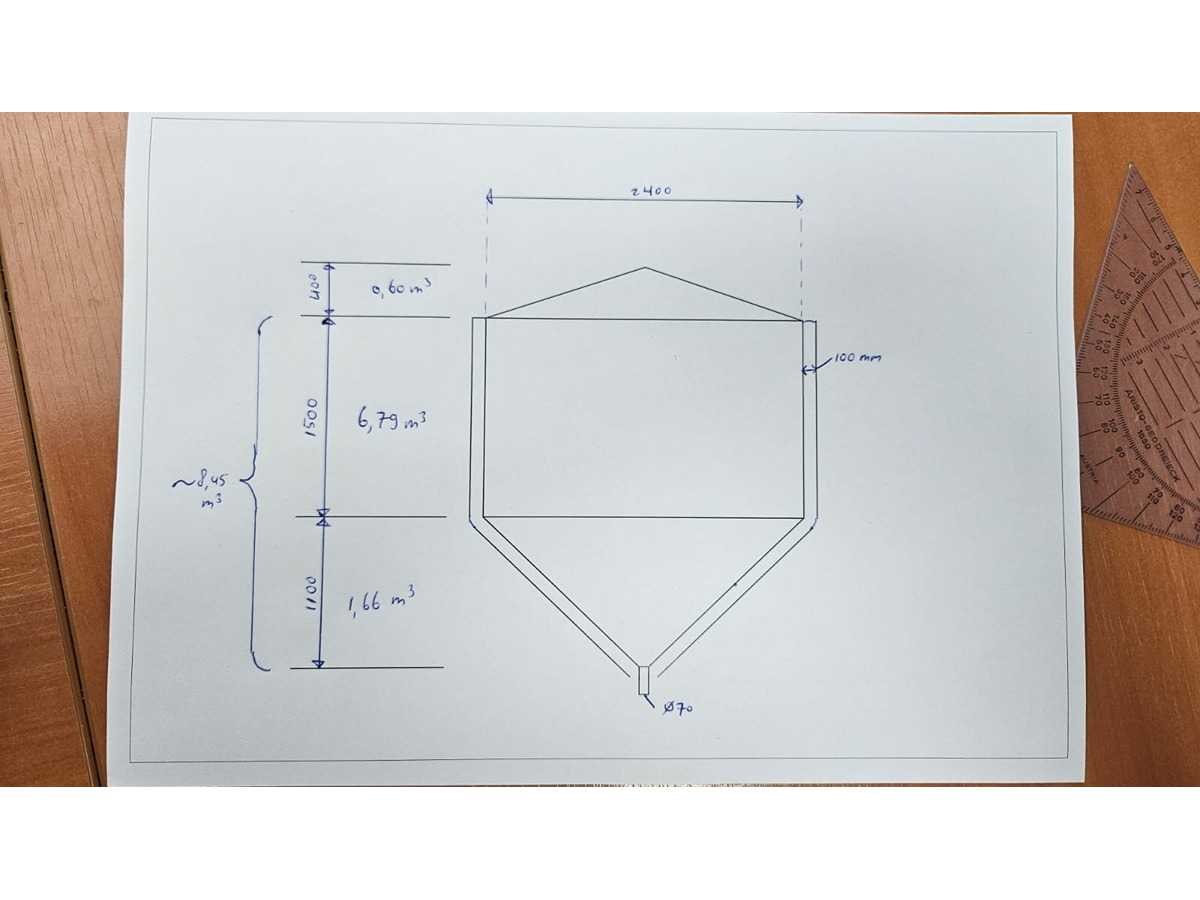 Voorzien van: RVS dubbelwandige opslagsilo ± 9,05 m³, conische bodem – Ø 2.400 mm, bouwjaar: 1987, serienummer: 200-450-307/154, max. bedrijfsdruk: 3 bar, max. bedrijfstemperatuur: 200°C, keur: TÜV DB 81/2, RVS staande opslagsilo met conische bodem, geplaatst op vier RVS poten, diameter: 2.400 mm, cilindrische hoogte: 1.500 mm, conus hoogte: 1.100 mm, bovendeel (kap): ca. 0,60 m³, totale inhoud: ± 9,05 m³, uitloop: Ø 70 mm, mangatdeksel met knevelsluitingen, ontluchting / veiligheidsventiel aanwezig, staand model op 4 poten totale hoogte 4070mm. Nee Merk: LKM Bouwjaar: 1987 Serienummer: 200-450-307/154 Verticaal: true Inhoud: 9000l Totale afmeting L: 2650mm Totale afmeting Breedte: 2650mm Totale afmeting Hoogte: 4100mm