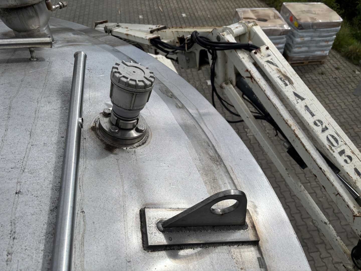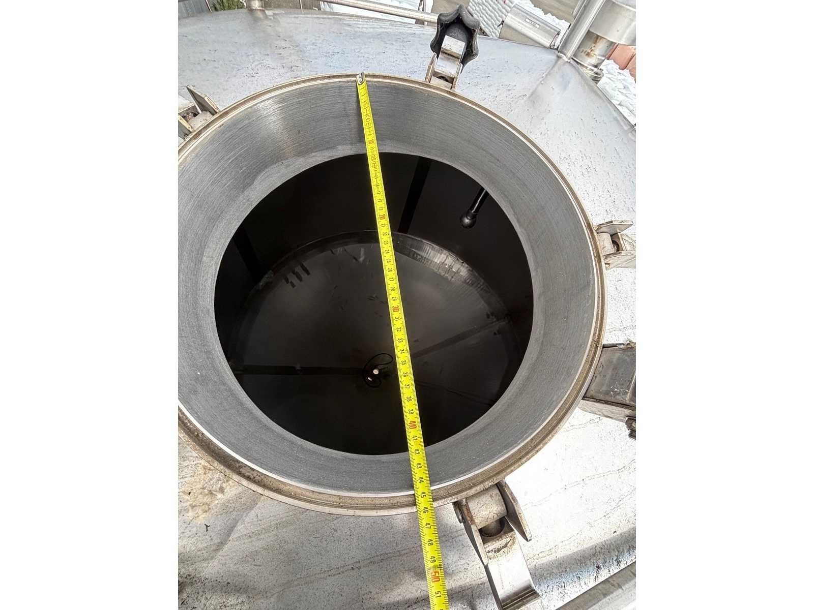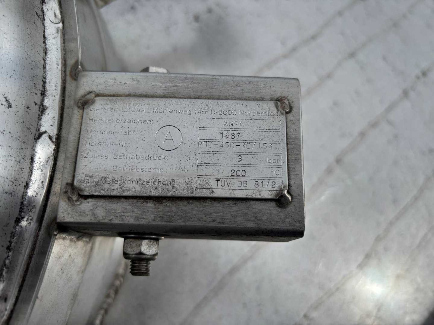 Voorzien van: RVS dubbelwandige opslagsilo ± 9,05 m³, conische bodem – Ø 2.400 mm, bouwjaar: 1987, serienummer: 200-450-307/154, max. bedrijfsdruk: 3 bar, max. bedrijfstemperatuur: 200°C, keur: TÜV DB 81/2, RVS staande opslagsilo met conische bodem, geplaatst op vier RVS poten, diameter: 2.400 mm, cilindrische hoogte: 1.500 mm, conus hoogte: 1.100 mm, bovendeel (kap): ca. 0,60 m³, totale inhoud: ± 9,05 m³, uitloop: Ø 70 mm, mangatdeksel met knevelsluitingen, ontluchting / veiligheidsventiel aanwezig, staand model op 4 poten totale hoogte 4070mm. Nee Merk: LKM Bouwjaar: 1987 Serienummer: 200-450-307/154 Verticaal: true Inhoud: 9000l Totale afmeting L: 2650mm Totale afmeting Breedte: 2650mm Totale afmeting Hoogte: 4100mm