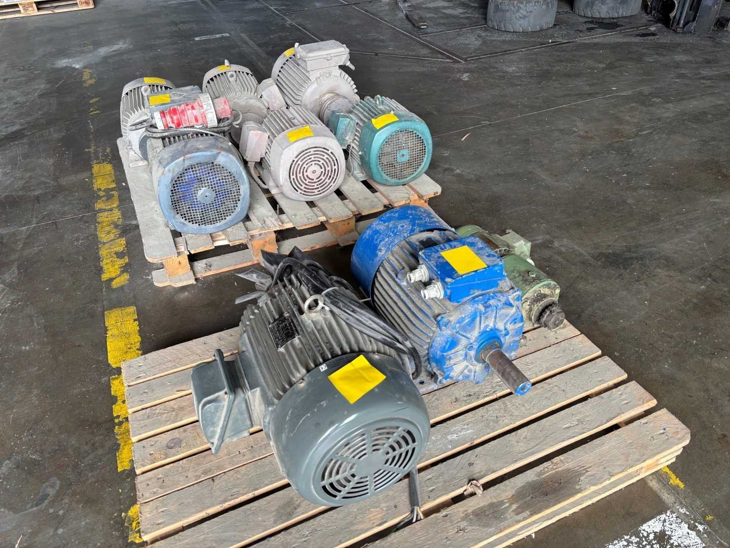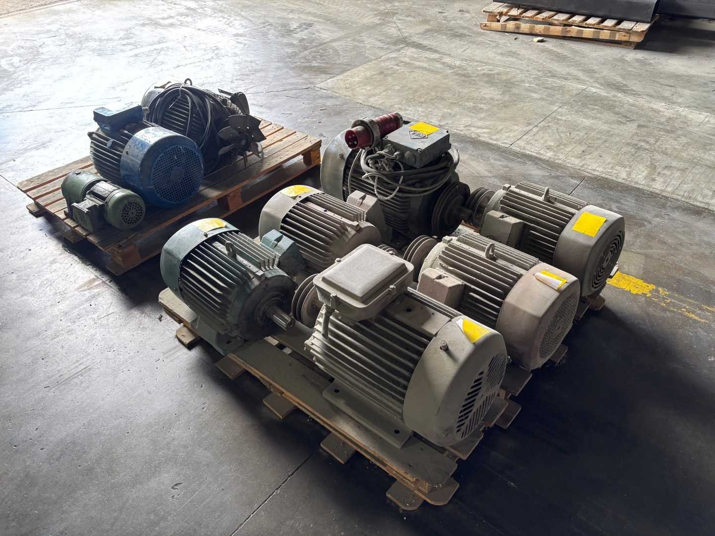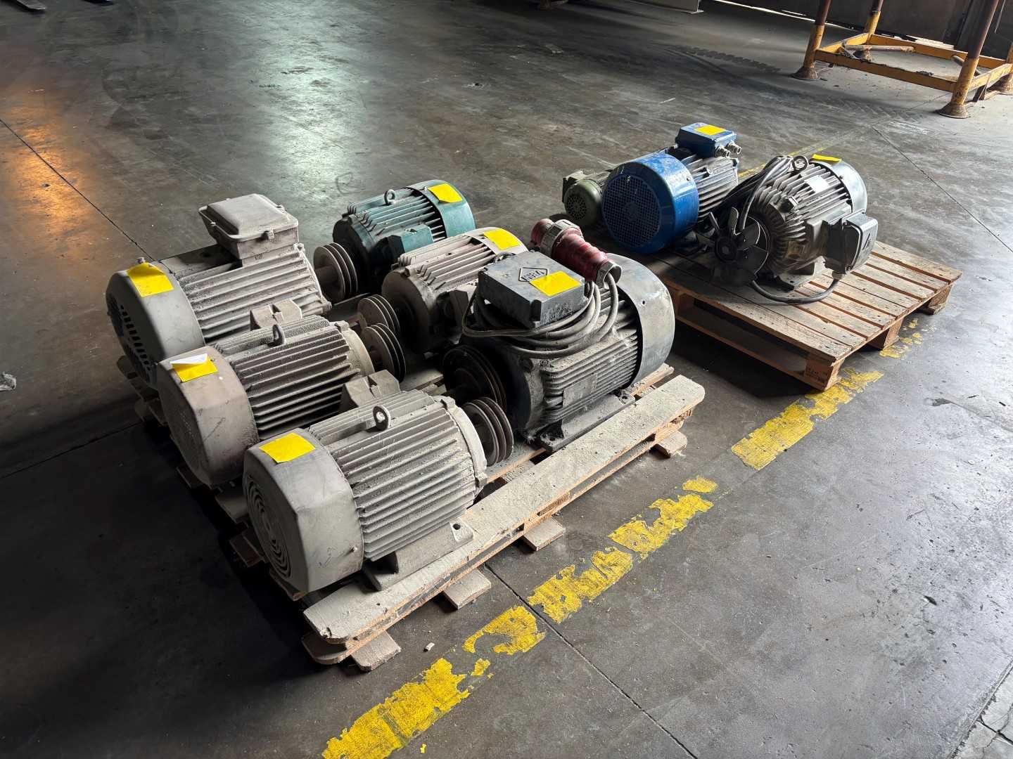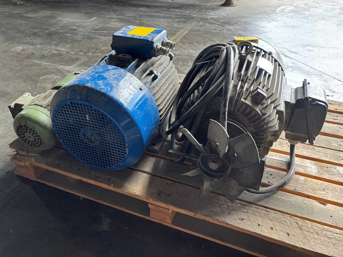 Bestaat uit: partij elektromotoren – 3-fase – diverse vermogens, inductiemotoren, diverse merken en vermogens, TEC Electric, Elektrim S.A., MEZ Mohelnice, P.W. Koolen (Breda), VEM Motors (Made in Germany), 380–415V / 400V / 690V, vermogens o.a.: 5,5 kW, 7,5 kW, 11 kW, 15 HP (≈11 kW), toerentallen: ± 1450 rpm, ± 2900 rpm, IP55 uitvoeringen aanwezig, diverse flens- en voetuitvoeringen, enkele motoren met stekker/kabel, sommige voorzien van poelies, gereed voor transport op 2 pallets. No