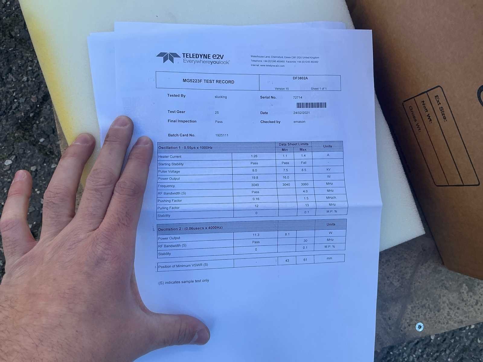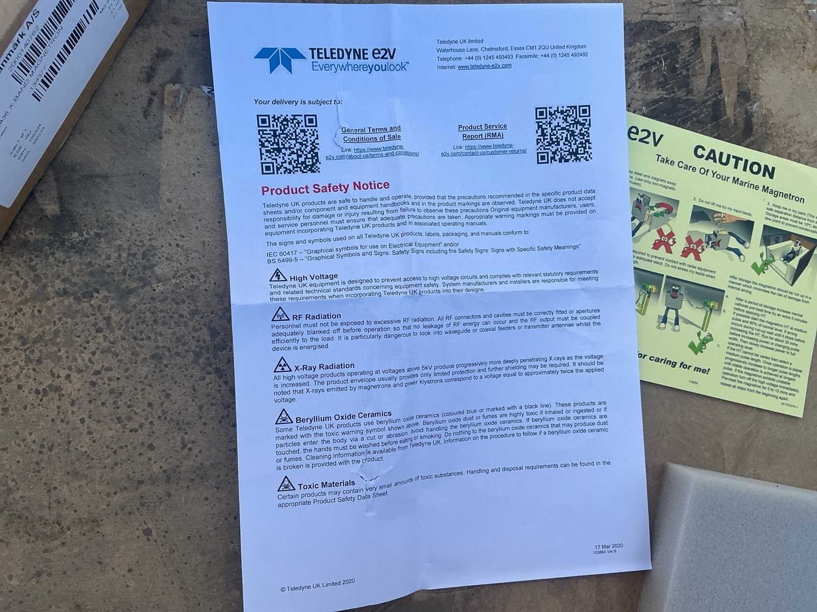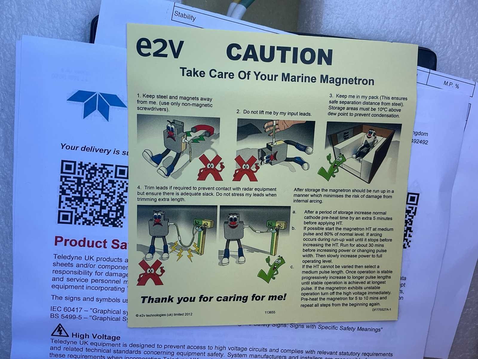 Merk: Teledyne e2v / Furuno Danmark A/S Type: MG5436 X-Band Magnetron Serienummer: 134377 Toepassing: Maritieme radar (X-band) Documentatie: Test record aanwezig (2021, PASS) radar assembly (losse unit in doos) Merk: Teledyne e2v Type: MG5436 (zelfde serie) Configuratie: Magnetron met montagebeugel/coil Conditie: Nieuw / ongebruikt (verpakt) Accessoires: Bekabeling + behuizing aanwezig Nee Merk: Teledyne