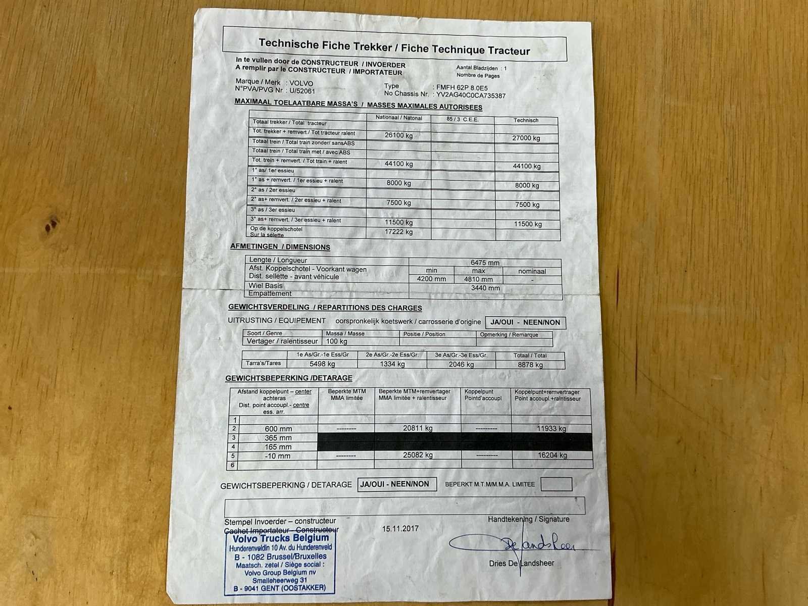 No Merk: Volvo Type: FH 6x2 XXL Bouwjaar: 2012 Chassisnummer VIN: YV2AG40C0CA735387(01) Datum eerste toelating: 13/09/2012 Type transmissie: Handmatig Aantal assen: 3 Asconfiguratie: 6x2 Fuel Type: Diesel Laadvermogen: 39000kg Aantal sleutels: 1 Emissieklasse: 5 Slaapcabine: true Eigen gewicht: 8878kg Startinformatie: Start en rijdt Kentekenpapieren compleet?: true Aantal zitplaatsen: 2 Zelf rijdend exporteren: Mogelijk Handgeschakelde versnellingsbak: true Diesel: true