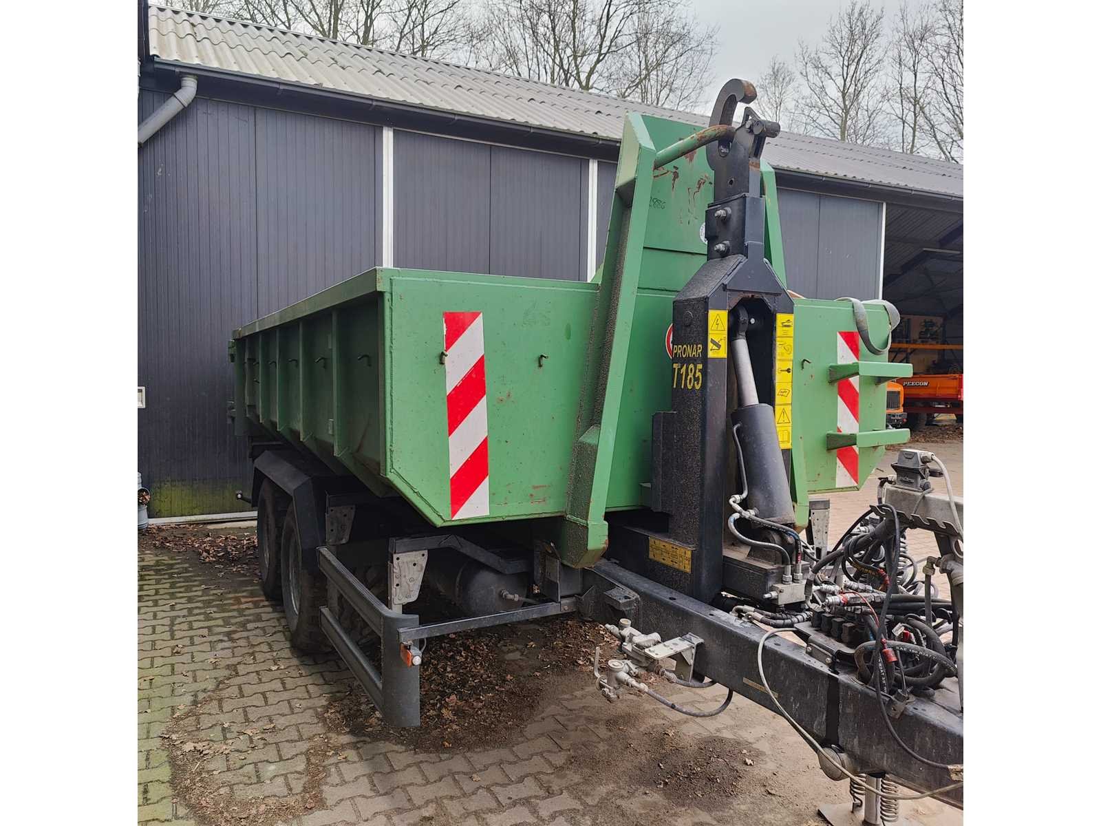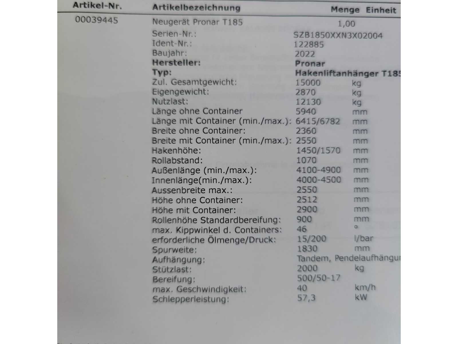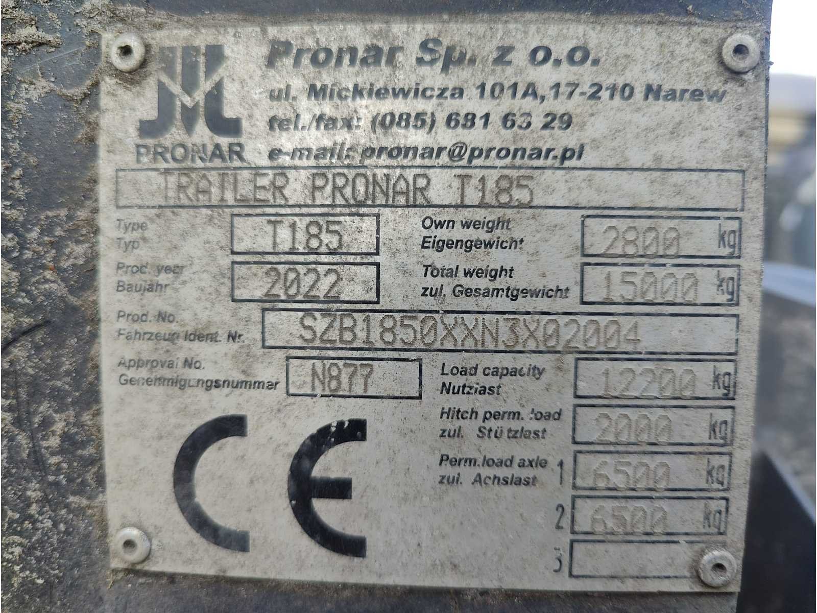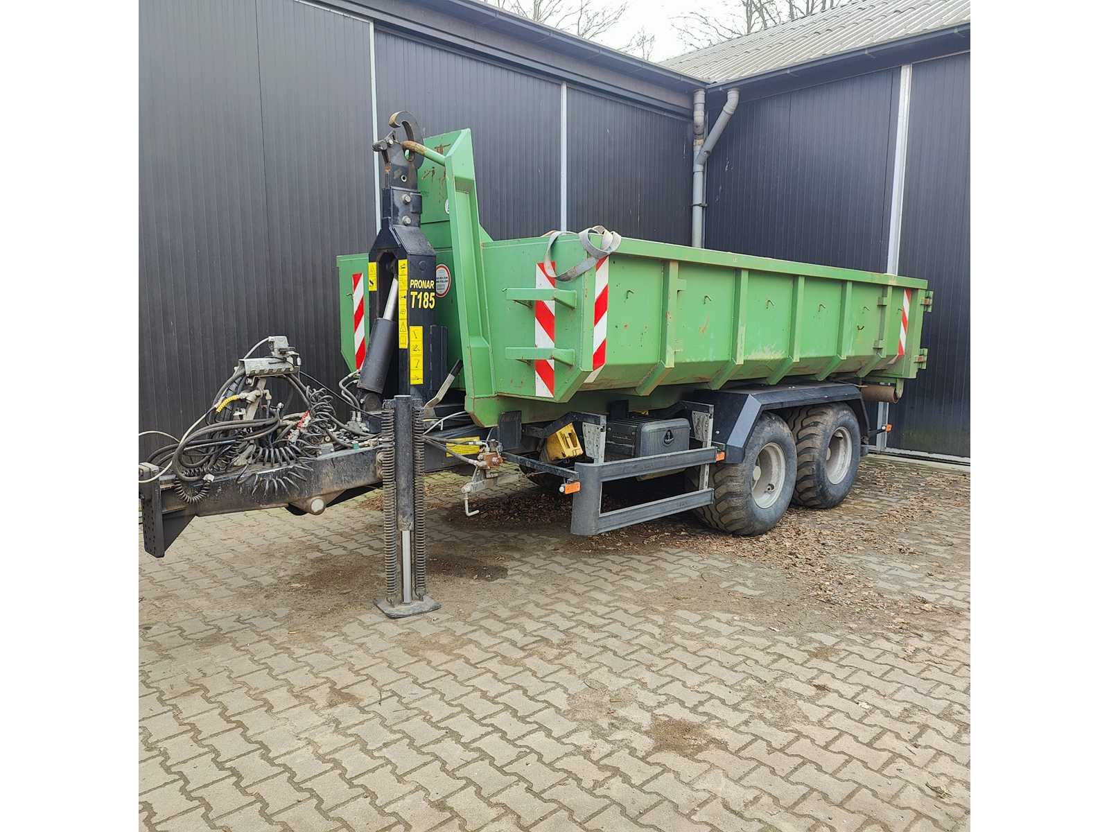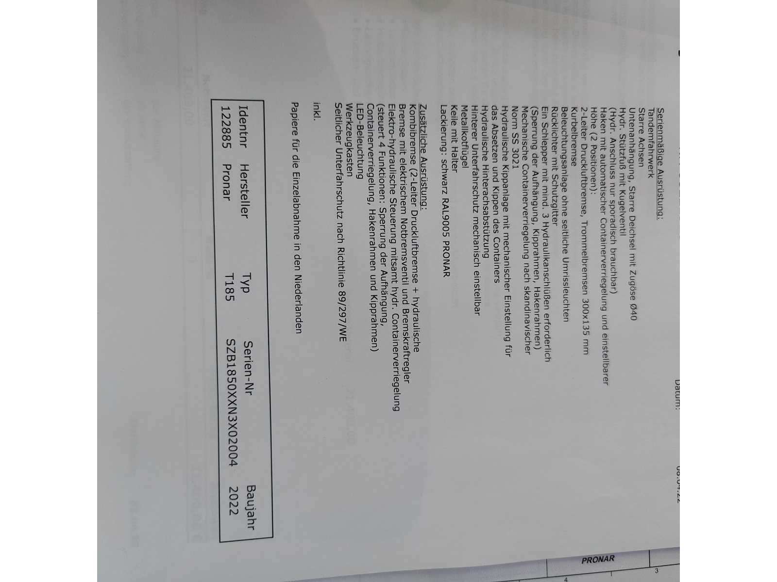 Max totaal gewicht 15.000 kilo. Laad capaciteit 12.200 kilo. 1x container 2022 20m³ , 1x container 2022 8m³ , 1x container 20m³ , 1x container 7m³ deze container is voorzien van een Atlas kraan (gereviseerd in 2025). 40km/u. Voorzien van luchtdrukremmen Nee Merk: Pronar Type: T185 Bouwjaar: 2022 Serienummer: SZB1850XXN3X02004 Eigen gewicht: 2800kg Totale afmeting L: 5950mm Totale afmeting Breedte: 2360mm Totale afmeting Hoogte: 1570mm