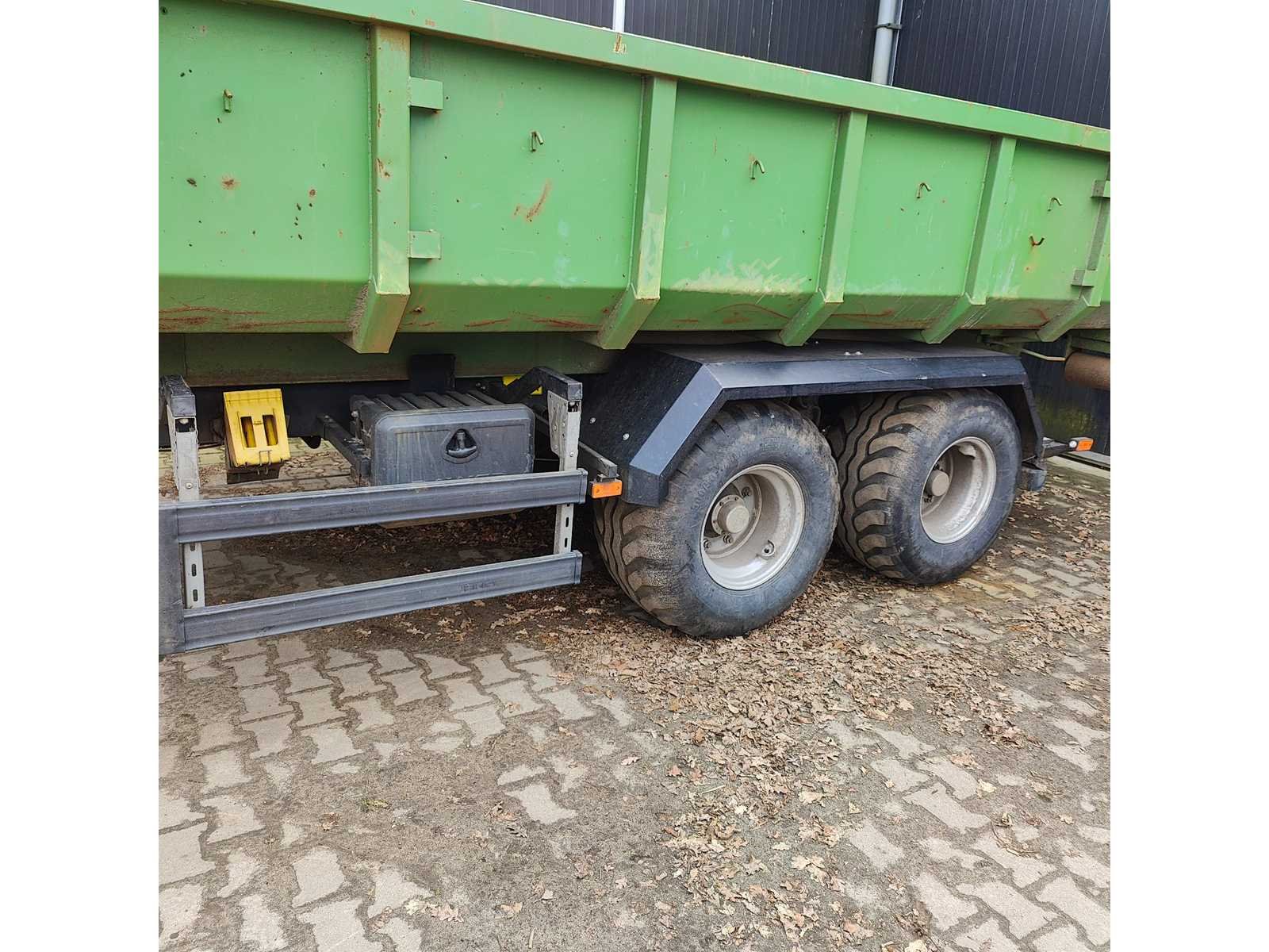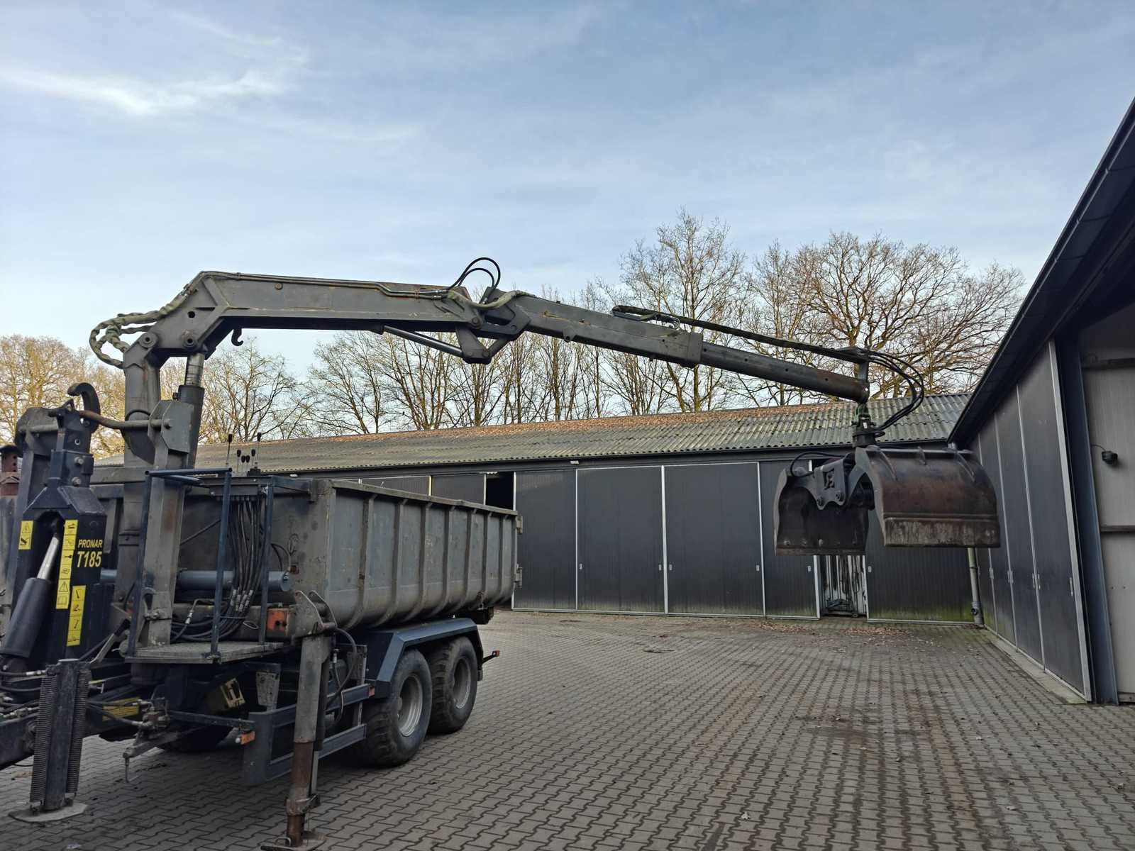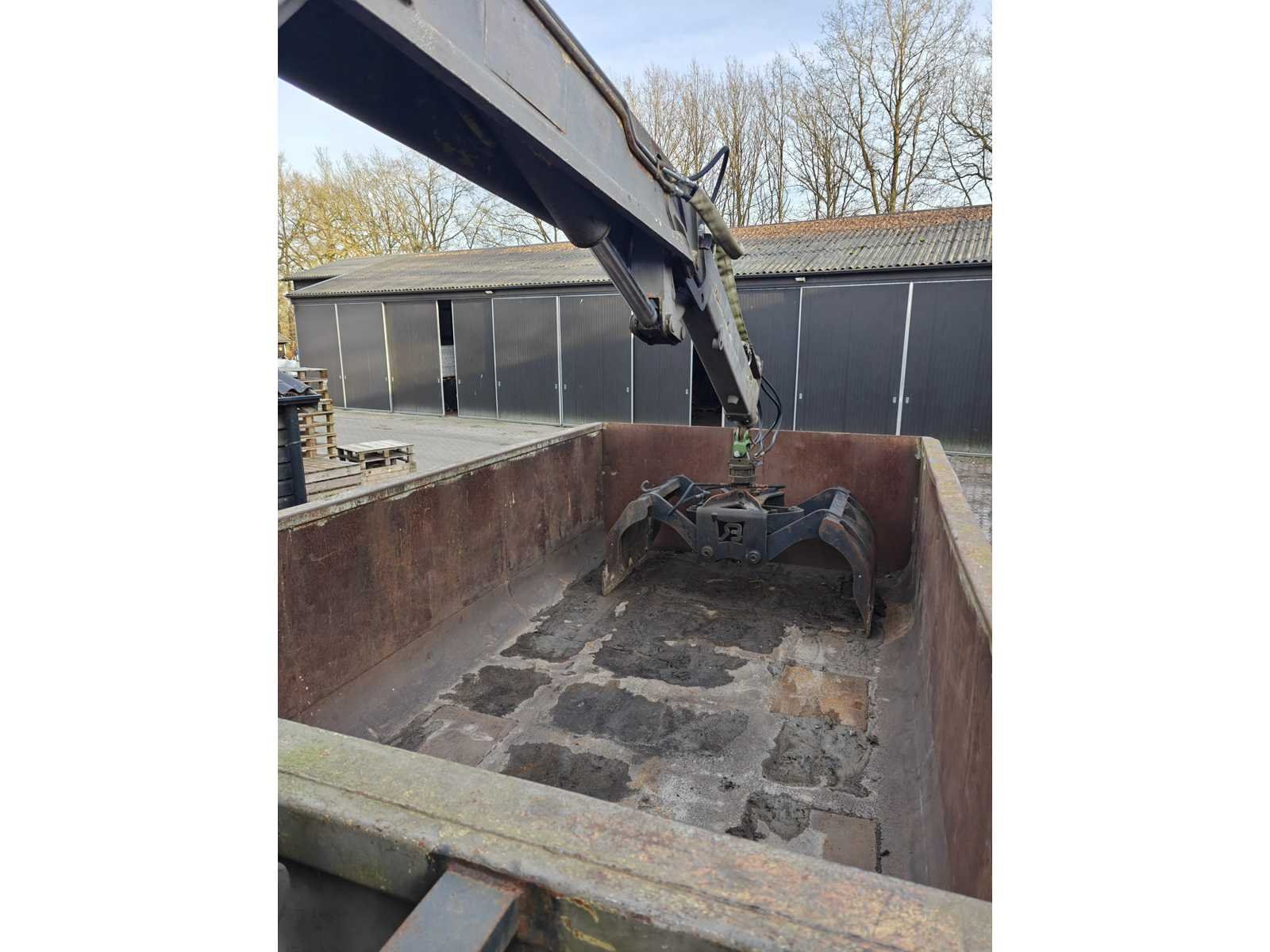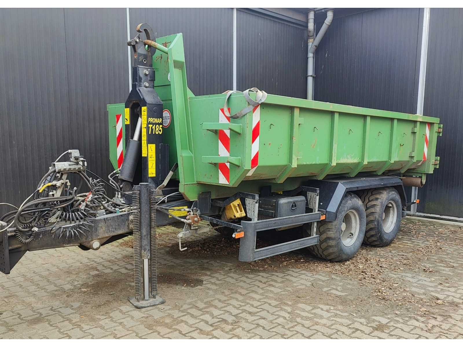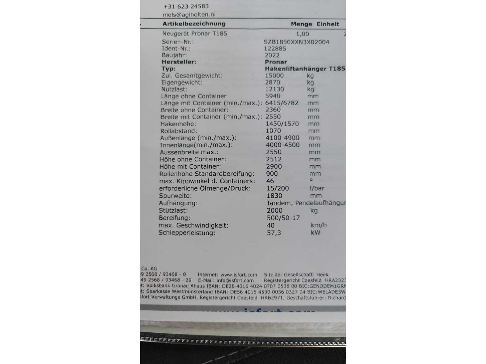 Max totaal gewicht 15.000 kilo. Laad capaciteit 12.200 kilo. 1x container 2022 20m³ , 1x container 2022 8m³ , 1x container 20m³ , 1x container 7m³ deze container is voorzien van een Atlas kraan (gereviseerd in 2025). 40km/u. Voorzien van luchtdrukremmen Nee Merk: Pronar Type: T185 Bouwjaar: 2022 Serienummer: SZB1850XXN3X02004 Eigen gewicht: 2800kg Totale afmeting L: 5950mm Totale afmeting Breedte: 2360mm Totale afmeting Hoogte: 1570mm