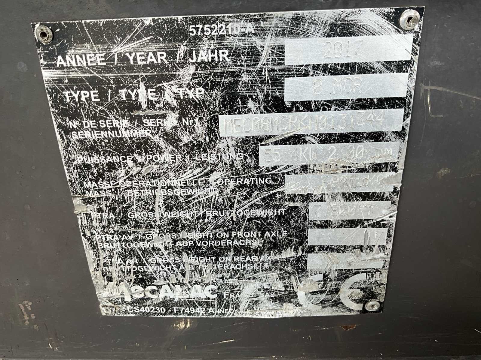Voorzien van 4-Cil. “Deutz” Dieselmotor; hydraulische snelwissel; extra hydraulische functies; rupsbreedte: ca. 45cm; “Grammer” Stoel; joystick bediening; camera met monitor; radio; automatische centrale smering; S50 S aansluiting; 2e giek voorzien van zeefstand; Nee Merk: Mecalac Type: 8 MCR Bouwjaar: 2017 Serienummer: MEC08MCRKH0131344 Merk motor: Deutz Motorvermogen (kW): 55.4kW Aantal cilinders: 4 Brandstof: Diesel Bedrijfsgewicht: 7800kg Rups breedte: 450mm Cabine: true Afgelezen urenstand: 8167