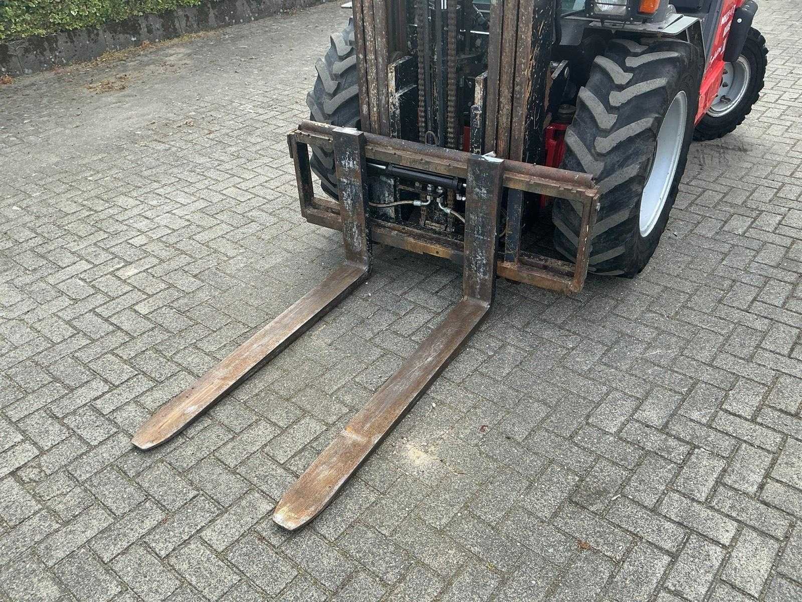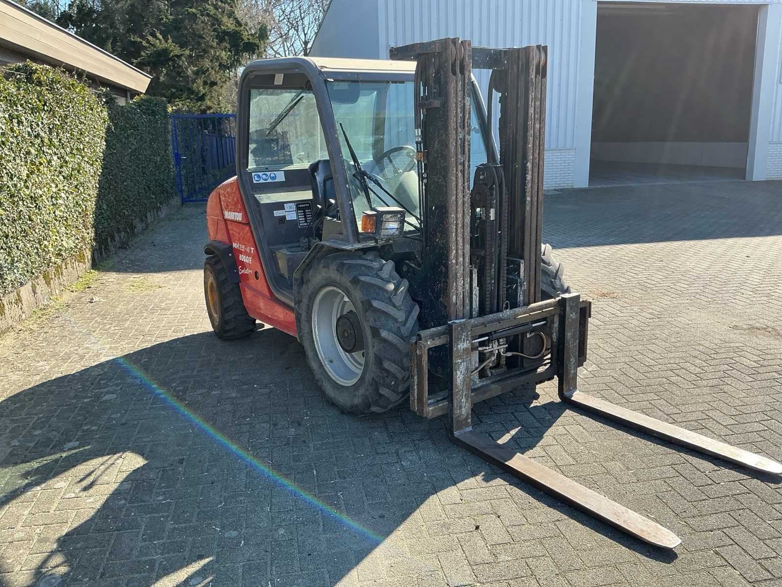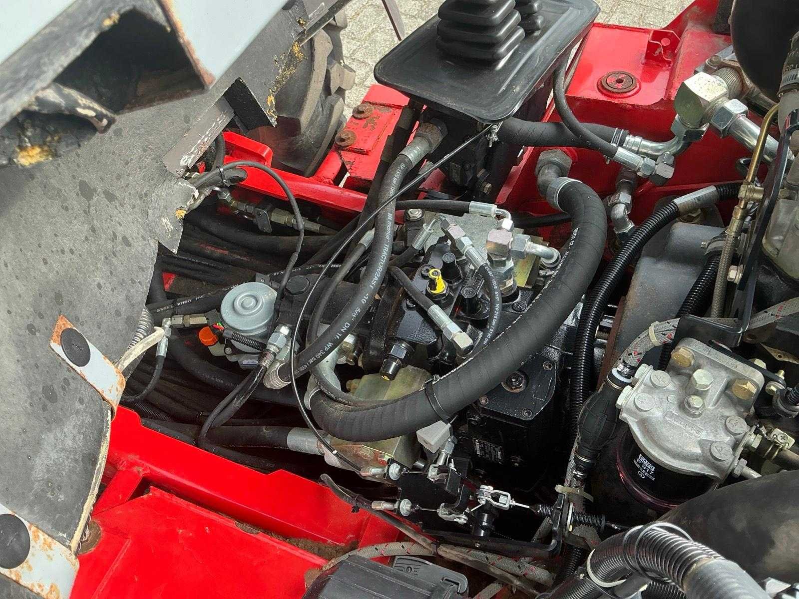 Voorzien van: 4-cilinder Perkins 404 C 22 Turbo-motor met 60 pk en 44,7 kW.kanteling van de mast (12°), elektro-hydraulische bediening om de cabine te heffen, en toegang te geven tot de mechanische onderdelen voor onderhoud, banden voor 275/80 R20, achter 27.10 - 12 14 , hydraustatische aandrijving, elektrohydraulische achteruitversnelling, Rexroth hydraulische motoren voor voorwielen, Poclain motoren voor achterwielen, versnelling vooruit/achteruit 1/1, maximale rijsnelheid 14 km/u, differentieelblokkering, totale breedte 1,44 m, totale hoogte (inclusief beschermkap) 1,99 m, totale lengte 4,04 m, bodemvrijheid 260 mm, veiligheidsgordel, urenteller, ruitenwissers voor en achter, hydraulisch differentieel met elektrohydraulische bediening, vergrendelbare parkeerrem schakelaar, schakelpook voor achteruitrijden op de stuurkolom, urenteller vervangen aan machine, huidige urenstand is na vervangen teller, onbekend draaiuren voor vervanging urenteller. Nee Merk: Manitou Type: MH25-4T Bouwjaar: 2008 Serienummer: 255528 Brandstof: Diesel Mast: Triplex Soort band: Luchtbanden Aantal wielen: 4 Afgelezen urenstand: 669 Ruw terrein: true Side-shift: true Triple mast: true Eigen gewicht: 4500kg Hefvermogen: 2599kg Lepellengte: 1150mm Max. hefhoogte: 3300mm Luchtbanden: true Minimale doorrijhoogte: 2000mm Totale afmeting Breedte: 1440mm Totale afmeting Hoogte: 2000mm Diesel: true