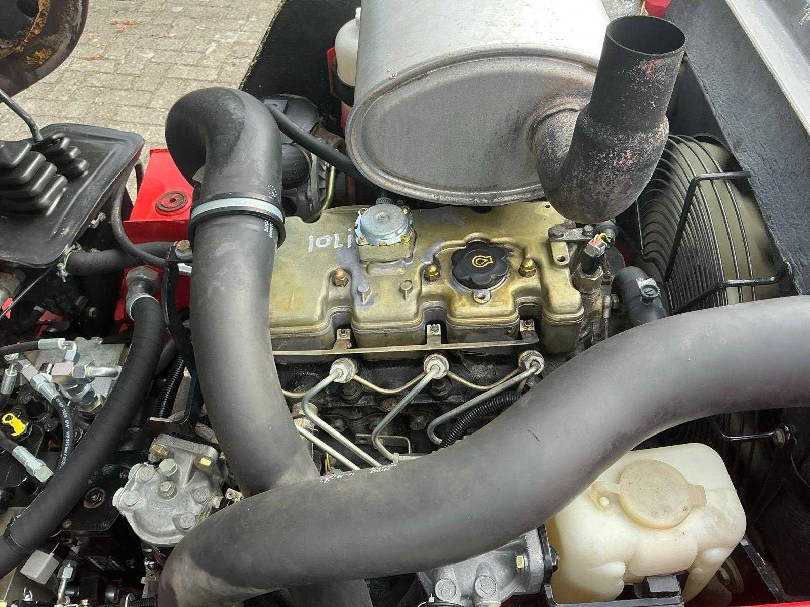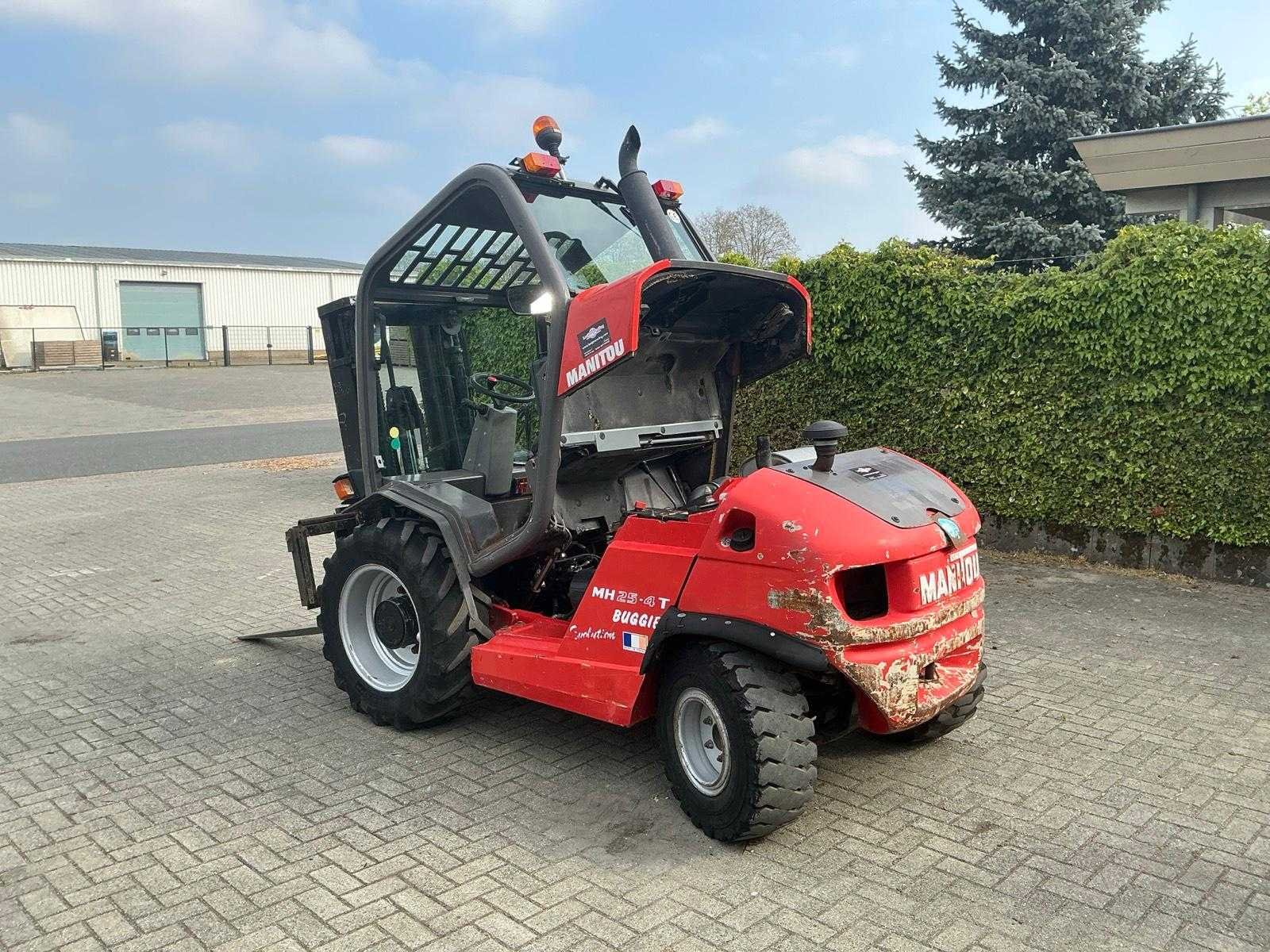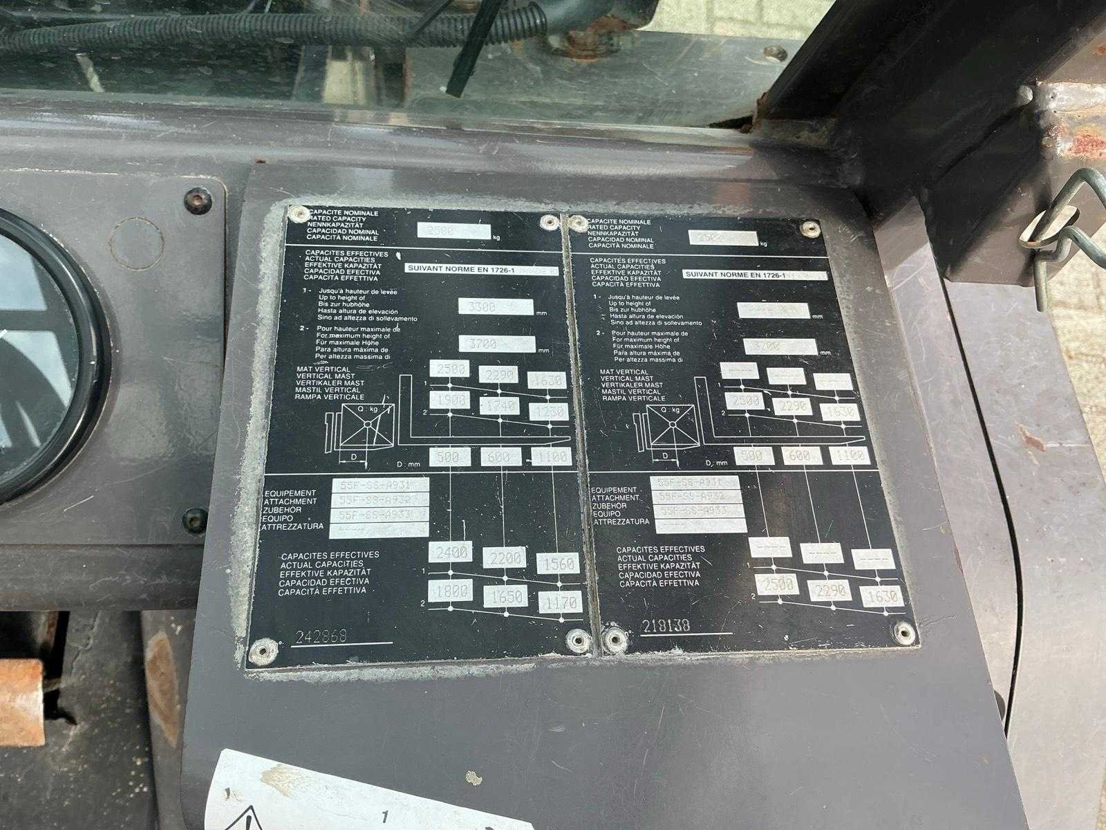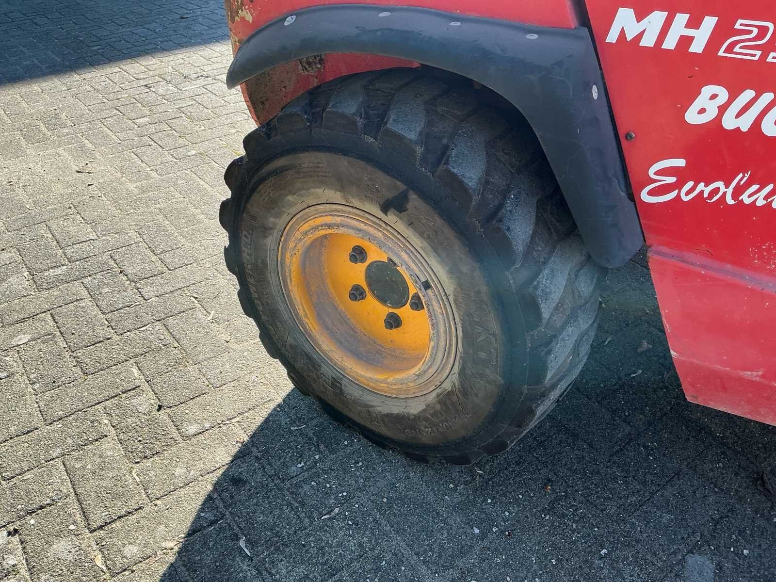 Voorzien van: 4-cilinder Perkins 404 C 22 Turbo-motor met 60 pk en 44,7 kW.kanteling van de mast (12°), elektro-hydraulische bediening om de cabine te heffen, en toegang te geven tot de mechanische onderdelen voor onderhoud, banden voor 275/80 R20, achter 27.10 - 12 14 , hydraustatische aandrijving, elektrohydraulische achteruitversnelling, Rexroth hydraulische motoren voor voorwielen, Poclain motoren voor achterwielen, versnelling vooruit/achteruit 1/1, maximale rijsnelheid 14 km/u, differentieelblokkering, totale breedte 1,44 m, totale hoogte (inclusief beschermkap) 1,99 m, totale lengte 4,04 m, bodemvrijheid 260 mm, veiligheidsgordel, urenteller, ruitenwissers voor en achter, hydraulisch differentieel met elektrohydraulische bediening, vergrendelbare parkeerrem schakelaar, schakelpook voor achteruitrijden op de stuurkolom, urenteller vervangen aan machine, huidige urenstand is na vervangen teller, onbekend draaiuren voor vervanging urenteller. Nee Merk: Manitou Type: MH25-4T Bouwjaar: 2008 Serienummer: 255528 Brandstof: Diesel Mast: Triplex Soort band: Luchtbanden Aantal wielen: 4 Afgelezen urenstand: 669 Ruw terrein: true Side-shift: true Triple mast: true Eigen gewicht: 4500kg Hefvermogen: 2599kg Lepellengte: 1150mm Max. hefhoogte: 3300mm Luchtbanden: true Minimale doorrijhoogte: 2000mm Totale afmeting Breedte: 1440mm Totale afmeting Hoogte: 2000mm Diesel: true