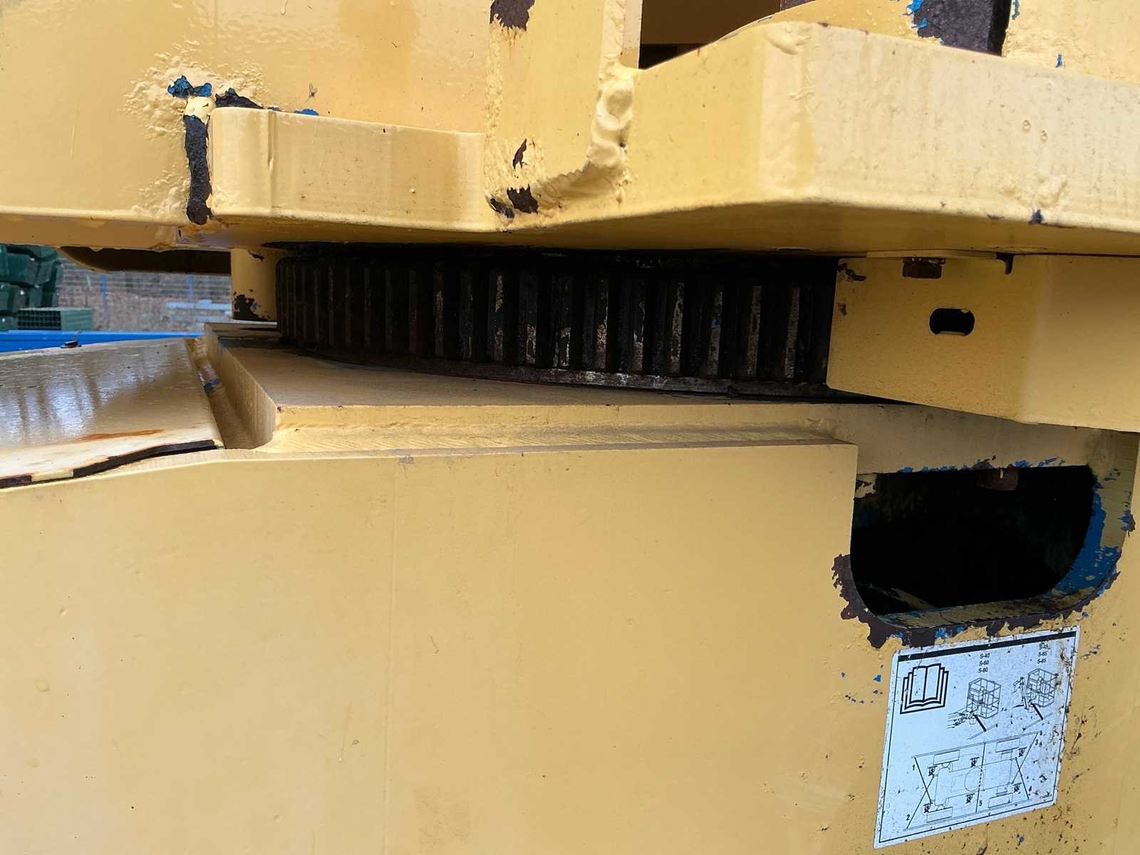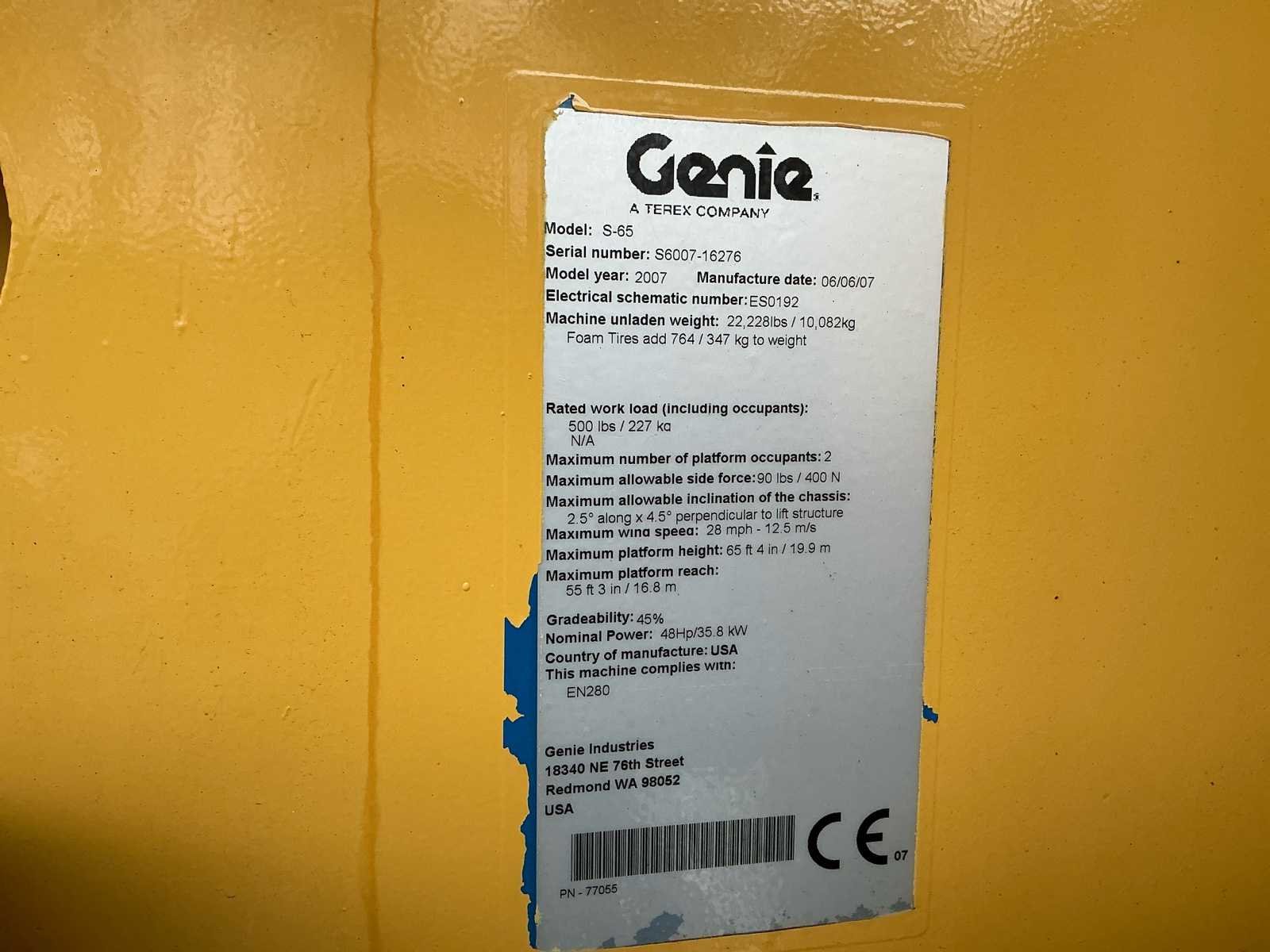 Voorzien van: werkhoogte 21,80 m, horizontaal bereik 17,10 m, capaciteit tot 227 kg, zelfnivellerend platform, hydraulische platformrotatie, volledig proportionele Hall-effect joystickbediening, kantelalarm, urenteller, claxon, continue 360°, wielmotoren met twee snelheden. No Merk: Genie Type: S-65 Bouwjaar: 2007 Serienummer: S6007-16276 Diesel: true Motorvermogen (kW): 35kW Telescoop hoogwerker: true Werkhoogte: 20300mm Horizontale rijkwijdte: 17100mm Platform capaciteit: 227kg Afgelezen urenstand: 6910 Eigen gewicht: 10100kg Totale afmeting L: 9500mm Totale afmeting Breedte: 2500mm Totale afmeting Hoogte: 2700mm