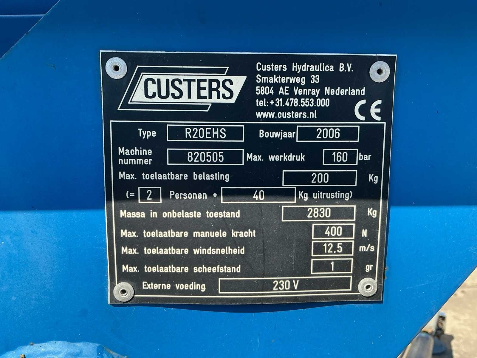 Voorzien: Custers R20EHS aanhanger hoogwerker (bouwjaar 2006) met ca. 20 m werkhoogte, 200 kg werkbelasting (2 personen + 40 kg), 160 bar hydraulische werkdruk, 230 V voeding en een eigen gewicht van 2830 kg. 2 movers, gewicht setje, Nee Merk: Custers Type: R20EHS Bouwjaar: 2006 Serienummer: 820506 Elektrisch: true Knikarm hoogwerker: true Werkhoogte: 20000mm Horizontale rijkwijdte: 12000mm Plateau afm. l: 800mm Plateau afm. b: 1200mm Platform capaciteit: 200kg Eigen gewicht: 2830kg Totale afmeting L: 7500mm Totale afmeting Breedte: 1800mm Totale afmeting Hoogte: 2200mm