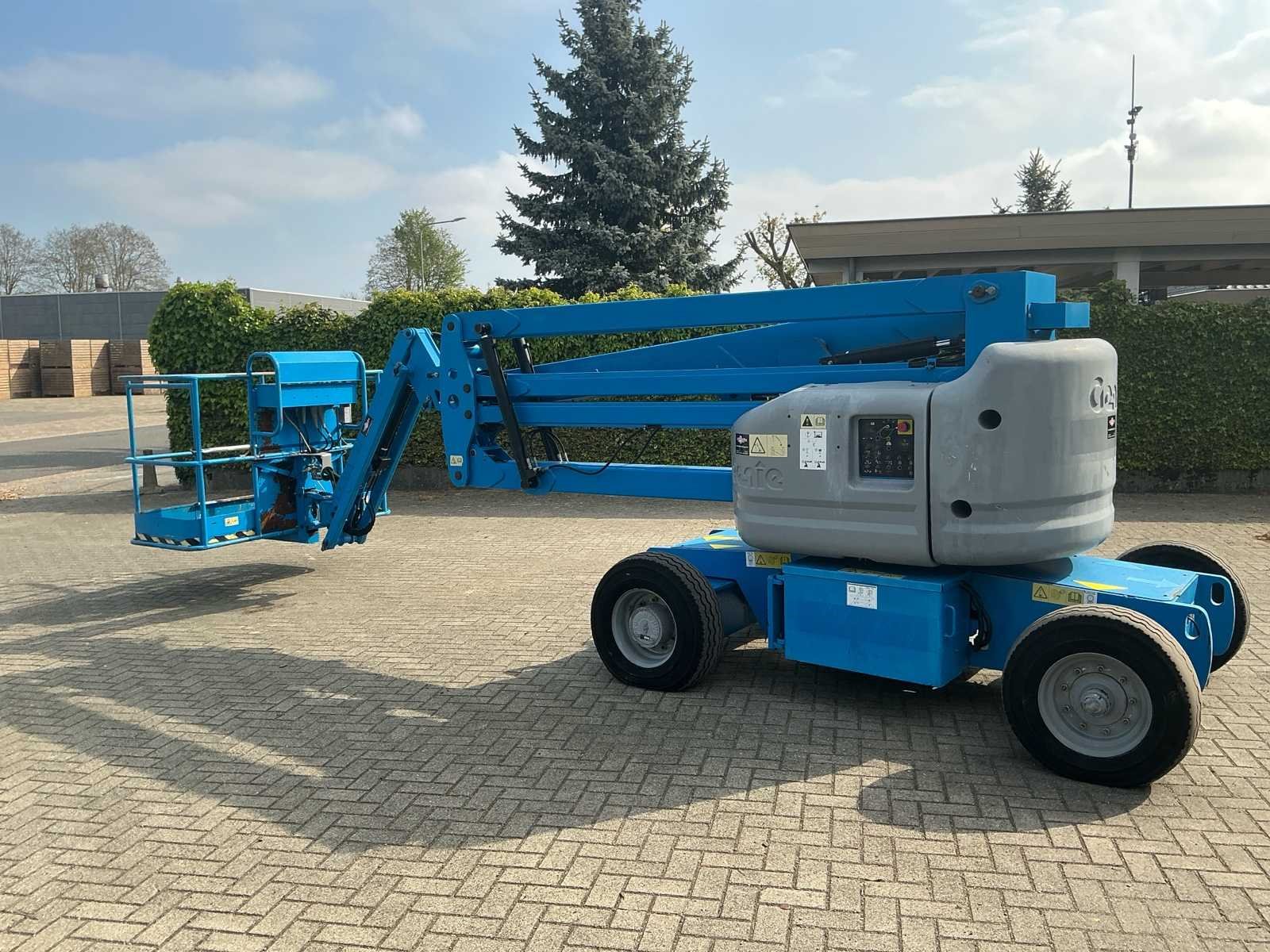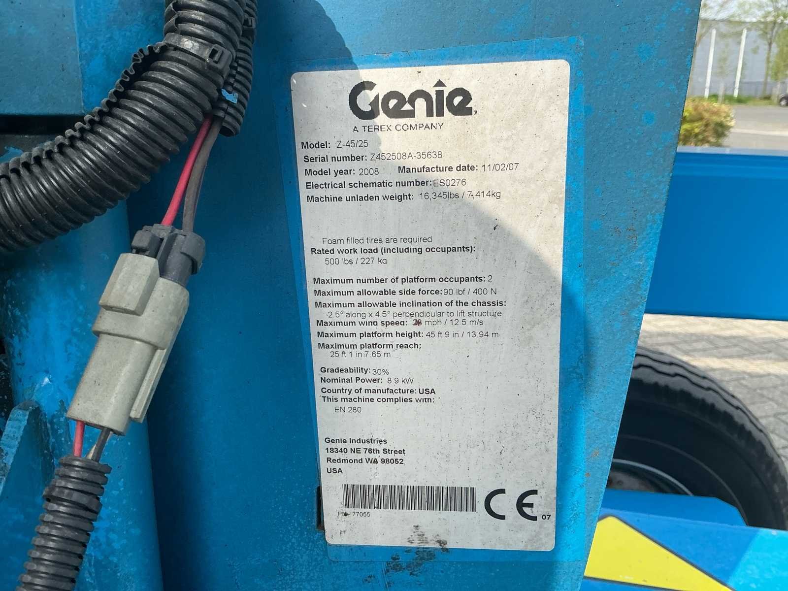 Voorzien van: normering: CE / EN 280, max. werkhoogte: ca. 15,9m, max. platformhoogte: 13,94m, max. horizontaal bereik: ca. 7,65 m, max. oversteek (up & over): ca. 7,04 m, hefcapaciteit 227 kg, max. aantal personen 2, lengte 6,83 m (J-uitvoering), breedte: 1,79 m, hoogte (ingeklapt): 2,00m, wielbasis: 2,03m, bodemvrijheid: 0,24m, platform afmetingen 0,76 x 1,83m, eigen gewicht 7.414 kg, (Bi-Energy), 48V accupakket (8 x 6V), Kubota diesel (ca. 13,3 pk / 9,9 kW), Hybride inzetbaar: geschikt voor binnen (elektrisch) en buiten (diesel), 24V noodbediening, proportionele joystickbediening, zelfnivellerend platform, hydraulisch roterend werkplatform, 355° draaibare bovenwagen, zero tailswing (geen achteroverstek), rijfunctie met snelheidsregeling, claxon, urenteller en kantelalarm, hybride uitvoering (elektrisch + diesel)zeer veelzijdig inzetbaar. No Merk: Genie Type: Z-45/25J Bouwjaar: 2008 Serienummer: Z452508A-35638 Diesel: true Elektrisch: true Motorvermogen (kW): 8.9kW Knikarm hoogwerker: true Werkhoogte: 13940mm Horizontale rijkwijdte: 7650mm Plateau afm. l: 1830mm Plateau afm. b: 760mm Platform capaciteit: 227kg Accu lader: true Afgelezen urenstand: 903 Eigen gewicht: 7414kg Totale afmeting L: 6830mm Totale afmeting Breedte: 1790mm Totale afmeting Hoogte: 2000mm