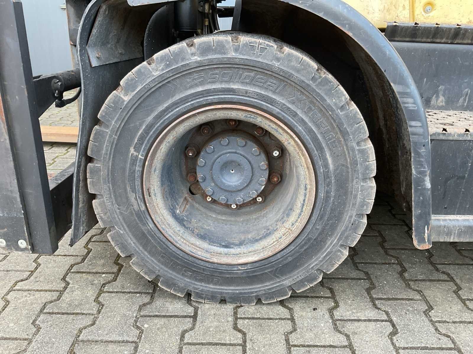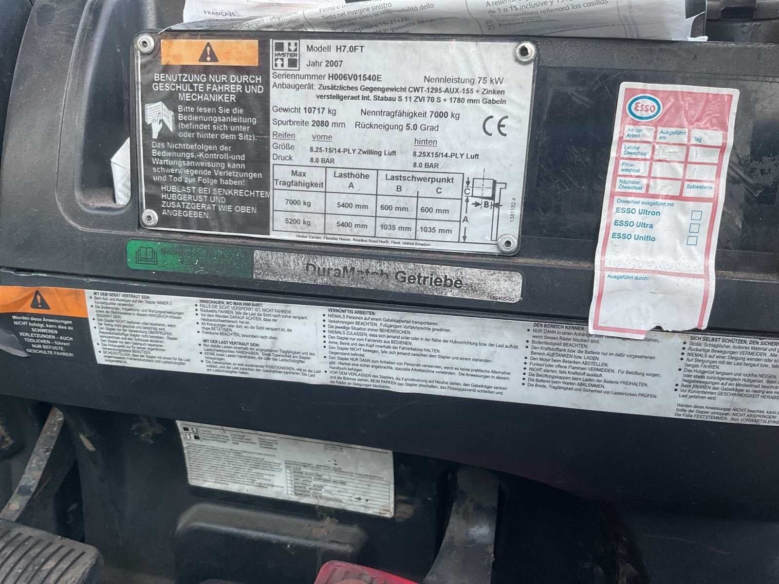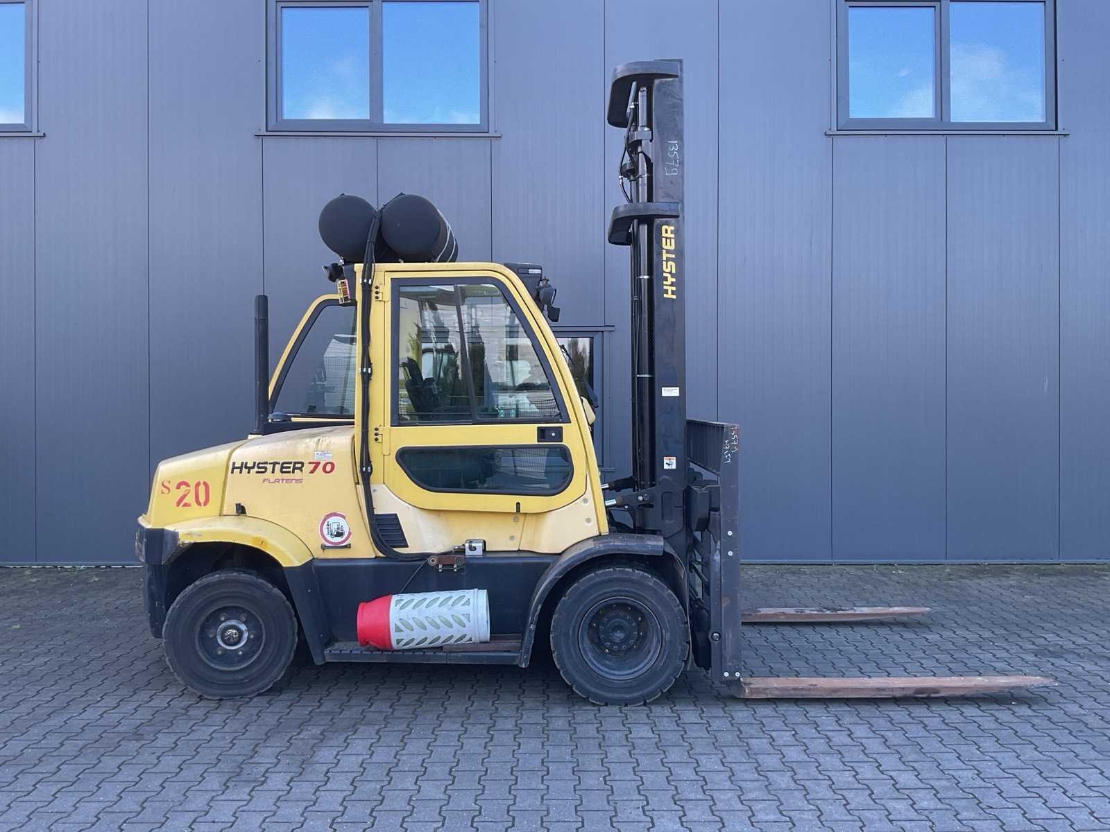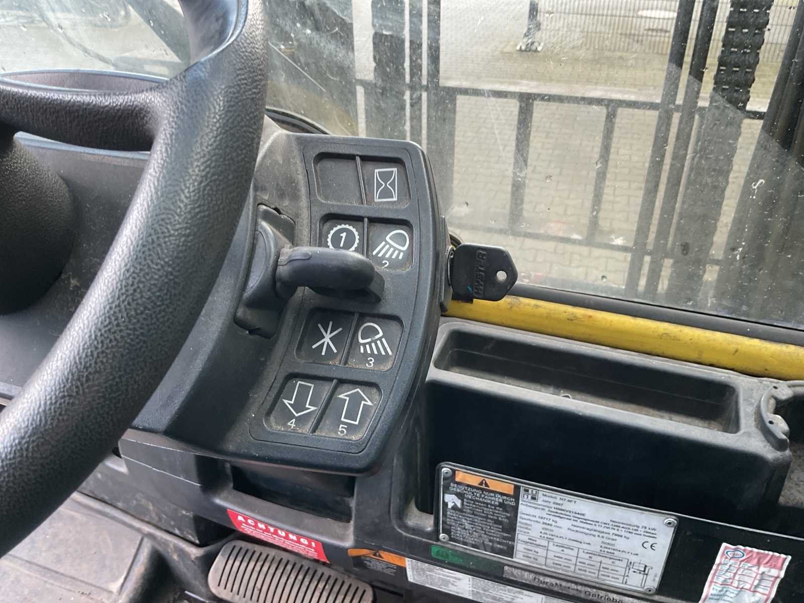 Voorzien van Zijschuiver, SIDESHIFT; 4.3L LPG PSI-motor; 7.000 kg (7 ton); Elektronische 2-versnelling Powershift (2F/2R) Nee Merk: Hyster Type: H7.0FT Bouwjaar: 2007 Serienummer: H006V01540E Brandstof: Gas Mast: Duplex Soort band: Volrubber Aantal wielen: 4 Side-shift: true Hydraulisch verstelbare lepels: true Eigen gewicht: 10717kg Hefvermogen: 7000kg Lepellengte: 1600mm Max. hefhoogte: 4000mm Vol rubber banden: true LPG: true