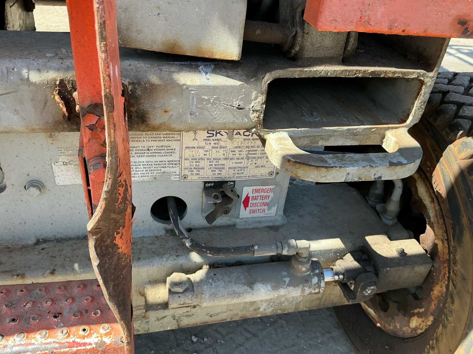 No Merk: Skyjack Type: SJ III - 6832 Serienummer: 82177 Elektrisch: true Schaarhoogwerker: true Werkhoogte: 10000mm Platform capaciteit: 454kg Accu lader: true Eigen gewicht: 2486kg Totale afmeting L: 2550mm Totale afmeting Breedte: 1700mm Totale afmeting Hoogte: 2500mm