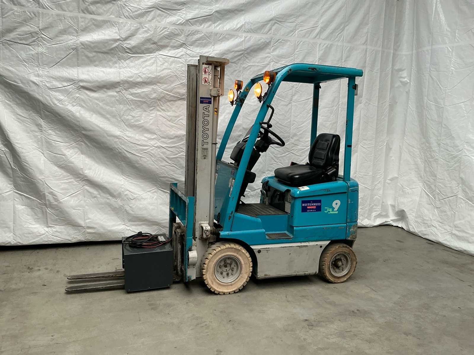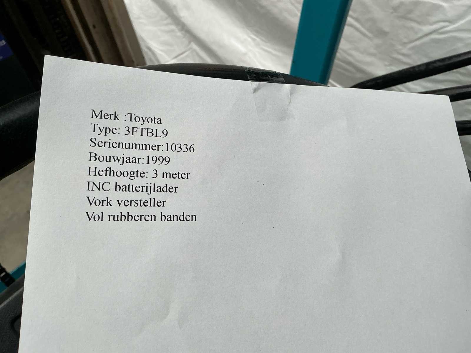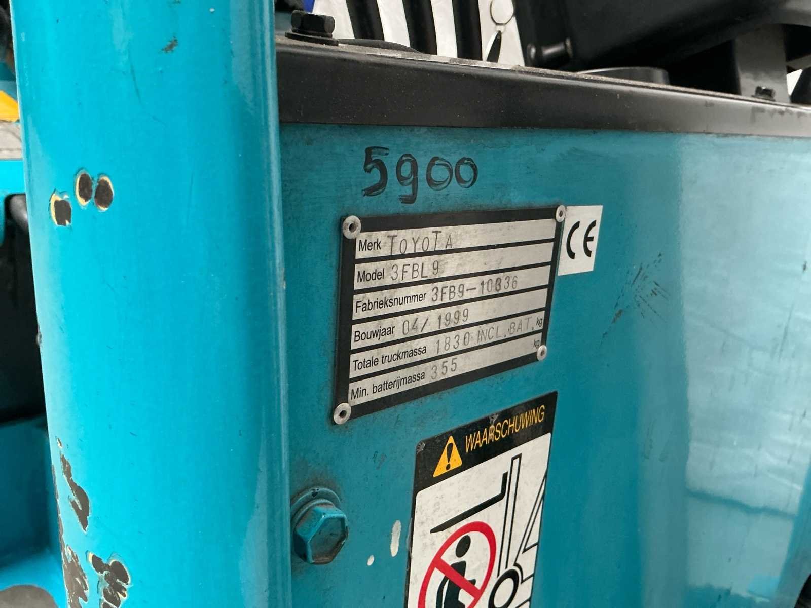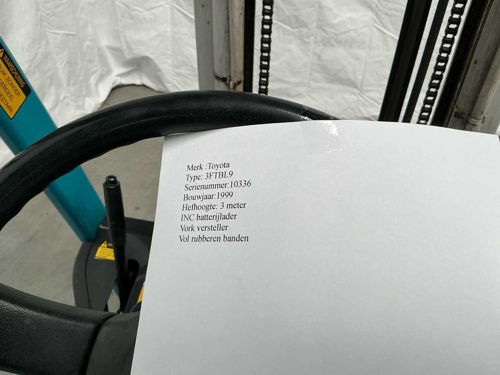 INC batterijlader, vork versteller. No Merk: Toyota Type: 3FBL9 Bouwjaar: 1999 Serienummer: 10336 Brandstof: Elecktrisch Mast: Simplex Soort band: Rubberen banden Aantal wielen: 4 Accu lader: true Side-shift: true Eigen gewicht: 1830kg Hefvermogen: 800kg Max. hefhoogte: 3000mm Vol rubber banden: true
