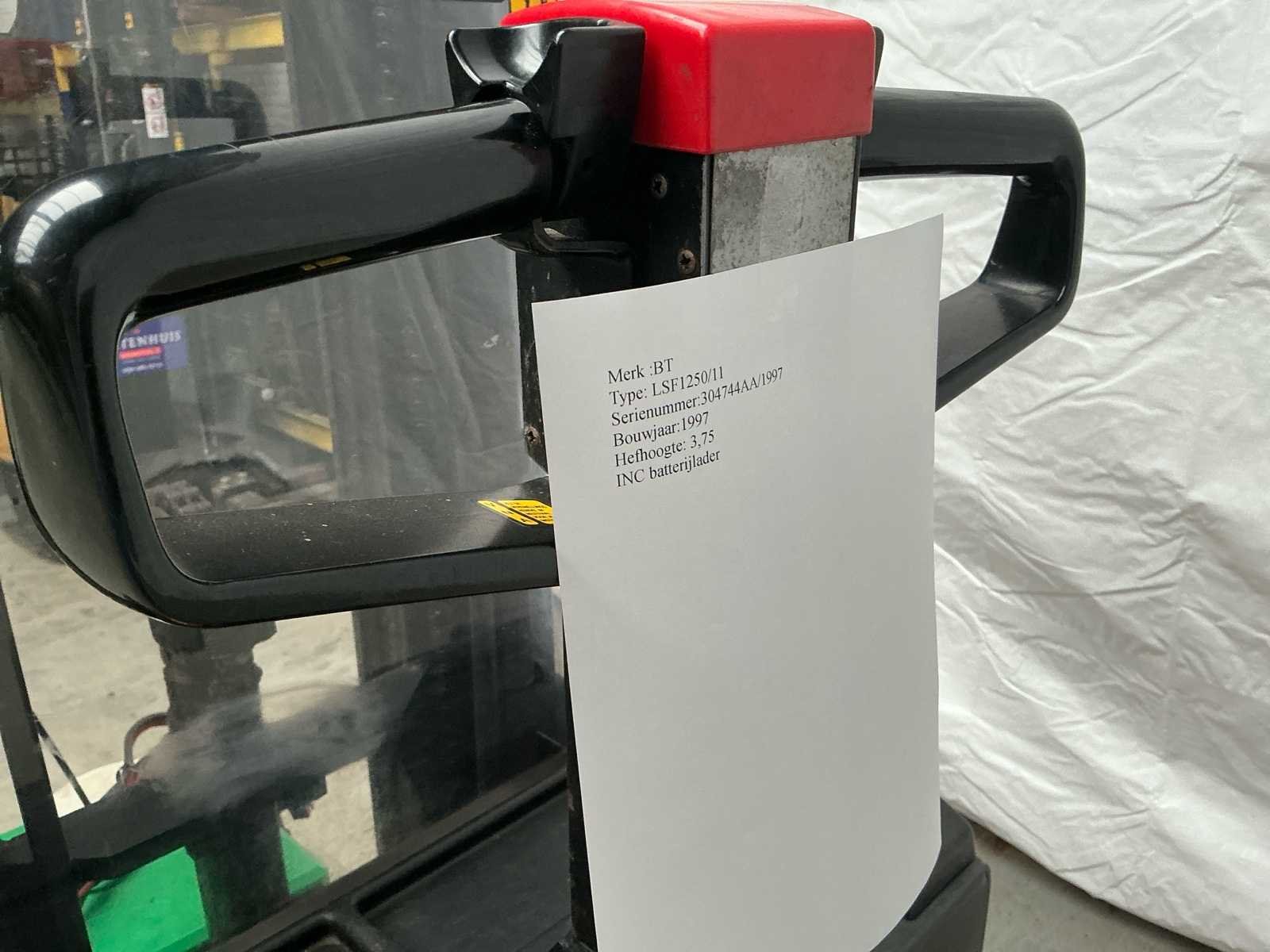 Inclusief INC batterijlader Nee Merk: BT Type: LSF1250/11 Bouwjaar: 1997 Hefvermogen: 1250kg Hefhoogte: 3750mm Afgelezen urenstand: 5382 Eigen gewicht: 1124kg Meerij stapelaar: true Accu lader: true