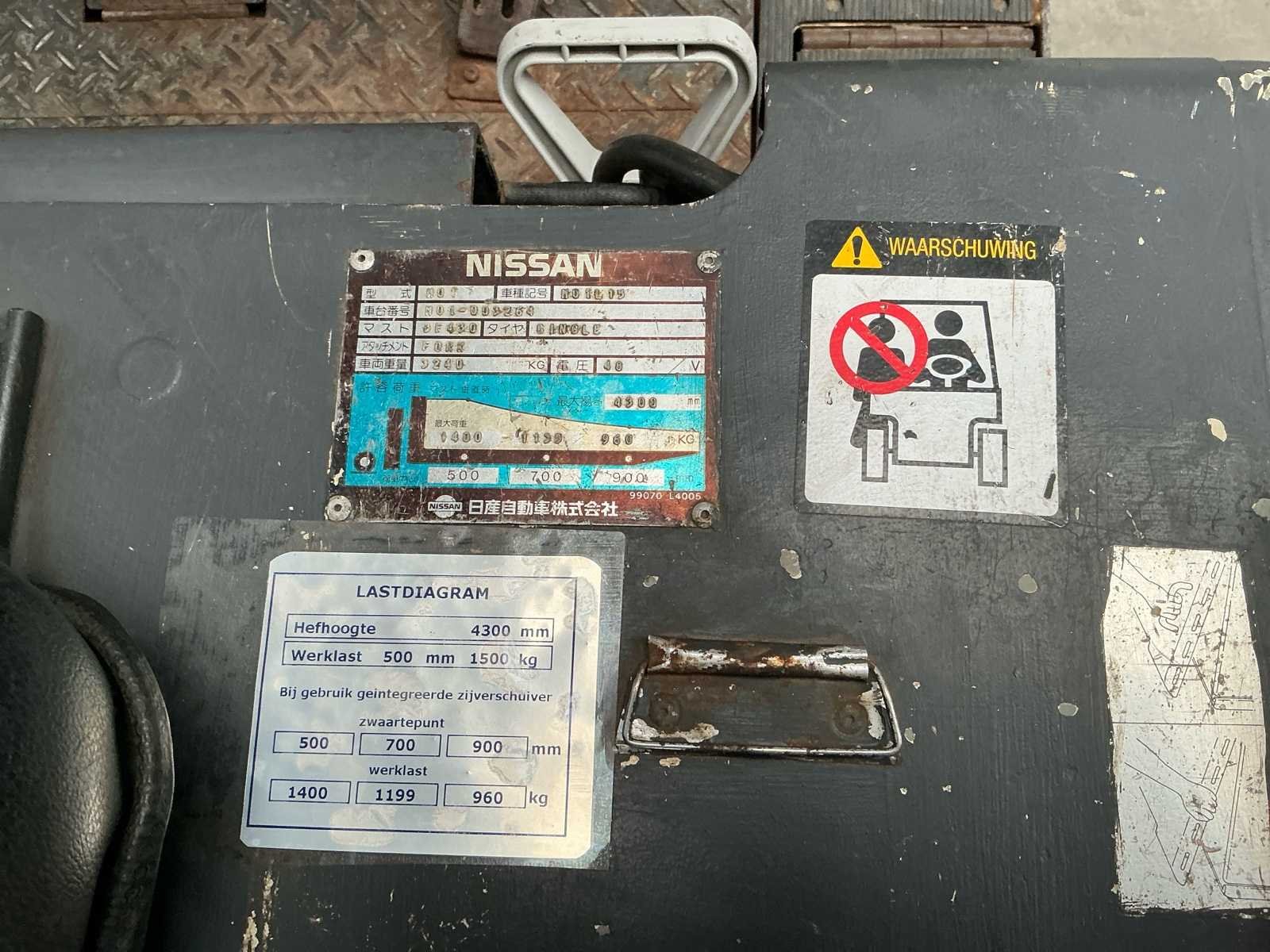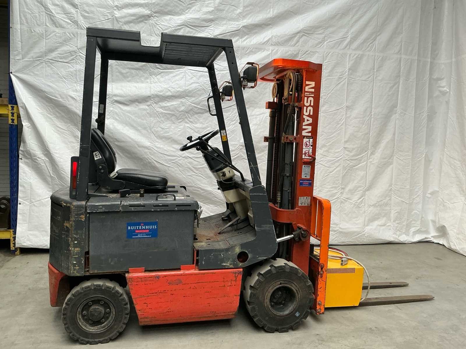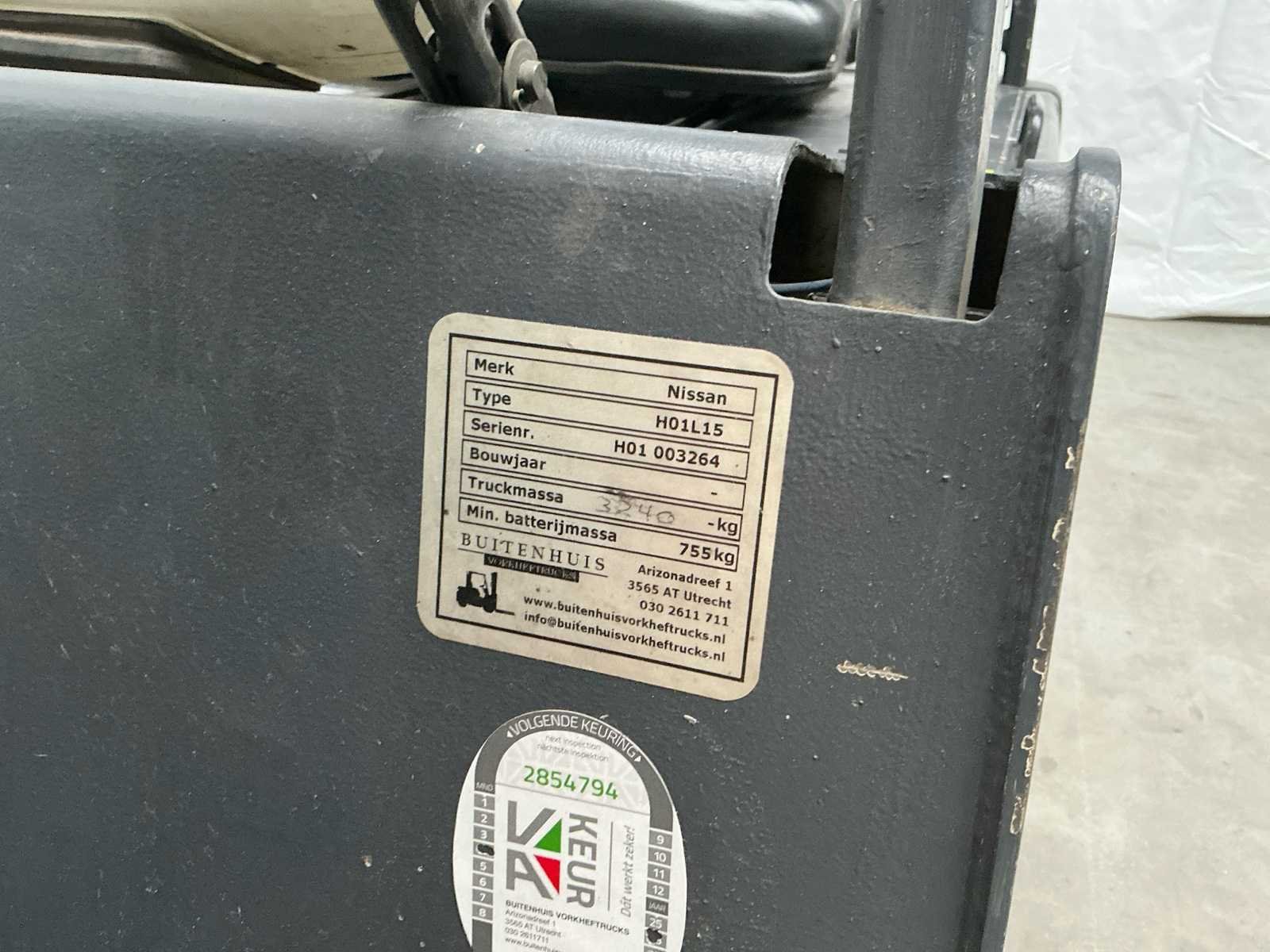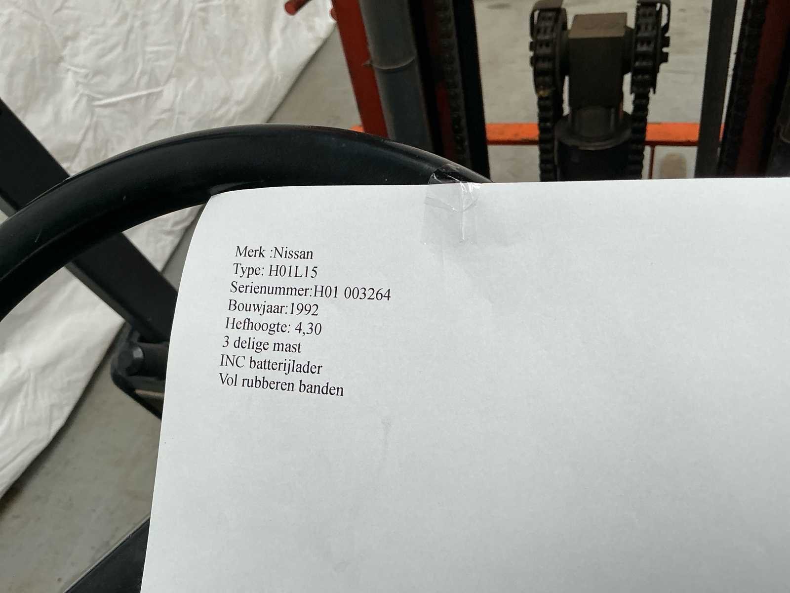 Nee Merk: Nissan Type: H01L15 Bouwjaar: 1992 Serienummer: H01 003264 Brandstof: Elecktrisch Mast: Triplex Soort band: Rubber Aantal wielen: 4 Accu lader: true Free-lift: true Triple mast: true Eigen gewicht: 3995kg Hefvermogen: 1500kg Max. hefhoogte: 2100mm Vol rubber banden: true