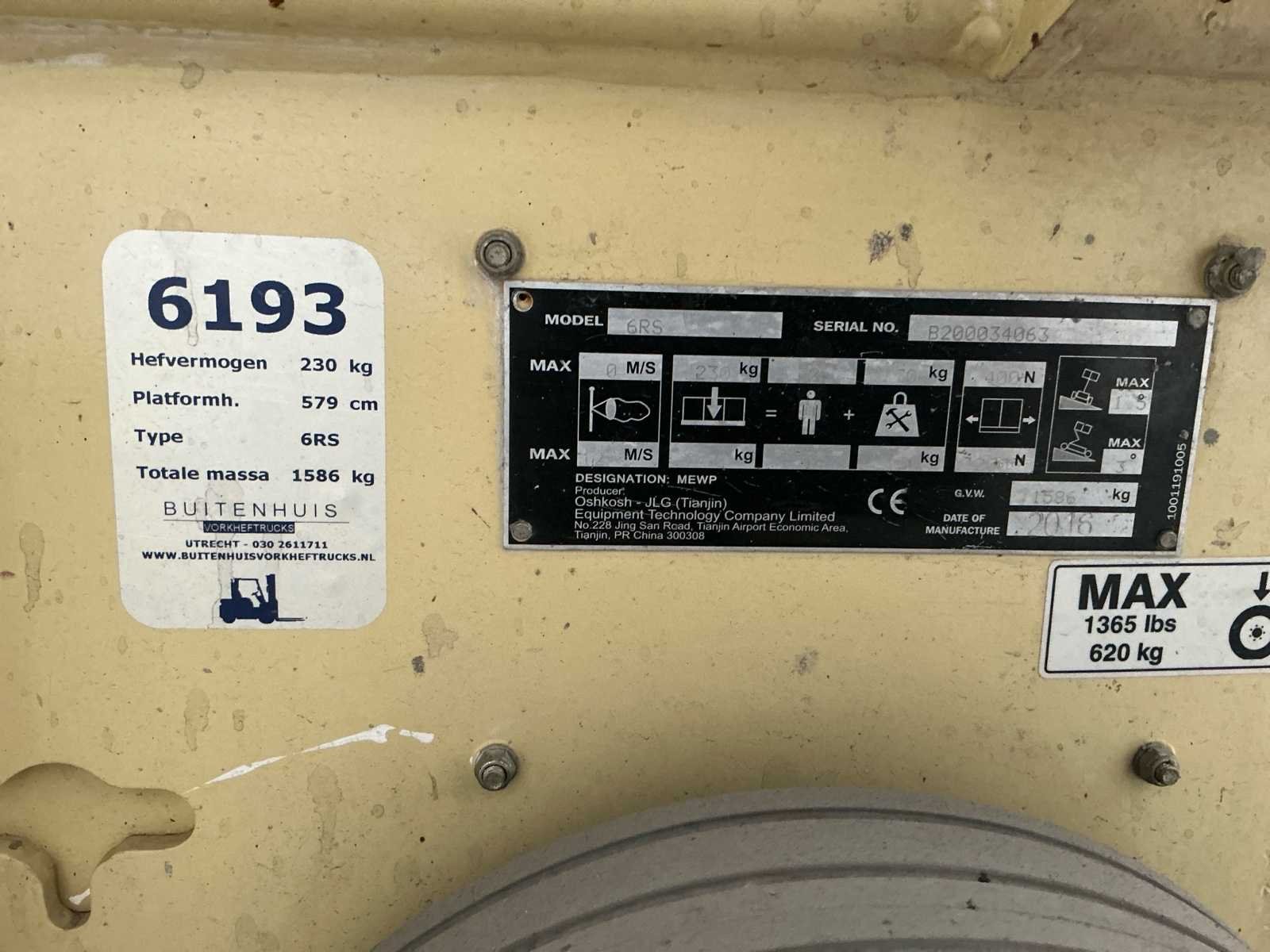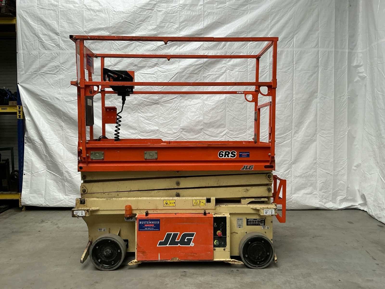 Interne batterijlader. Platformhoogte: 5790 mm Nee Merk: JLG Type: 6RS Bouwjaar: 2016 Serienummer: B200034063 Elektrisch: true Schaarhoogwerker: true Werkhoogte: 7800mm Platform capaciteit: 230kg Afgelezen urenstand: 150 Eigen gewicht: 1586kg