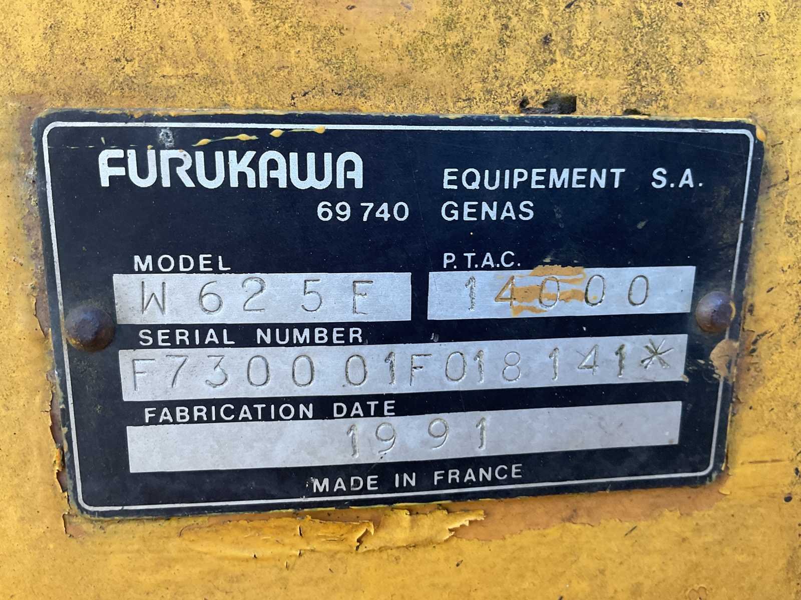 Met poliepgrijper motor defect Nee Merk: furukawa Type: W625F Bouwjaar: 1991 Eigen gewicht: 14000kg Afgelezen urenstand: 20410hr Totale afmeting L: 6600mm Totale afmeting Breedte: 2600mm Totale afmeting Hoogte: 3150mm