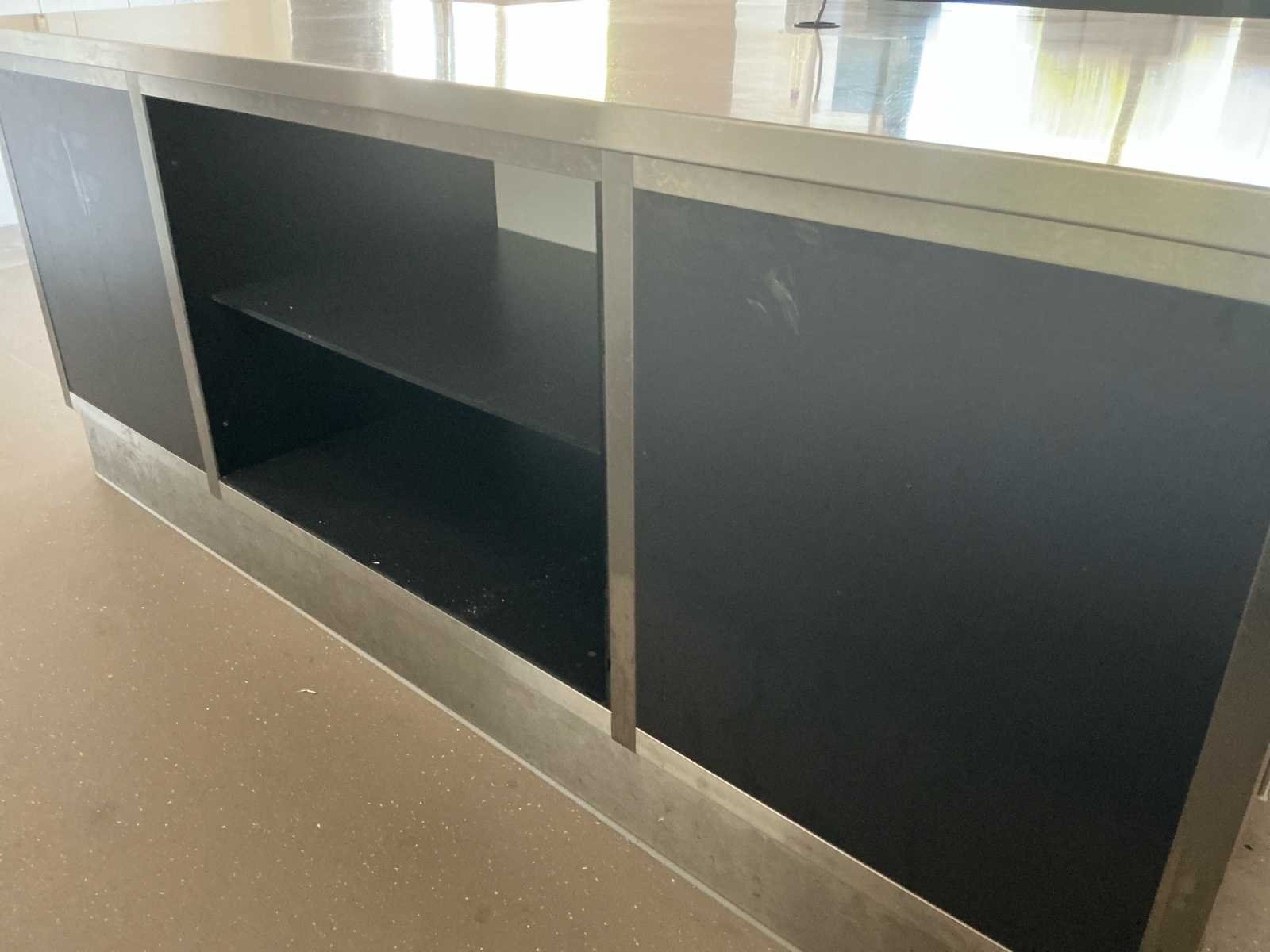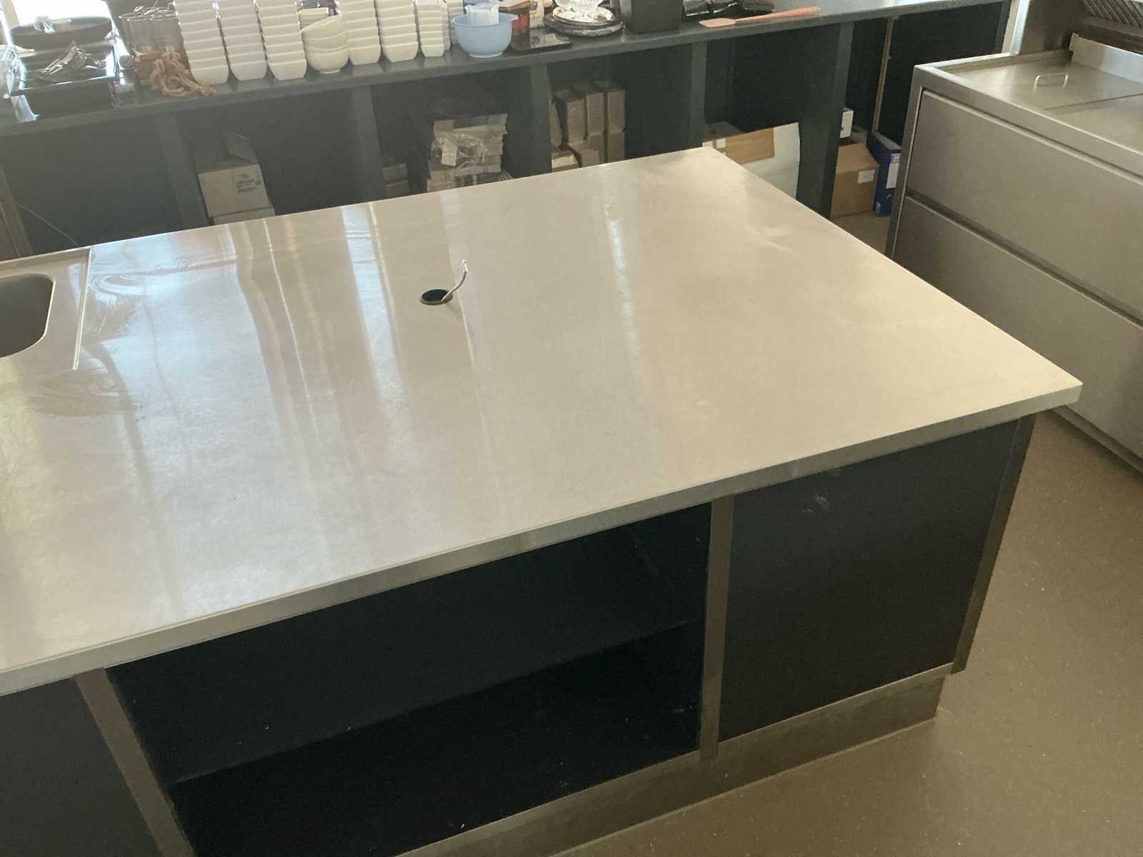 Afmetingen: 2280 x 1400 x 900 mm Het bovenblad is vervaardigd van rvs AISI 304, vlak dubbelhaaks omgezet, voorzien van waterkering, onderlijmd met geplastificeerd spaanplaat in combinatie met multiplex vullatten Bovenblad uit één stuk, vlak en voorzien van: 1 x spoelbak 400 x 400 x 250 mm - 1 x kraangat incl. kraan - geperforeerde standpijp - onderbouw voorzien van: - rvs plintframe incl. rvs plint indeling zijde spoelbak: - rvs/volkern legbord - volkern draaideurkast (L= 1000mm) voorzien van volkern bodem- en tussenschap - volkern open kast (L= 1000mm) voorzien van volkern bodemschap en schandplaat voor de spoelbak - 2 volkern zijpanelen Indeling andere zijde: volkern blind paneel - volkern open kast (L= 1000mm) voorzien van volkern bodem- en tussenschap - volkern blind paneel. Kopse kanten sparing afvalton Nee Merk: Keuken eiland met stopcontact