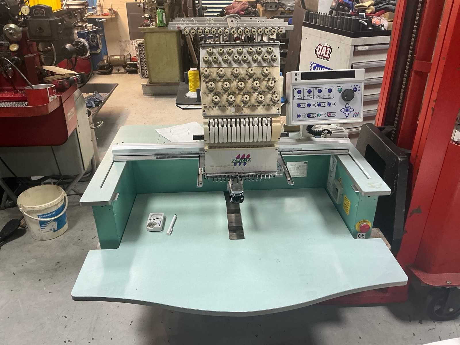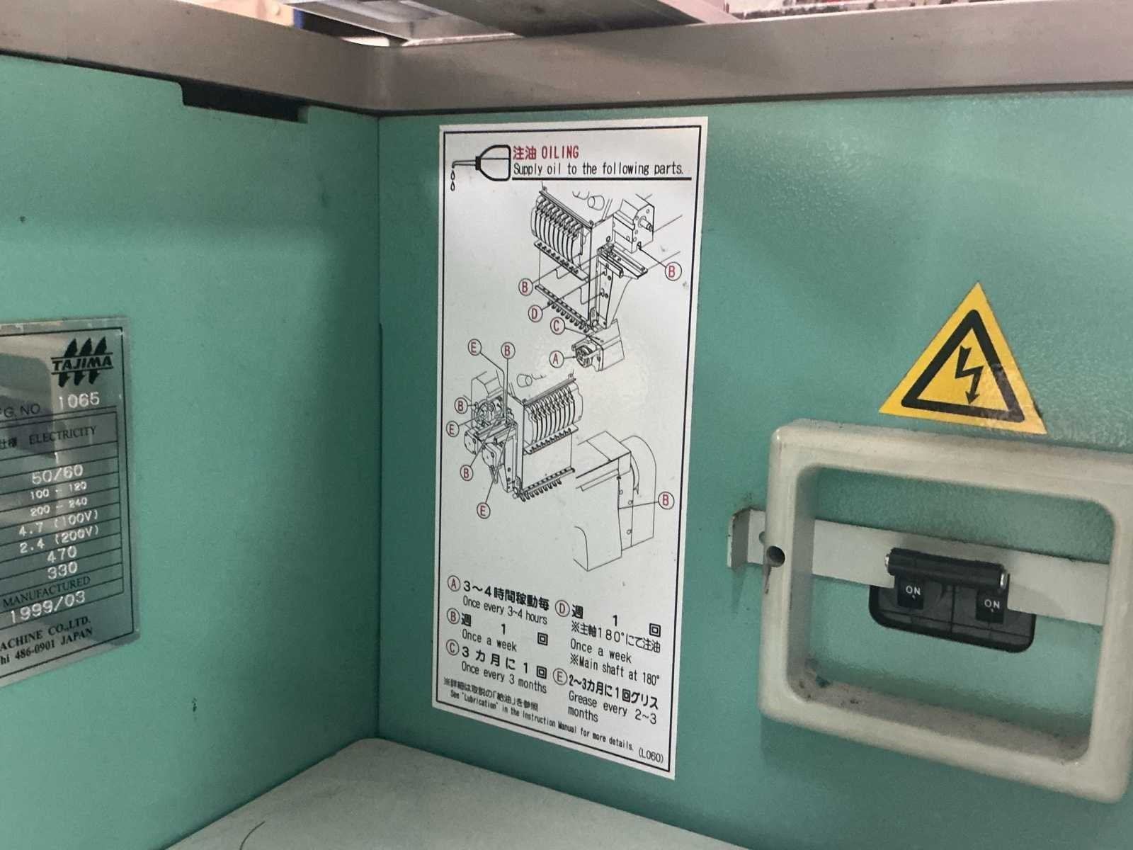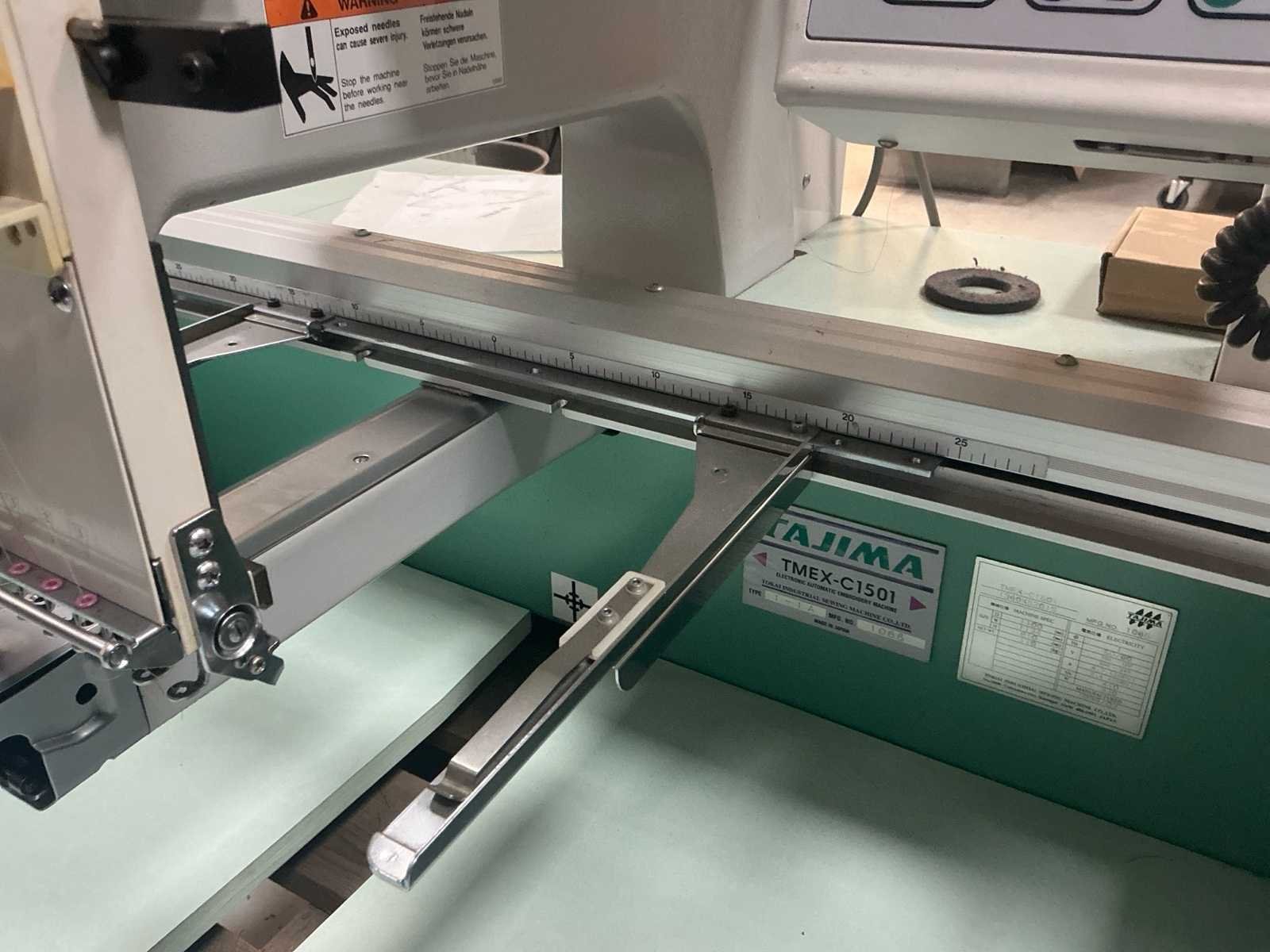 Voorzien van documentatie en doos vol houps en toebehoren (zie foto) Nee Merk: Tajima Type: TMEX-C1501 Bouwjaar: 1999 Serienummer: 1065 Aantal koppen: 15pcs Aantal naalden: 15pcs Borduurgebied afm. l: 400mm Borduurgebied afm. b: 600mm CNC-besturing, merk, type: Tajima Aansluiting: 220V Machinegewicht: 110kg Totale afmeting L: 1100mm Totale afmeting Breedte: 1134mm Totale afmeting Hoogte: 810mm