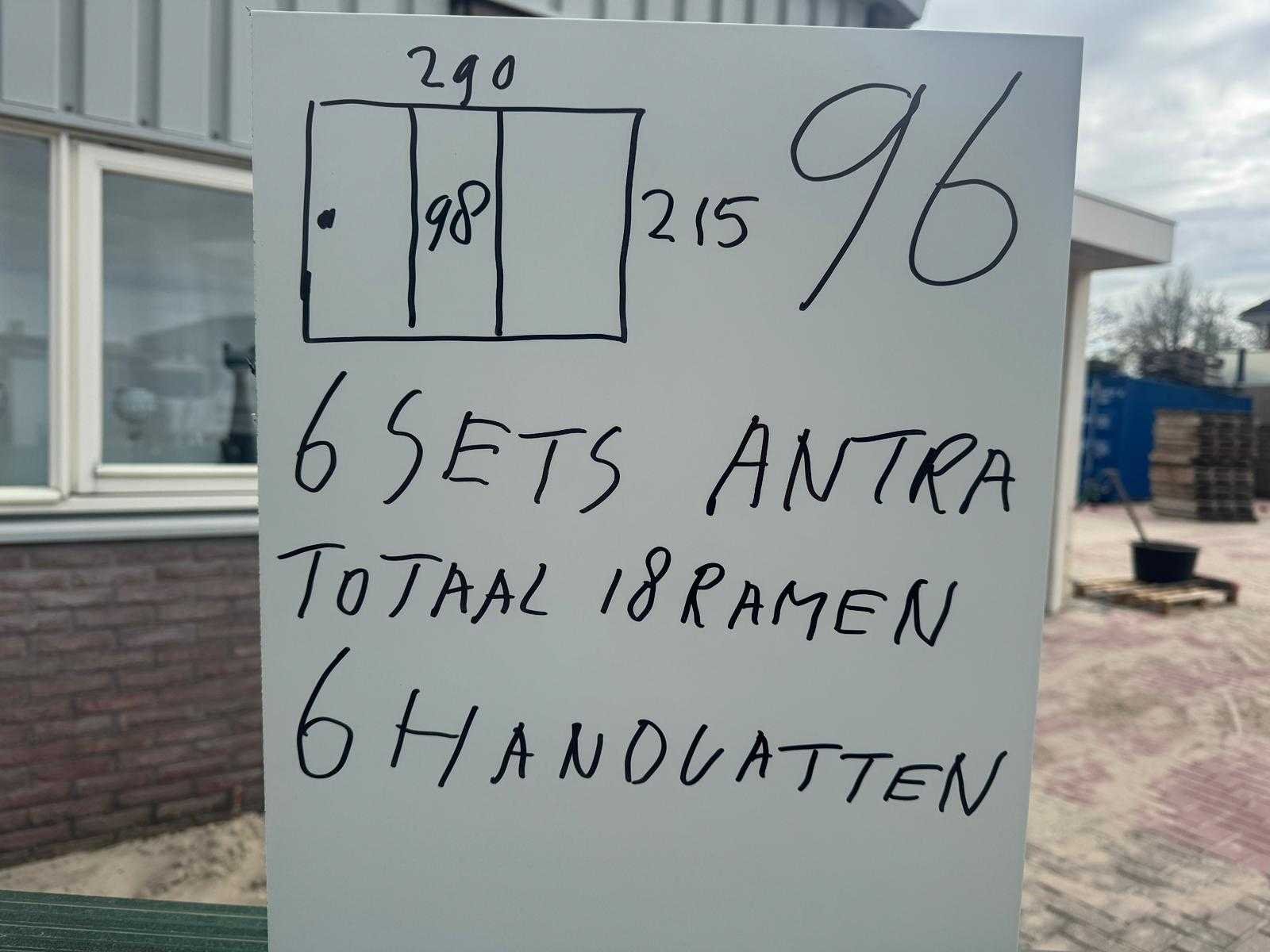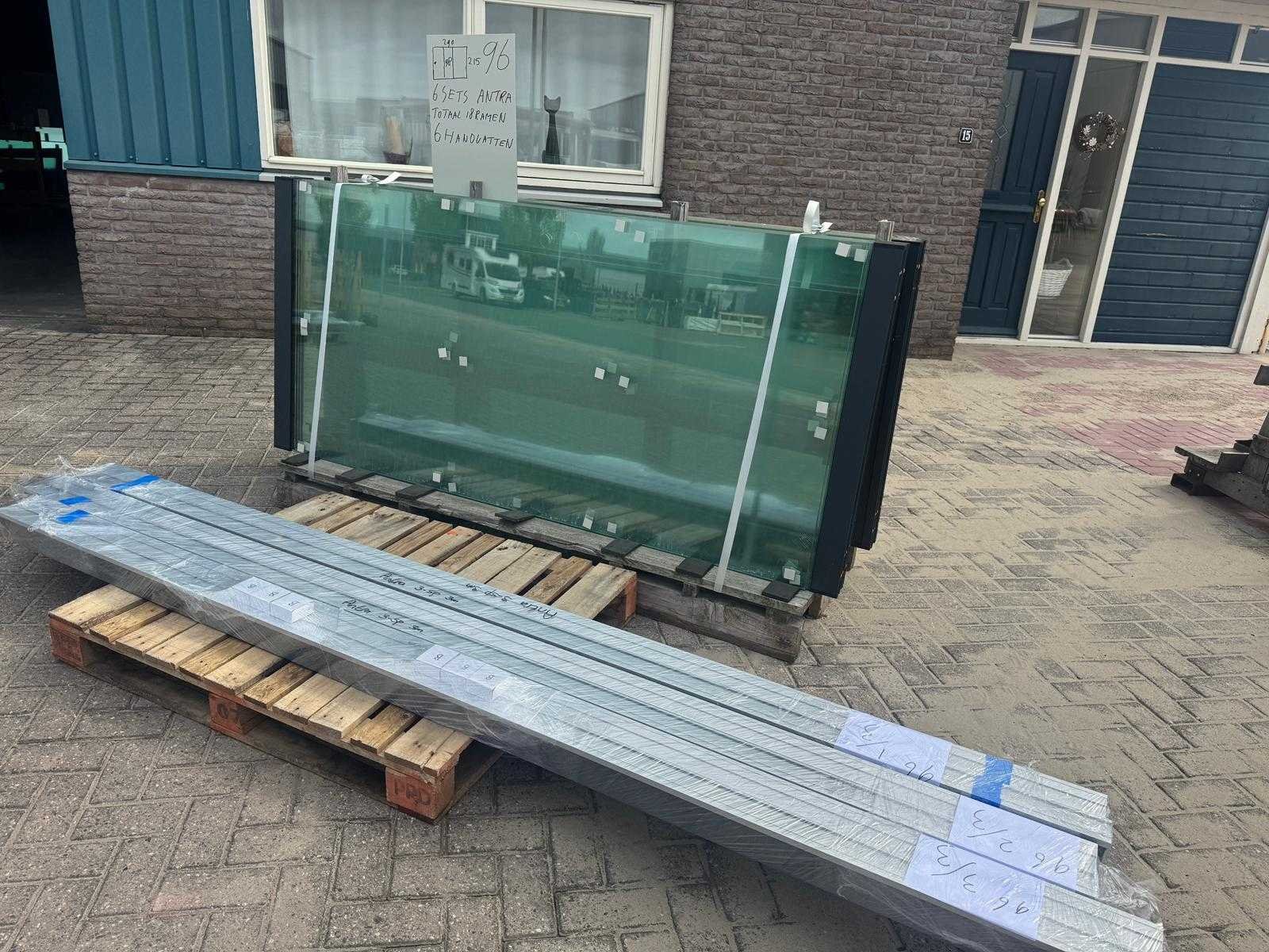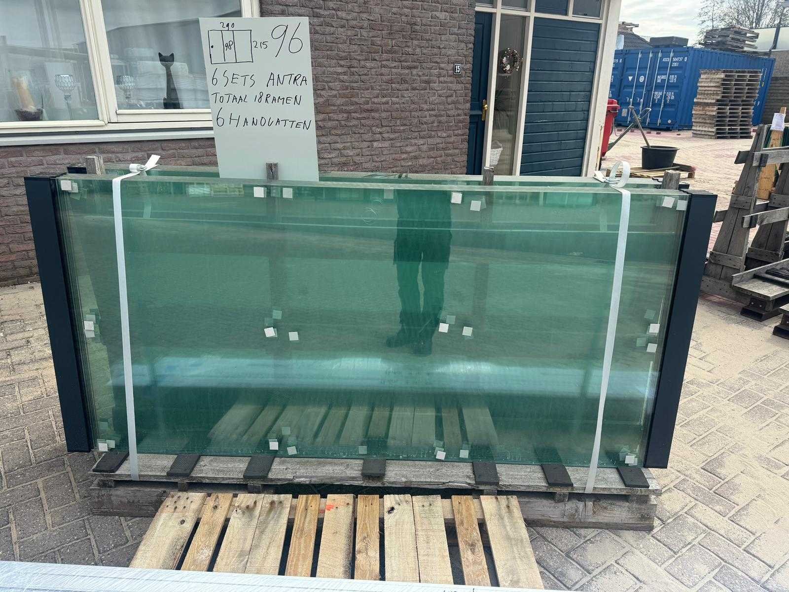 6 sets van 3 schuiframen – 98 cm x 215 cm, helder glas • Afmetingen per raam: breedte 98 cm, hoogte (dagmaat) 215 cm • Maximale breedte complete set: 290 cm • Totaal: 18 ramen (6 sets van 3 stuks) • Materiaal & kleur: antraciet aluminium frame, helder glas • Inclusief: 6 boven- en 6 onder-rails met 3 sporen • 6 handgrepen • Conditie: partijhandel – kan lichte strepen of vegen bevatten • Verpakking: op pallet met glas • Opmerking: foto van overkapping is ter illustratie • Heftruck is aanwezig voor het afhalen Nee