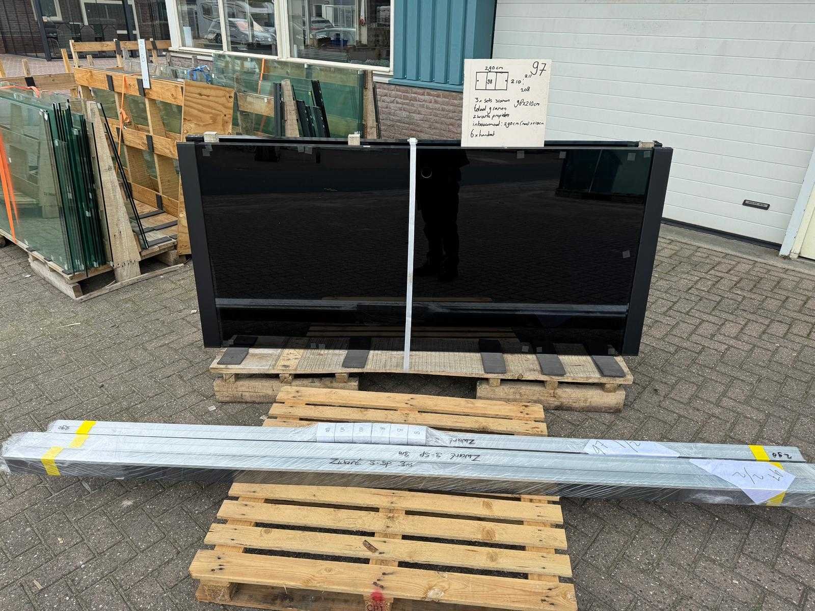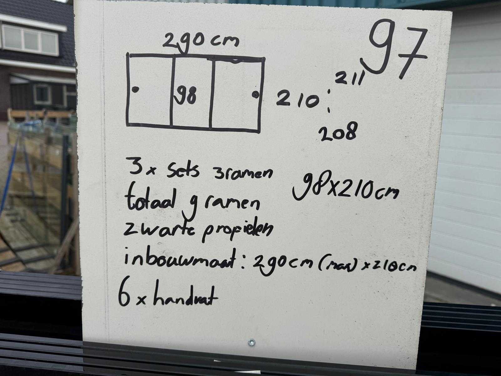 3 sets van 3 schuiframen – 99 cm x 210 cm, getint glas • Afmetingen per raam: breedte 98 cm, hoogte (dagmaat) 210 cm • Maximale breedte complete set: 290 cm • Totaal: 9 ramen (3 sets van 3 stuks) • Materiaal & kleur: zwart aluminium frame, getint glas • Inclusief: 3 boven- en 3 onder-rails met 3 sporen • 6 handgrepen • Conditie: partijhandel – kan lichte strepen of vegen bevatten • Verpakking: op pallet met glas • Opmerking: foto van overkapping is ter illustratie • Heftruck is aanwezig voor het afhalen Nee
