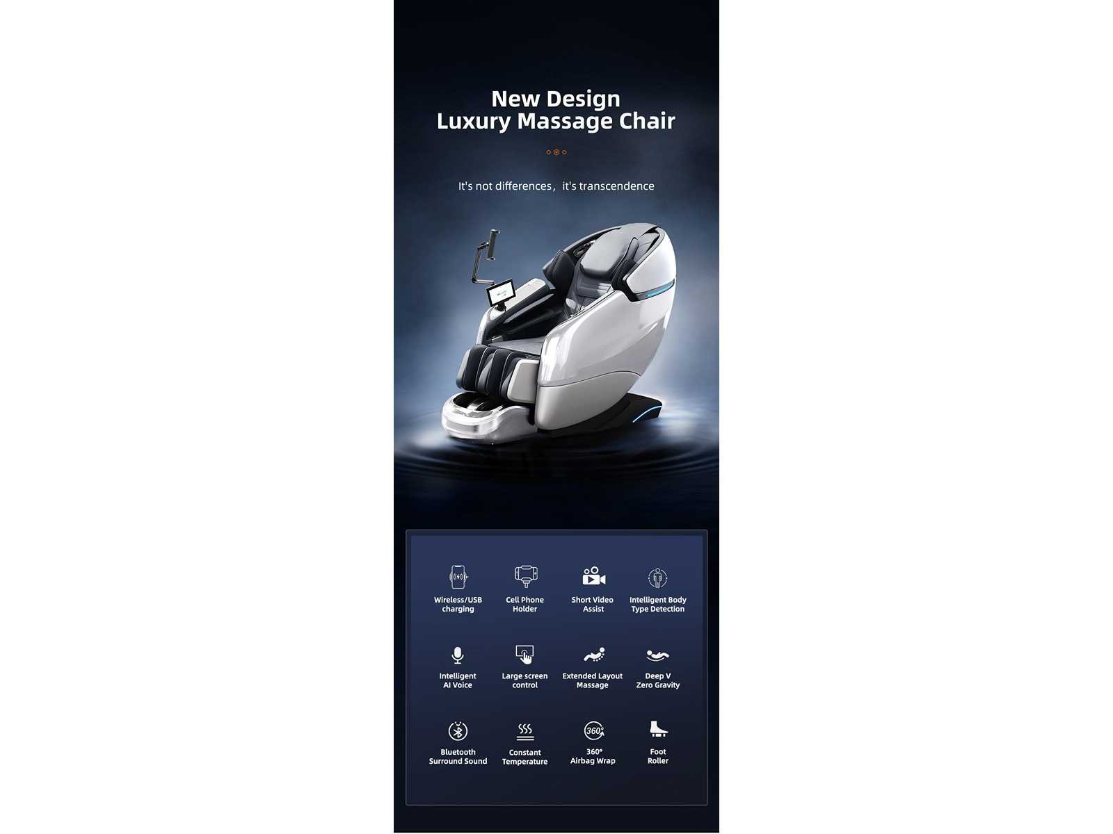 Zero‑gravity, Full body air‑pressure massage met instelbare intensiteit, SL‑track waarbij de manipulator van nek naar rug, taille en billen beweegt, schouderpositie‑detectie, been‑airbags en voetmassage, Bluetooth HIFI‑surroundsound, been‑ en rug verwarming, 12 automatische programma’s + 8 handmatige programma’s, Thaise stretch, AI‑spraakbesturing, sportauto‑stijl armsteun met snel knoppen + USB‑opladen, gezondheidsmonitoring (hartslag, bloeddruk), telefoon draadloos opladen, verbeterde kunststof beenstructuur, telefoon/iPad‑houder, afstandssensorfunctie (joystick‑knop voor het bedienen van je telefoon of iPad), scherm met touchscreen, pianolak‑afwerking, 220 V, afmeting verpakking 125X77X117CM, gewicht inclusief verpakking 82.5KG, Nieuw in doos. Nee Merk: LUMASEAT Model: Tasmanië Product type: Blauw Kleur: Blauw Gewicht: 83kg Lengte: 125cm Breedte: 77cm Hoogte: 117cm Materiaal: Kunstof
