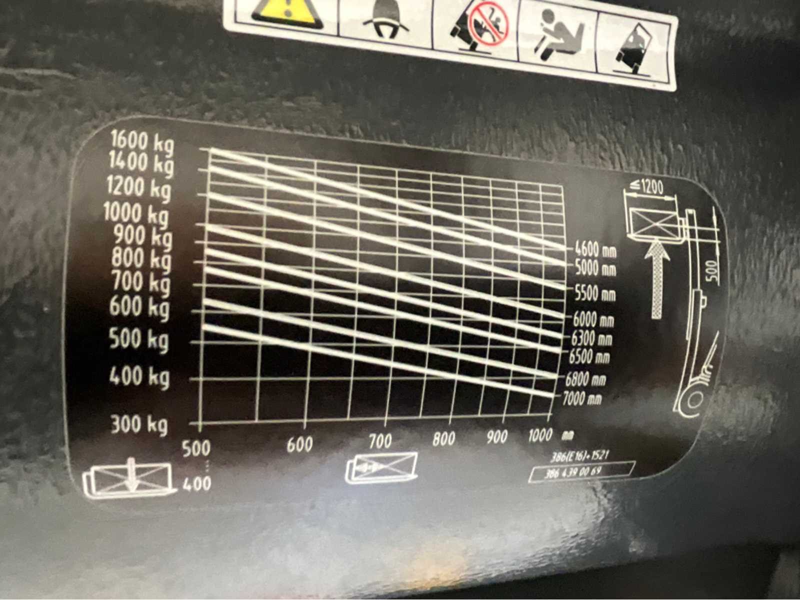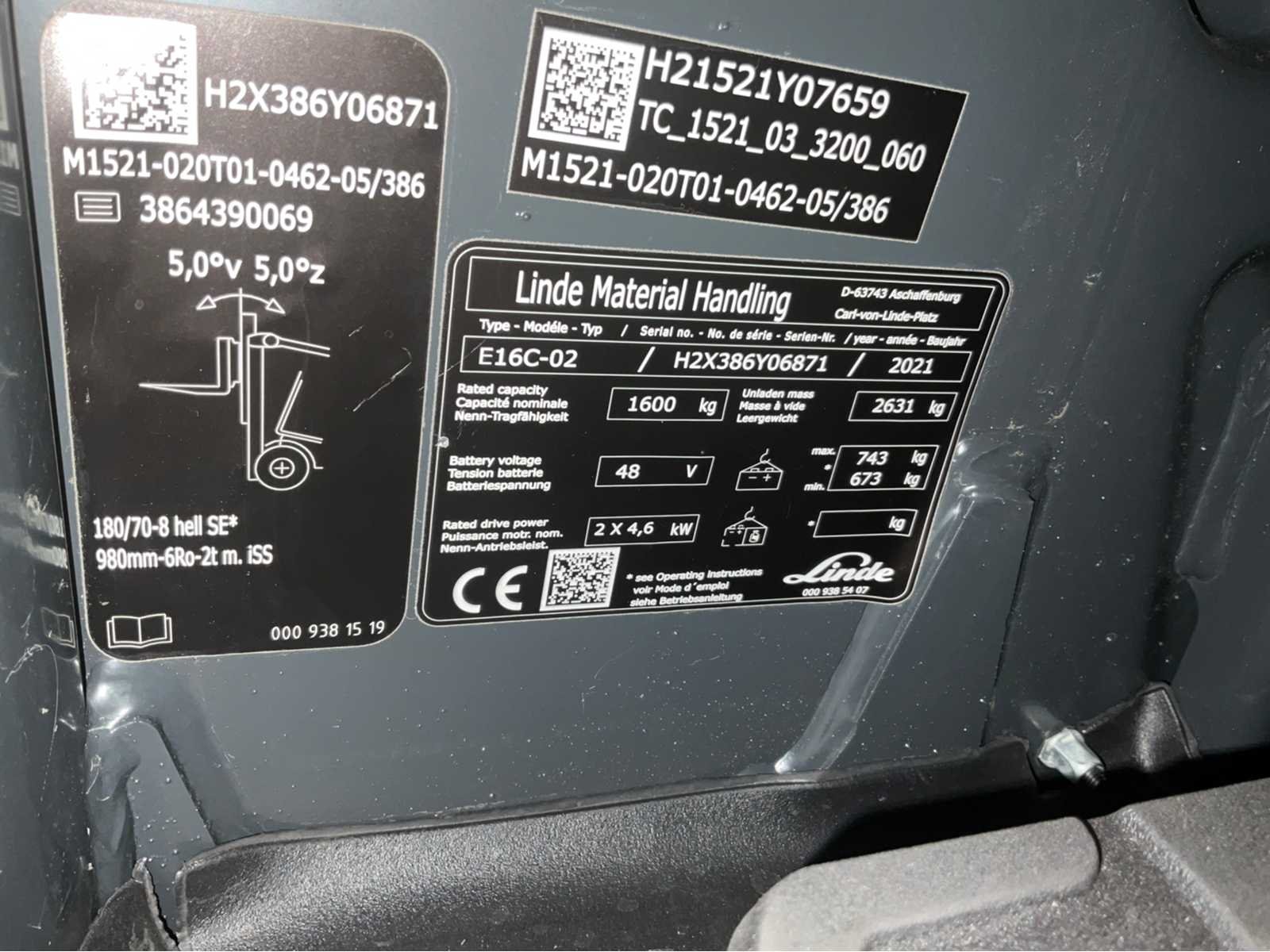 Bluespot Nee Merk: Linde Type: E16C-02 Serienummer: H2X386Y06871 Brandstof: Elektrisch Mast: triplex Soort band: Volrubber banden non marking Aantal wielen: 3 Afgelezen urenstand: 1704 Free-lift: true Side-shift: true Triple mast: true Eigen gewicht: 3374kg Hefvermogen: 1600kg Lepellengte: 1150mm Hefhoogte: 4700mm Vol rubber banden: true Minimale doorrijhoogte: 2140mm Totale afmeting L: 3100mm Totale afmeting Breedte: 1100mm