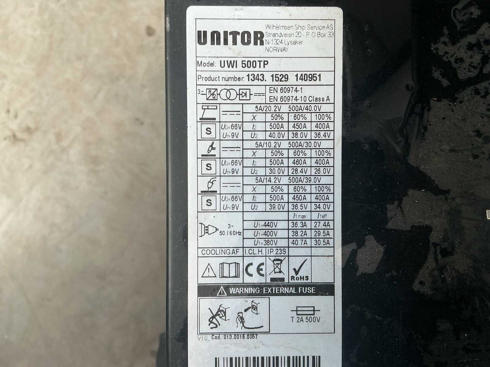 Nee Merk: Unitor Type: UWI 500TP Mig type: true Electrode type: true Ampère belasting: 500A Aansluiting: 400V