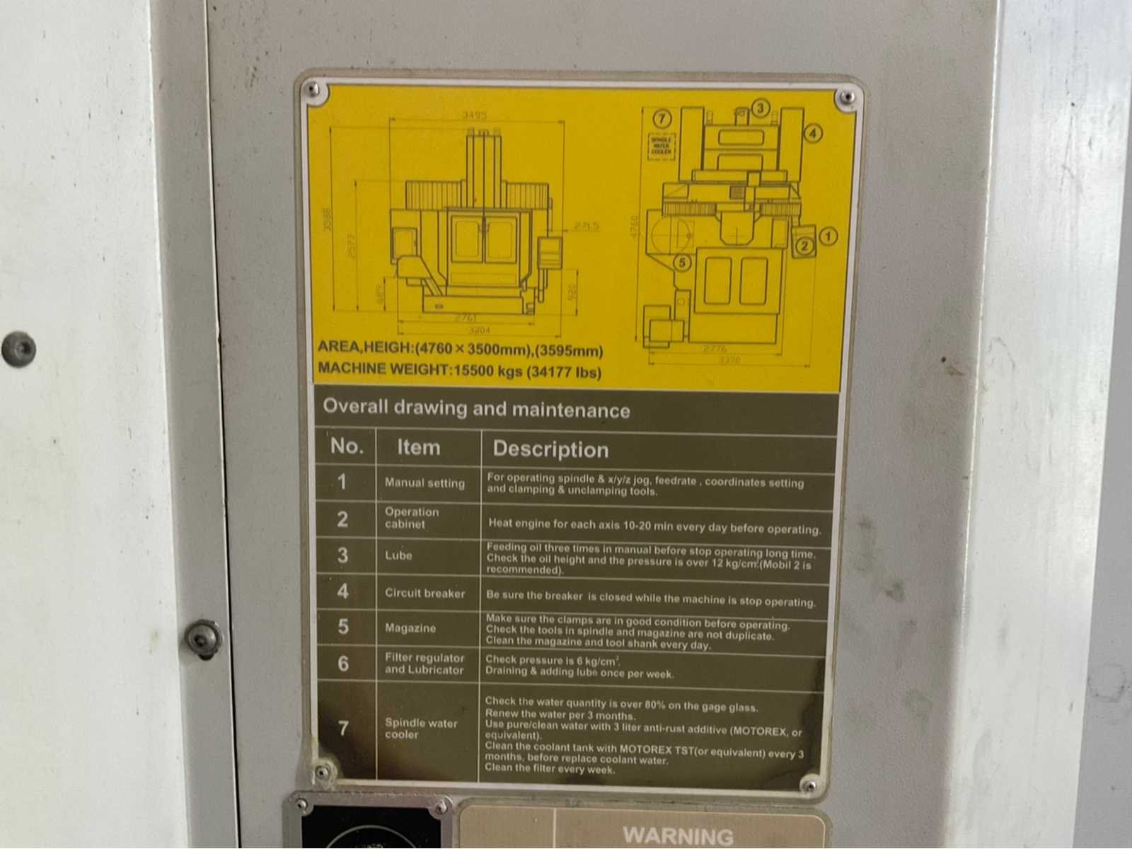 Maximale gereedschapsgewicht: 7kg, Maximale gereedschapslengte: 300mm. Voorzien van: (1x) 16-voudige gereedschapswisselaar, (1x) spanentransporteur, (1x) koel-/filterunit, (1x) spilkoeler, (1x) externe koelunit. No Merk: Quick Jet Type: Depo Jet AV 1612 Bouwjaar: 2003 Serienummer: 03112012 Opname iso: HSK-A80 Verplaatsing x-as: 1600mm Verplaatsing y-as: 1200mm Verplaatsing z-as: 700mm Snelheid van n =: 30rpm Snelheid tot n =: 14000rpm CNC-besturing, merk, type: Heidenhain iTNC 530 Spanentransporteur: true Koelmiddelpomp: true Werkstuk gewicht max.: 4000kg T-gleuf opspantafelafmeting B: 1300mm T-gleuf opspantafelafmeting L: 1800mm -assig: 3 Motorvermogen (kW): 25kW Aansluiting: 400V Totale afmeting Hoogte: 3610mm Totale afmeting Breedte: 3352mm Totale afmeting L: 4776mm Machinegewicht: 16800kg