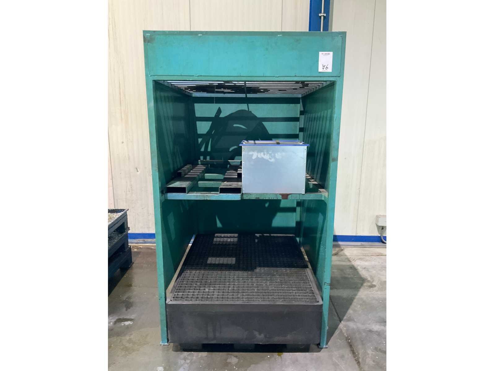 Bestaande uit: (1x) stalen kast 1130x1300x2000mm met kunststof lekbak, (3x) stalen lekbak 1780x1240x210mm, (1x) lekbak 1030x830x210mm. Nee