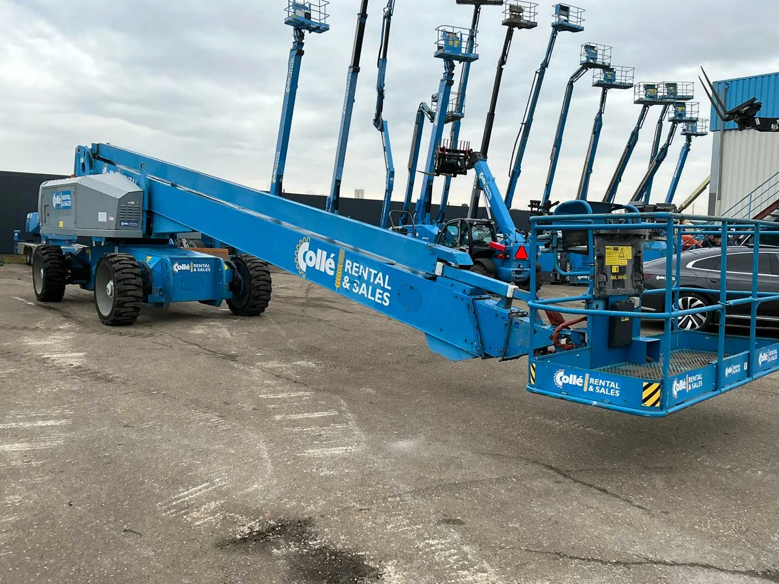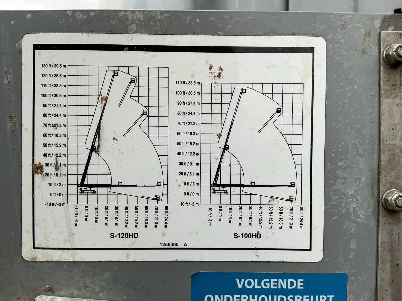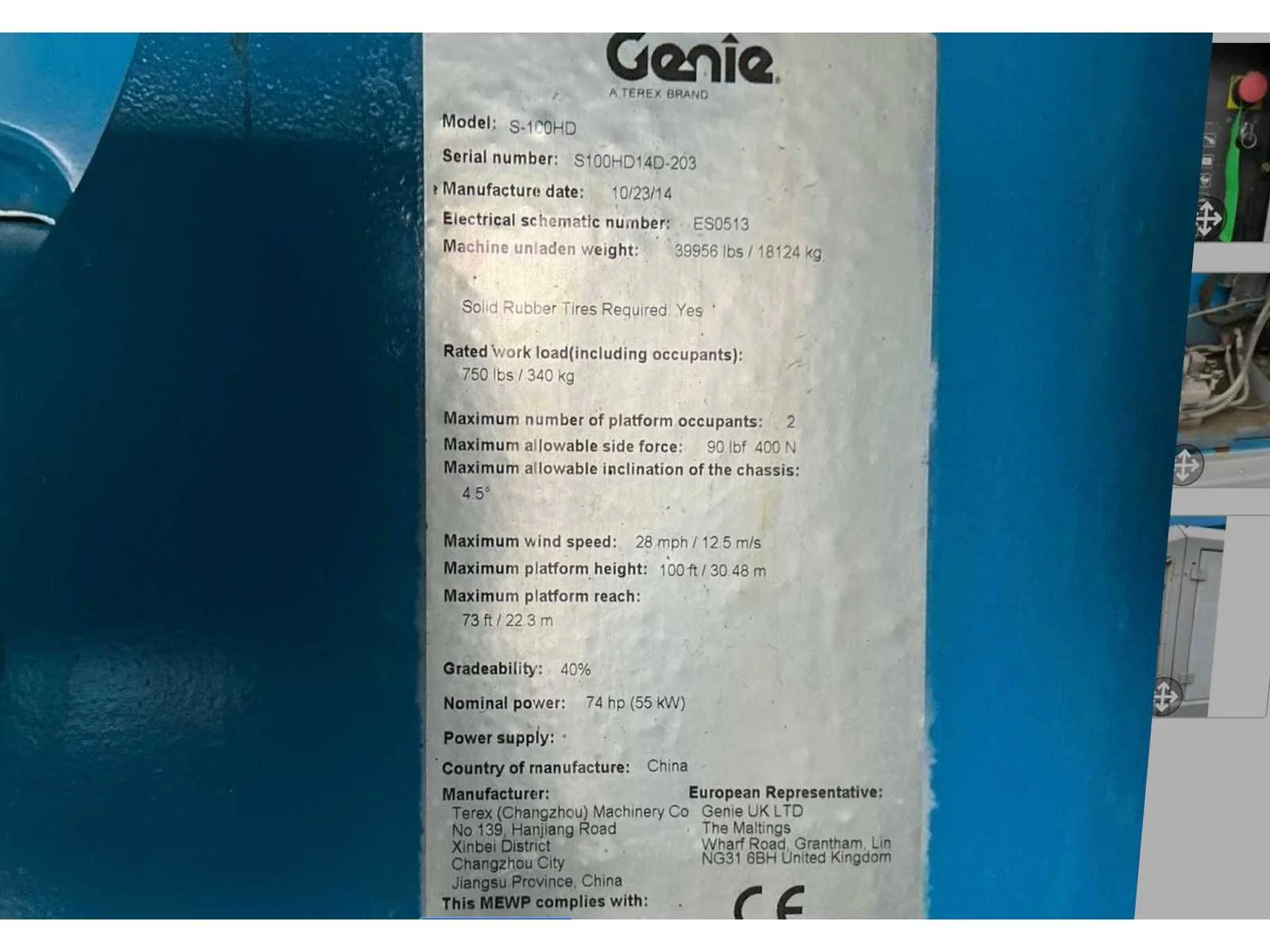 Ruwterrein; 4x4c4 aandrijving; platform vloerhoogte 30400 mm; draaicirkel 6600 mm; voorzien van 230 Volt stroom aansluiting kooi; voorzien van Deutz luchtgekoelde dieselmotor; kooibediening; wielen in breedte hydraulisch verstelbaar; working condition; Nee Merk: Genie Type: S-100HD 33 meter Bouwjaar: 2014 Serienummer: S100HD14D-203 Diesel: true Telescoop hoogwerker: true Werkhoogte: 32400mm Horizontale rijkwijdte: 22200mm Plateau afm. l: 1500mm Plateau afm. b: 750mm Platform capaciteit: 340kg Afgelezen urenstand: 814 Eigen gewicht: 18500kg Totale afmeting L: 13250mm Totale afmeting Breedte: 2500mm Totale afmeting Hoogte: 3200mm