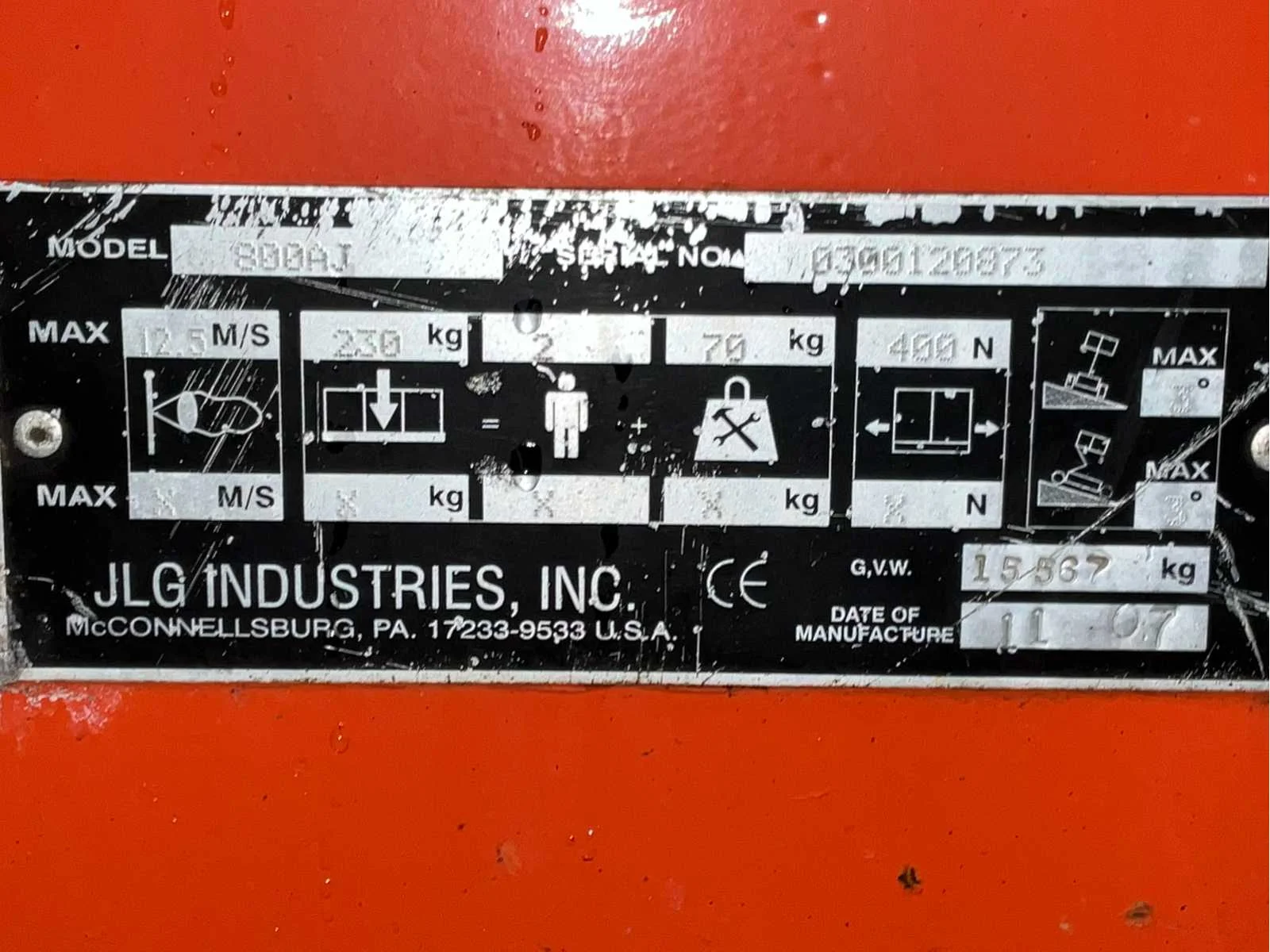 Ruwterrein; 4x4 aandrijving; platform vloerhoogte 24350 mm; knikbare jib; voorzien van 230 Volt stroom aansluiting kooi; brandstoftank inhoud 145 liter; Deutz dieselmotor 67 Pk; kooibediening; licht schade kap; working condition; Nee Merk: JLG Type: 800AJ Bouwjaar: 2007 Serienummer: 0300120873 Diesel: true Motorvermogen (kW): 50kW Telescoop hoogwerker: true Knikarm hoogwerker: true Werkhoogte: 26350mm Horizontale rijkwijdte: 15800mm Plateau afm. l: 2400mm Plateau afm. b: 900mm Platform capaciteit: 250kg Afgelezen urenstand: 5551 Eigen gewicht: 15750kg Totale afmeting L: 11150mm Totale afmeting Breedte: 2500mm Totale afmeting Hoogte: 2500mm Leveringsvoorwaarden: G