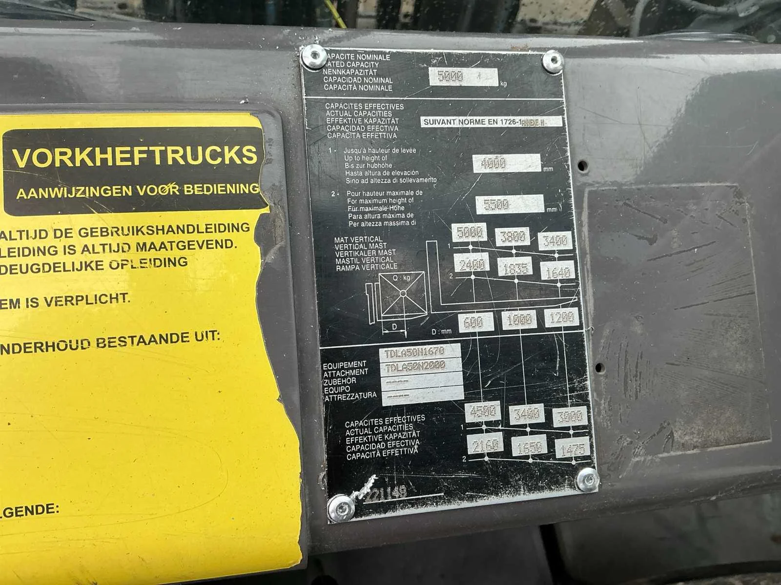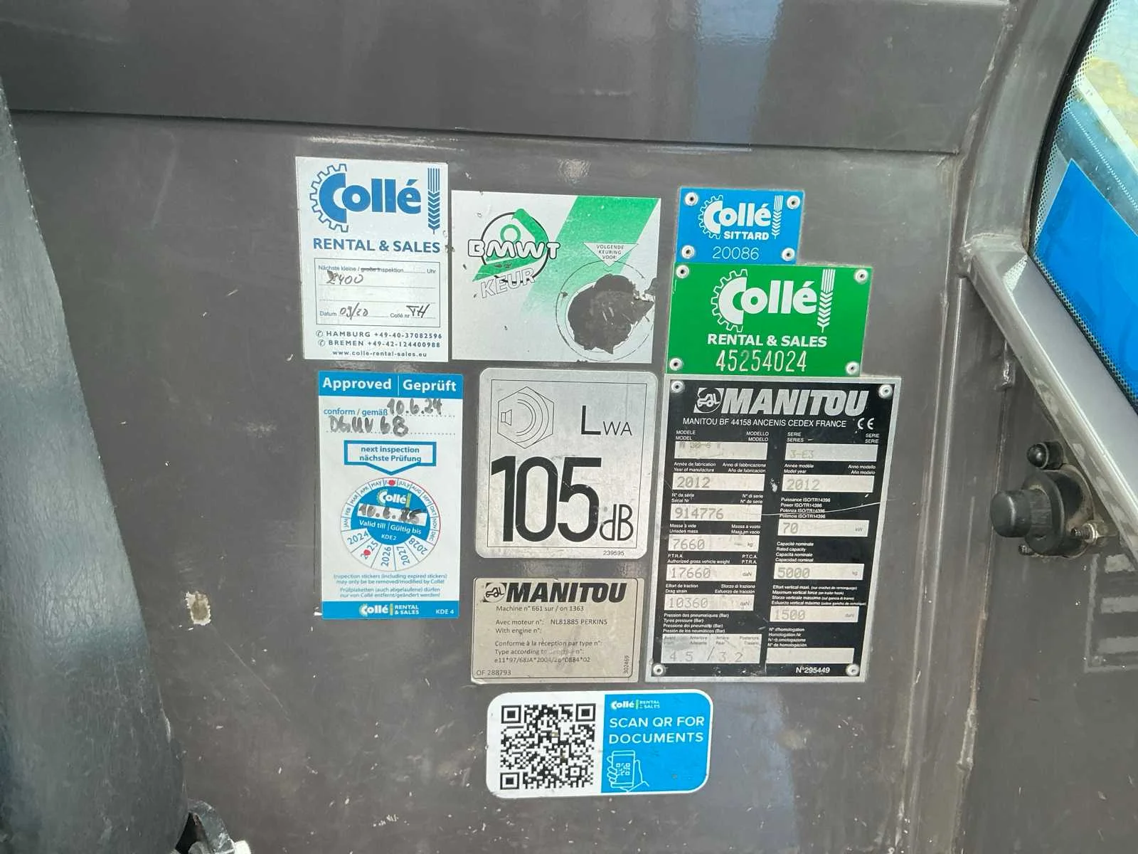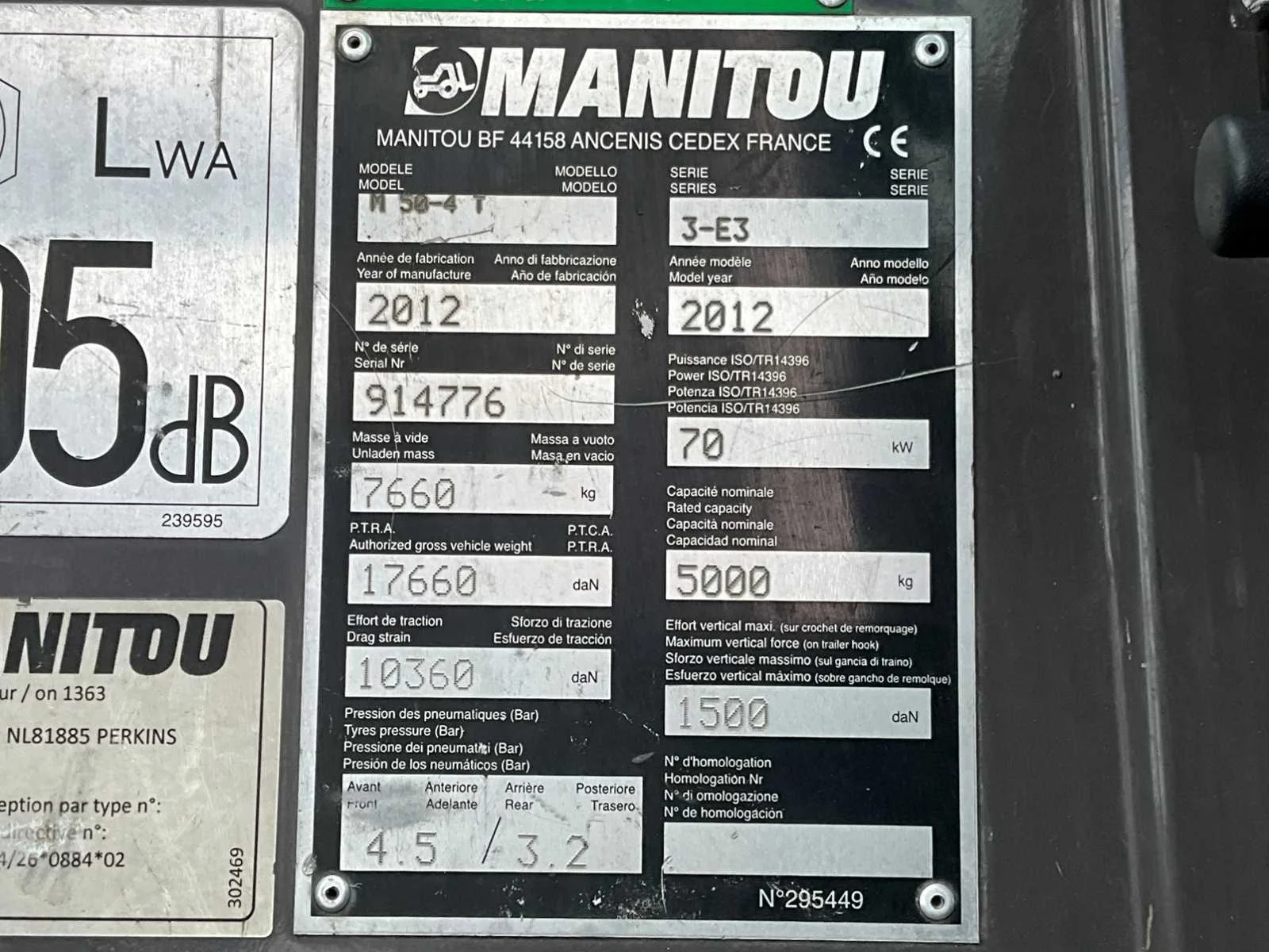4x4 aandrijving; gesloten cabine; maximale breedte over de vorken 2050 mm; vorkbreedte 150 mm; werkverlichting voor; glas urenstandmeter defect; working condition; Nee Merk: Manitou Type: M50-4 T Bouwjaar: 2012 Serienummer: 914776 Brandstof: diesel Mast: Triple Soort band: Luchtbanden Aantal wielen: 4 Afgelezen urenstand: 2772 Ruw terrein: true Free-lift: true Side-shift: true Triple mast: true Eigen gewicht: 7800kg Hefvermogen: 5000kg Lepellengte: 1800mm Max. hefhoogte: 5500mm Luchtbanden: true Minimale doorrijhoogte: 2950mm Totale afmeting L: 5800mm Totale afmeting Breedte: 2200mm Totale afmeting Hoogte: 2950mm