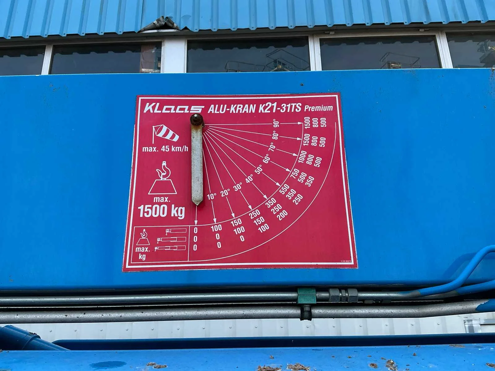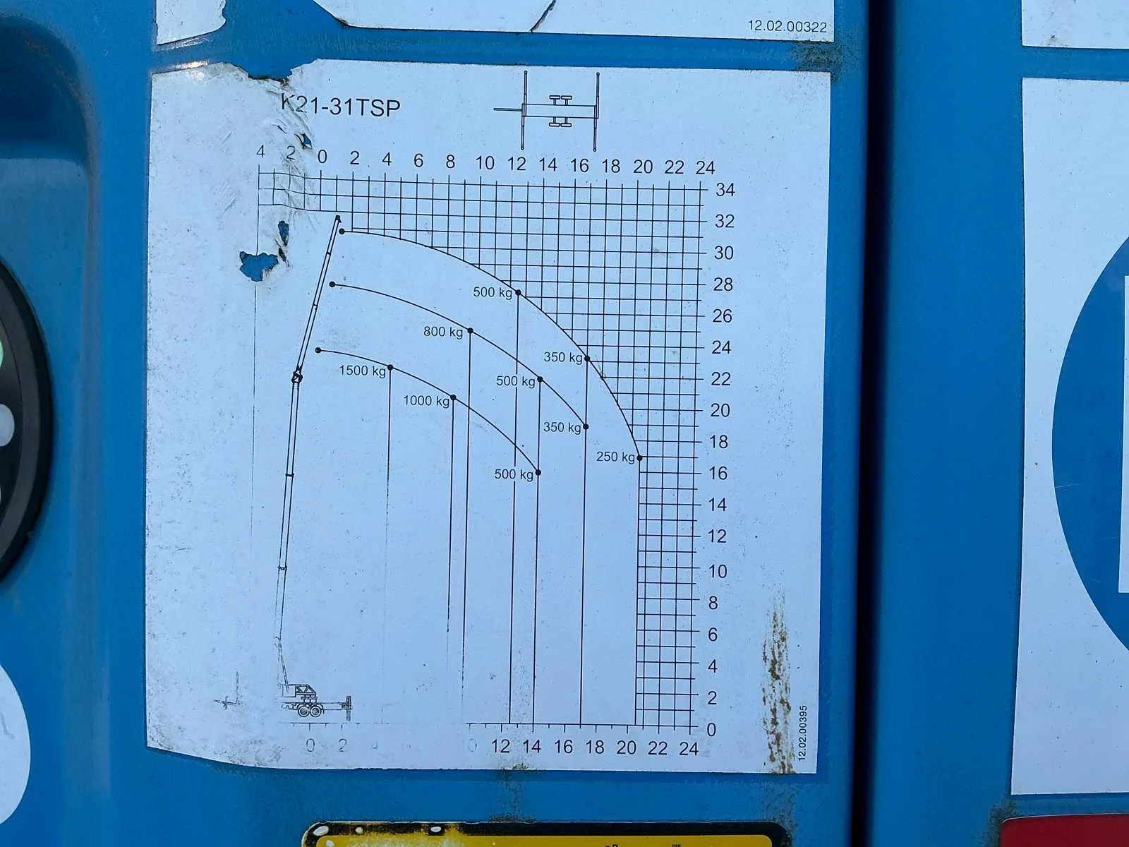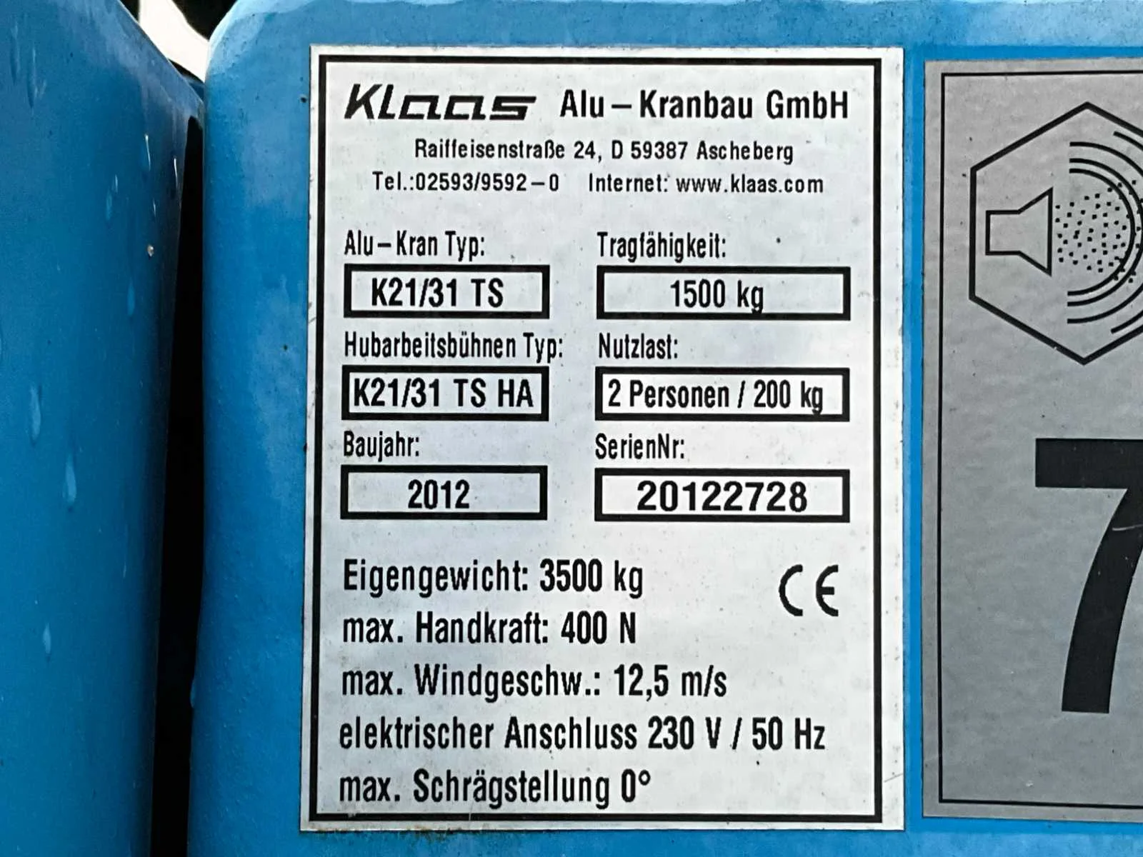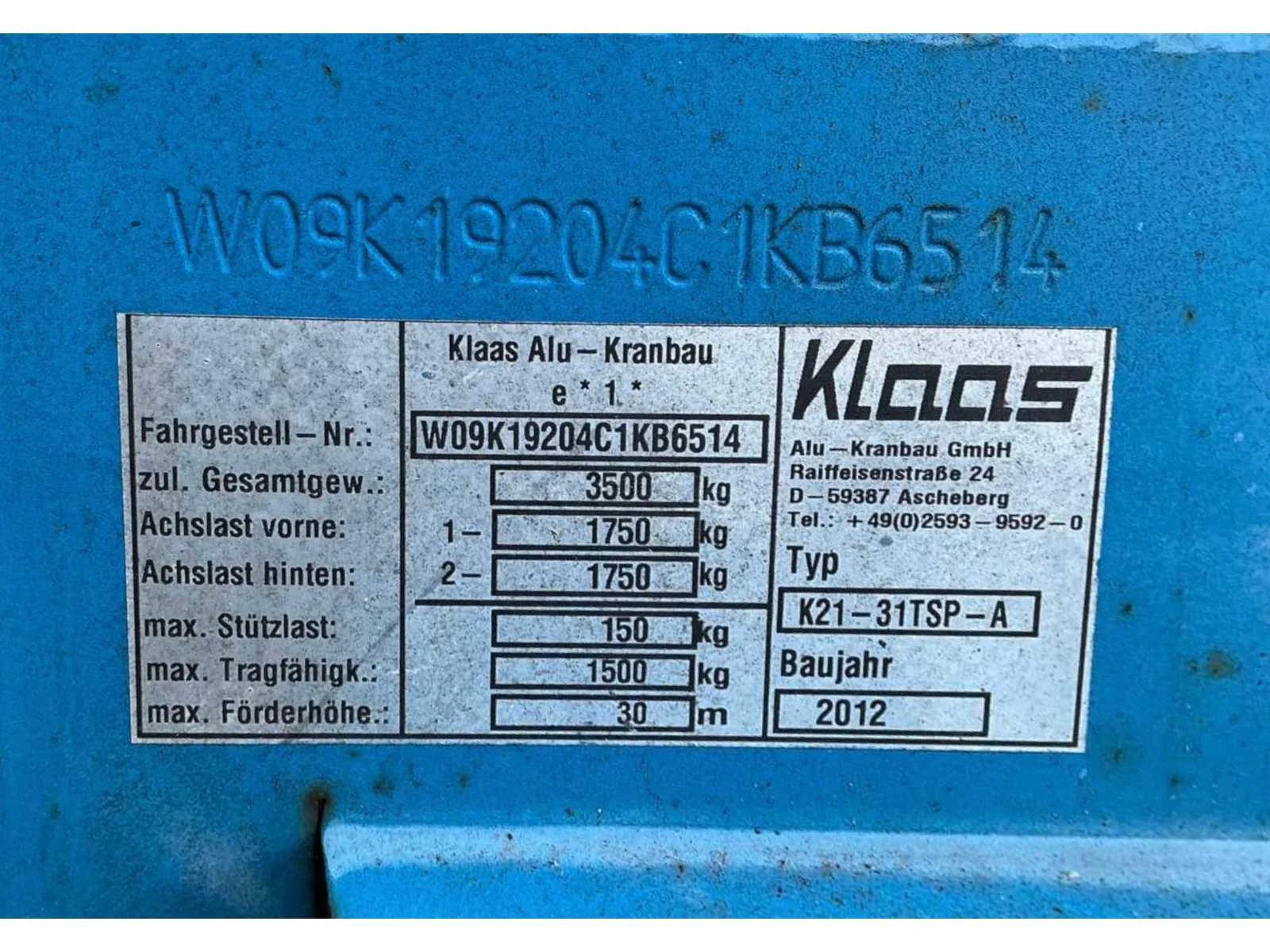 Aluminium kraan; 4x hydraulische uitschuifbare stempelvoet; hijsvermogen 1500 kg; eigen gewicht 3500 kg; nuttige last 200 kg; reikwijdte 20500 mm; driedelige uitschuifbare jip; staalkabellier; hijshaak; stempelvlak 2720x5200 mm; aangedreven door Yanmar dieselmotor; radiografische bediening; LED werkverlichting; neuswiel; oplooprem; working condition; Nee Merk: Klaas Type: Alu Kran K21-31TS Premium Bouwjaar: 2012 Serienummer: 20122728/W09K19204C1KB6514 Kenteken: 38-WJ-XL Eigen gewicht: 3500kg Aantal assen: 2 Max. hijshoogte: 31m Met radiografische afstandsbediening: true Afgelezen urenstand: 2522hr Totale afmeting Breedte: 2350mm Max. hijscapaciteit: 1500kg Totale afmeting Hoogte: 2500mm Totale afmeting L: 9300mm