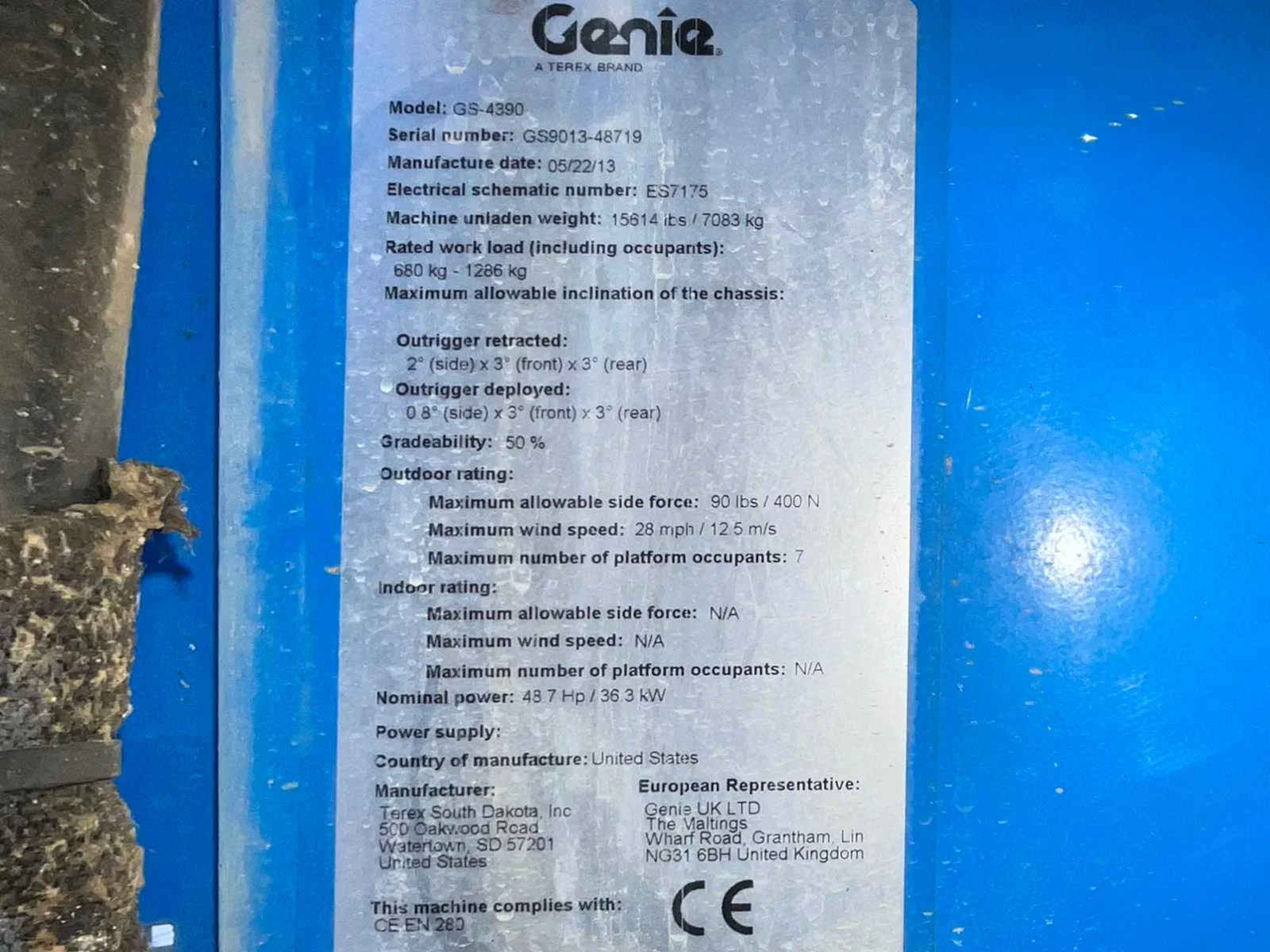 4x4 aandrijving; ruw terrein; platform vloerhoogte 16150 mm; uitschuifbaar platform afmeting circa 5340x1800 mm; kooibediening; transport hoogte 2500 mm; aangedreven door Deutz dieselmotor; capaciteit brandstoftank 75 liter; working condition Nee Merk: Genie Type: GS-4390RT Bouwjaar: 2013 Serienummer: GS9013-48719 Diesel: true Schaarhoogwerker: true Werkhoogte: 18150mm Plateau afm. l: 3980mm Plateau afm. b: 1800mm Platform capaciteit: 680kg Afgelezen urenstand: 2505 Eigen gewicht: 7200kg Totale afmeting L: 4900mm Totale afmeting Breedte: 2400mm Totale afmeting Hoogte: 3000mm
