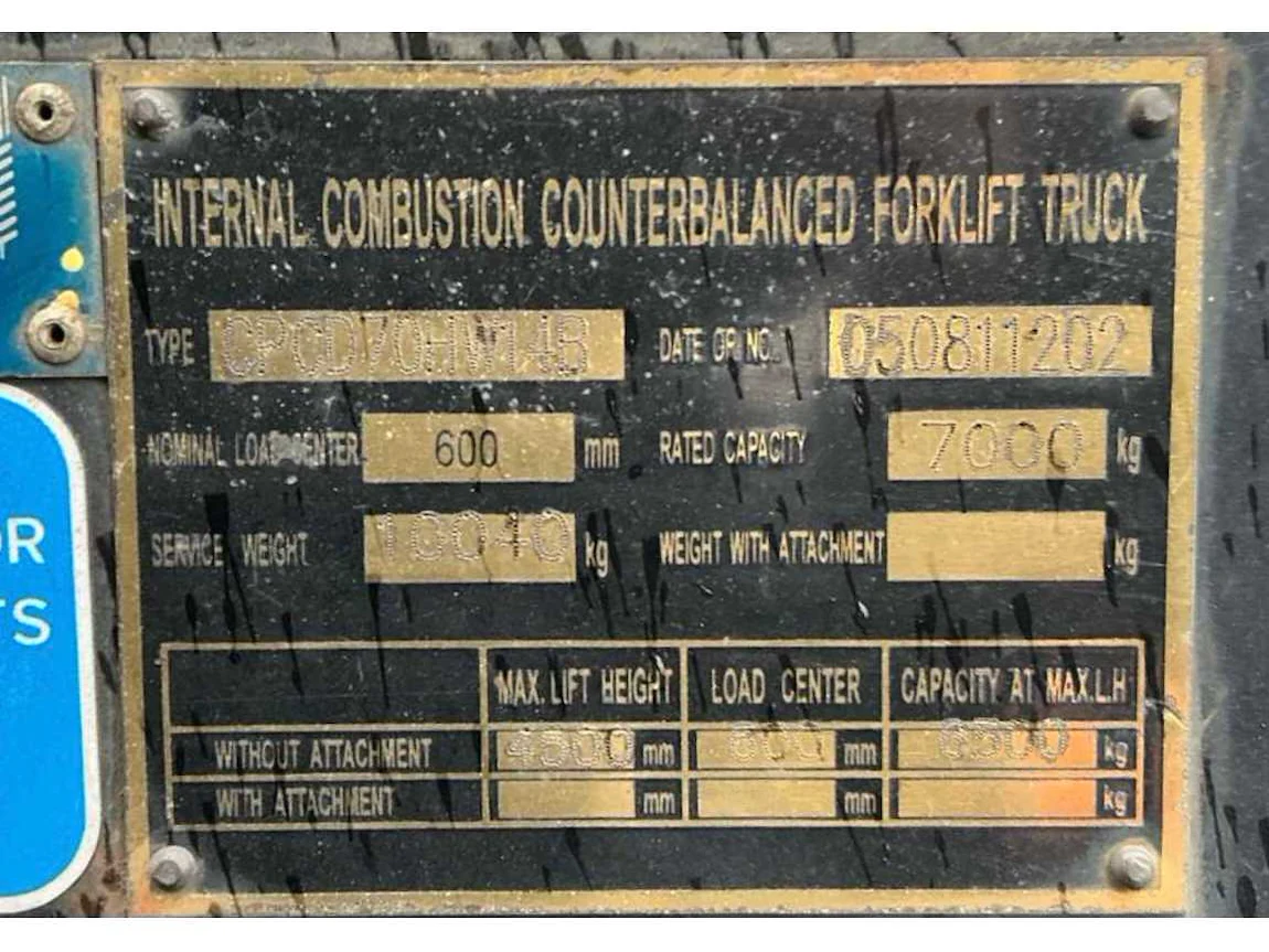 Voorzien van Izusu dieselmotor; working condition; Nee Type: CPCD70HW148 Serienummer: 050811202 Brandstof: Diesel Mast: Triple Aantal wielen: 4 Afgelezen urenstand: 61 Free-lift: true Side-shift: true Hefvermogen: 7000kg Lepellengte: 1170mm Min. hefhoogte: 10mm Max. hefhoogte: 4500mm Minimale doorrijhoogte: 2850mm Totale afmeting L: 5200mm Totale afmeting Breedte: 2000mm Totale afmeting Hoogte: 2850mm Diesel: true