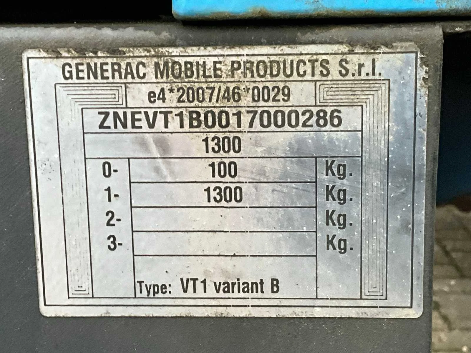 Omschrijving: Dieselmotor en werking op accu; Linz alternator; 4x1000 Watt Gewiss lampen; 230 Volt; maximale masthoogte 9 meter; afgelezen urenstand 3847 uren; lichtsensor; tijdschakelaar; aansluitbaar op netstroom; heftruck vorksleuven; 4x stabilisator stempels; ingebouwde brandstoftank; trekboom, kiepbaar; neuswiel; working condition; Nee Merk: Generac Mobile Products Type: VT-Hybrid Bouwjaar: 2017 Chassisnummer: ZNEVT1B0017000286 Aantal assen: 1 Ledig gewicht: 1200kg Laadvermogen: 100kg Datum eerste toelating: 2017-04-28 Datum eerste toelating (NL): 2017-04-28 Kenteken: 79-WR-DR Hoogte: 240cm Lengte: 344cm Breedte: 160cm Self drive export possible : true