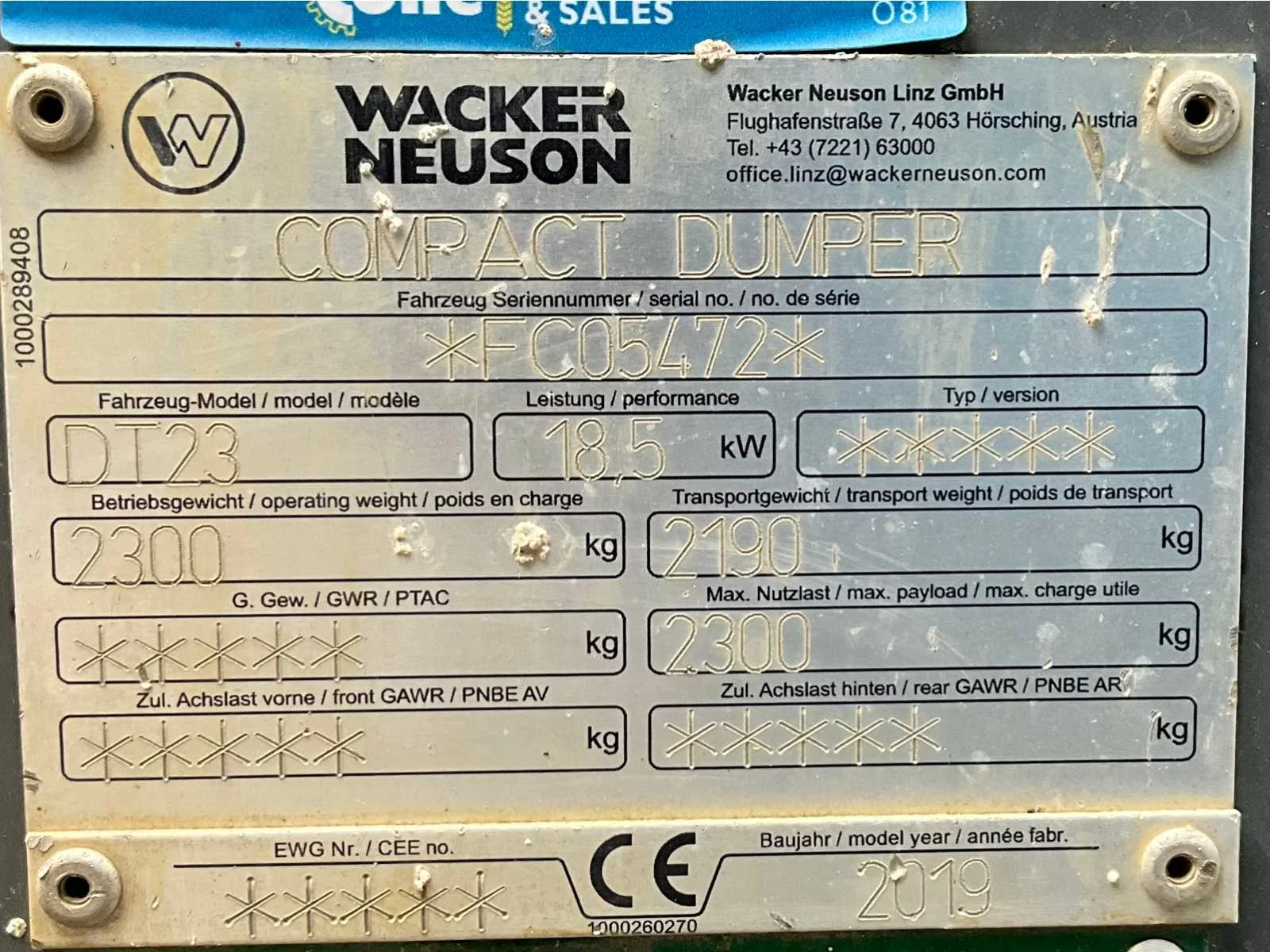 Swivel bucket; draaihoek 180° zwenkbare kipbak; bakinhoud gestreken 1,1 m3; bakinhoud opgehoopt 1,4 m3; maximale uitkiephoogte 545 mm; rupsbreedte 270 mm; neerklapbare beugel; maximale inhoud brandstoftank 26 liter; transporthoogte 2200 mm; gaskabel / gasbediening afgebroken; dynamo defect/laad niet op; Nee Merk: Wacker-Neuson Type: DT23 Serienummer: FC05472 Bouwjaar: 2019 Merk motor: Kubota V1505 Motorvermogen (kW): 18.5kW Aantal cilinders: 4 Brandstof: Diesel Laadvermogen: 2300kg Afgelezen urenstand: 469 Eigen gewicht: 2285kg Totale afmeting L: 3500mm Totale afmeting Breedte: 1350mm Totale afmeting Hoogte: 2450mm