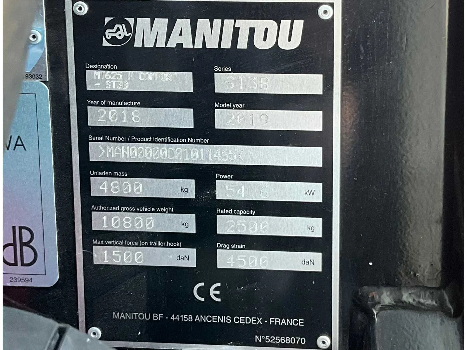 Ruwterrein; 4x4; aangedreven door Kubota 4 cilinder dieselmotor; Tier5; 75 Pk; maximale reikwijdte 3400 mm; maximale breedte over de vorken circa 1030 mm; vorkbreedte 1000 mm; vorkenbord; 2x extra hydraulische aansluiting; rijverlichting; werkverlichting; maximale inhoud brandstoftank 60 liter; Ergonomische joystick; Let op! versnellingsbak defect; kan niet rijden Nee Merk: Manitou Type: MT625 H Comfort ST3B Bouwjaar: 2018 Serienummer: MAN00000C01011465 Motorvermogen (kW): 55.4kW Hefvermogen: 2500kg Hefhoogte: 5850mm Cabine: true Vierwielaandrijving 4x4: true Lepellengte: 1200mm Luchtbanden: true Afgelezen urenstand: 1295 Eigen gewicht: 4800kg Totale afmeting L: 5400mm Totale afmeting Breedte: 1900mm Totale afmeting Hoogte: 2000mm