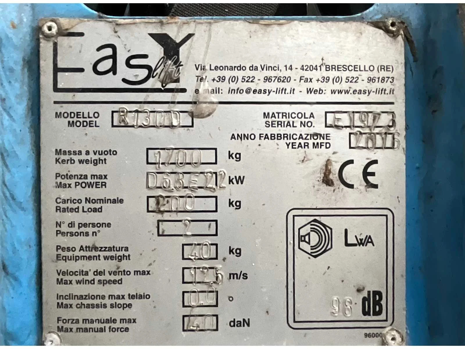Rupsbreedte 180 mm; platform vloerhoogte 10200 mm; capaciteit 2 personen; 4x neerklapbare stempelvoet; 4x kunststof stempelkussen / platen; vloer oppervlakte stempelvoet 2600x2600 mm; 230 Volt kooi stroom aansluiting; elektrisch 230 Volt; aangedreven door Hatz dieselmotor; Nee Merk: Easy Lift Type: R130D Bouwjaar: 2016 Serienummer: E1973 Diesel: true Telescoop hoogwerker: true Knikarm hoogwerker: true Werkhoogte: 12200mm Horizontale rijkwijdte: 6500mm Plateau afm. l: 1100mm Plateau afm. b: 700mm Platform capaciteit: 200kg Afgelezen urenstand: 4972 Eigen gewicht: 1600kg Totale afmeting L: 4250mm Totale afmeting Breedte: 1100mm Totale afmeting Hoogte: 2000mm