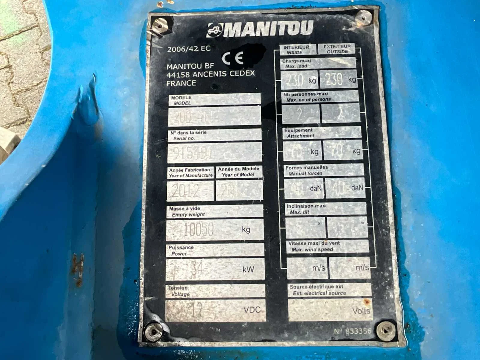 Ruwterrein; 4x4x4 aandrijving; platform vloerhoogte 18280 mm; jib; Kubota 4 cilinder dieselmotor 45 Pk; kooibediening; urenstand niet afleesbaar; defect; Nee Merk: Manitou Type: 200ATJ Bouwjaar: 2012 Serienummer: 915491 Diesel: true Motorvermogen (kW): 34kW Telescoop hoogwerker: true Knikarm hoogwerker: true Werkhoogte: 20280mm Horizontale rijkwijdte: 12000mm Plateau afm. l: 2100mm Plateau afm. b: 800mm Platform capaciteit: 230kg Eigen gewicht: 10250kg Totale afmeting L: 8600mm Totale afmeting Breedte: 2500mm Totale afmeting Hoogte: 2800mm