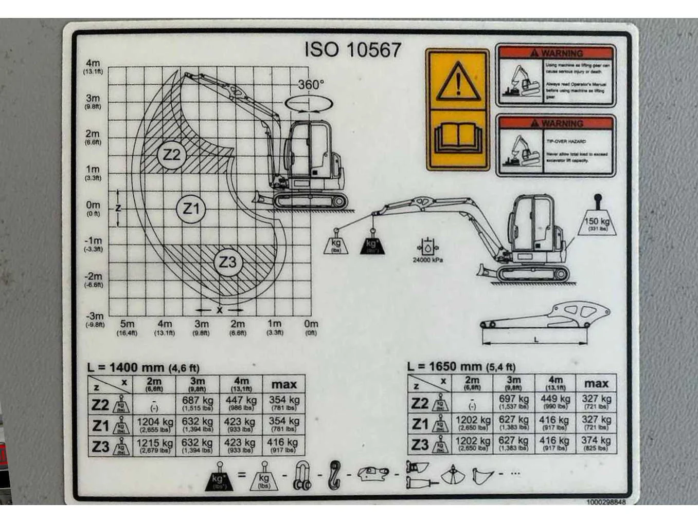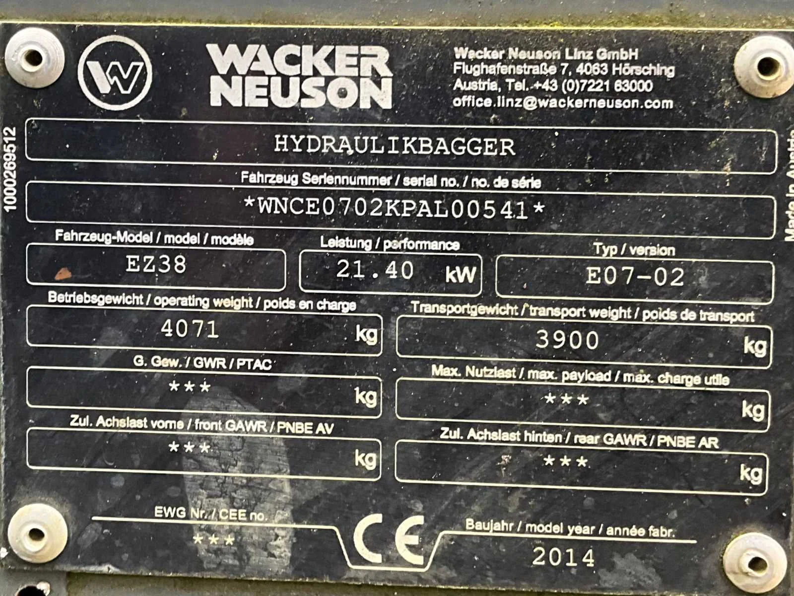 Gesloten cabine; knikarm; dozerblad breedte 1750 mm; 5x hydrauliek aansluiting; snelkoppeling; werkverlichting; signalisatielamp; working condition; Nee Merk: Wacker Neuson Type: EZ38 Bouwjaar: 2014 Serienummer: WNCE0702KPAL00541 Merk motor: Yanmar Motorvermogen (kW): 21.4kW Aantal cilinders: 3 Brandstof: Diesel Max. werkbereik: 5150mm Max. graafdiepte: 3100mm Rups breedte: 300mm Afgelezen urenstand: 827 Eigen gewicht: 4200kg Totale afmeting L: 4900mm Totale afmeting Breedte: 1750mm Totale afmeting Hoogte: 2700mm